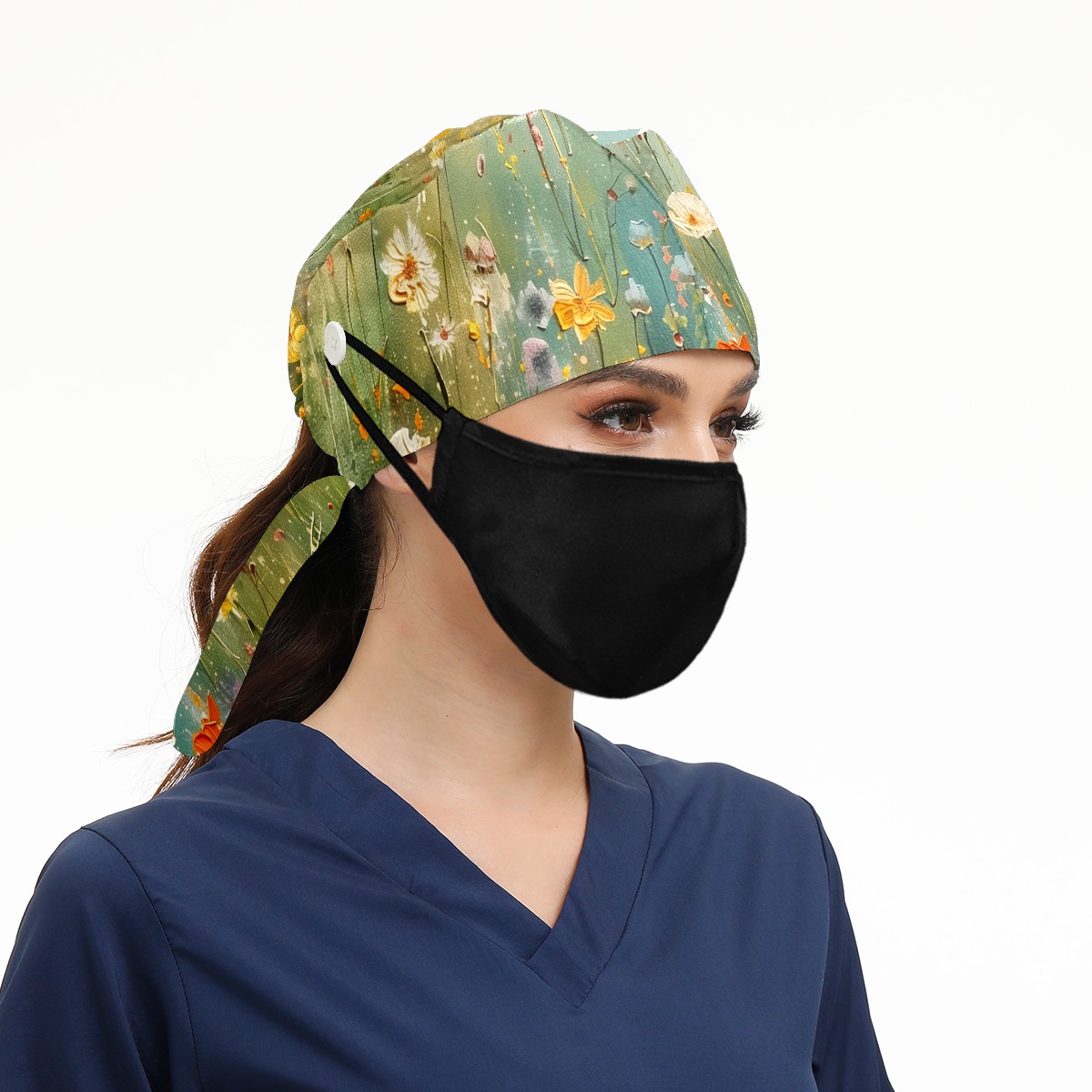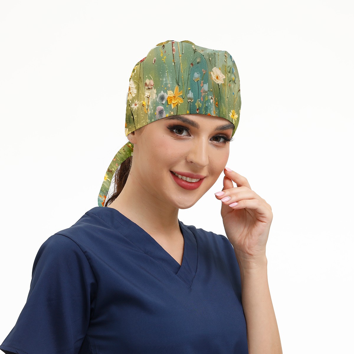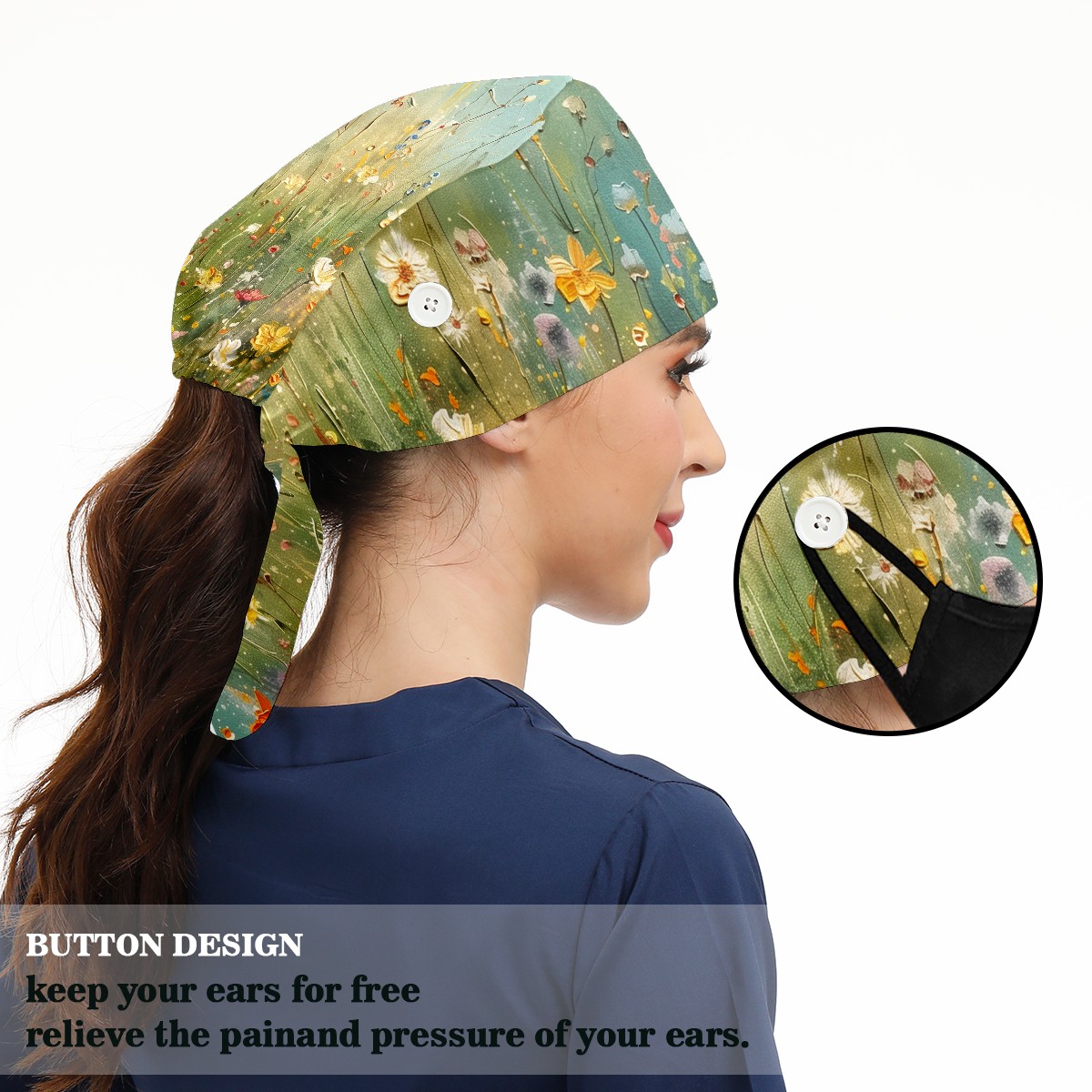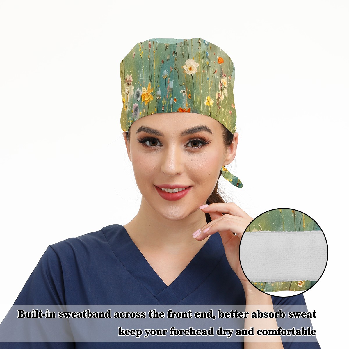 Working Caps with Button & Sweatband Satin Lined Cotton Adjustable Nurse Hats Elastic Band Scrub Cap Surgeon Hat Flowers Plants