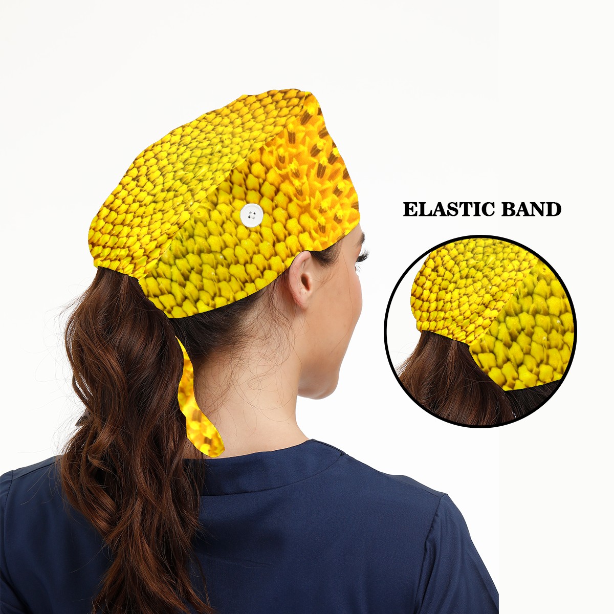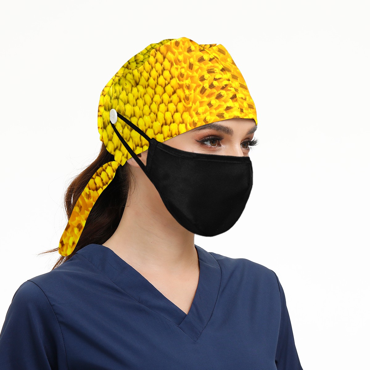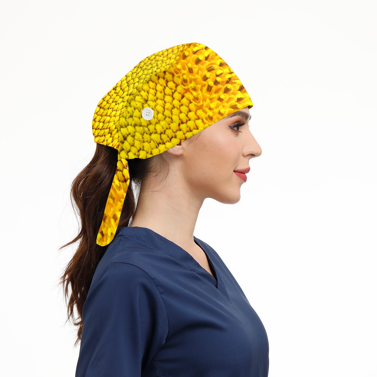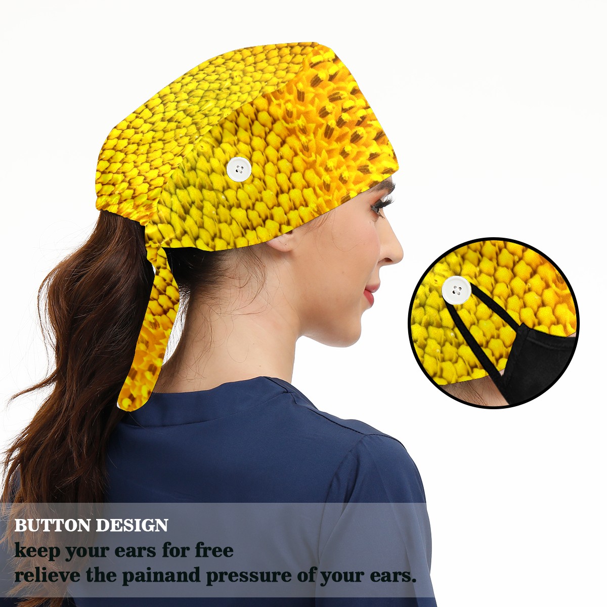 Working Caps with Button & Sweatband Satin Lined Cotton Adjustable Nurse Hats Elastic Band Scrub Cap Surgeon Hat Sunflower Yellow