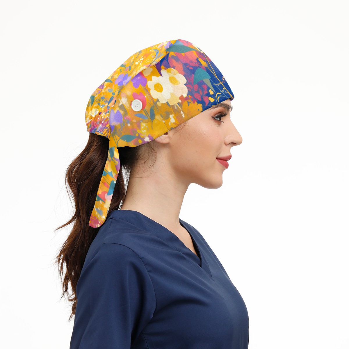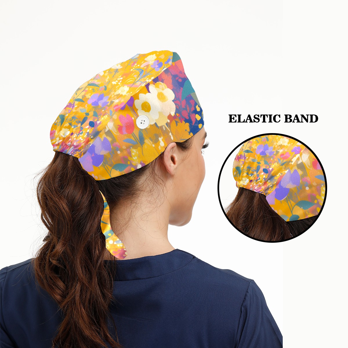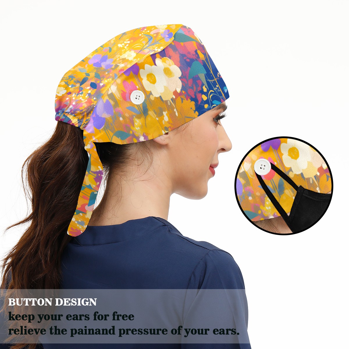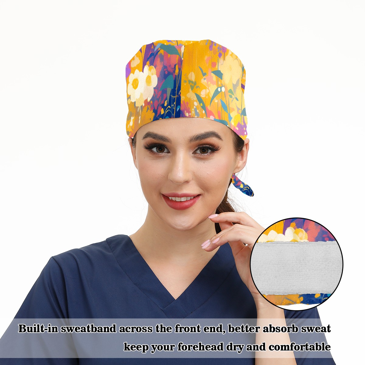 Working Caps with Button & Sweatband Satin Lined Cotton Adjustable Nurse Hats Elastic Band Scrub Cap Surgeon Hat Wildflower