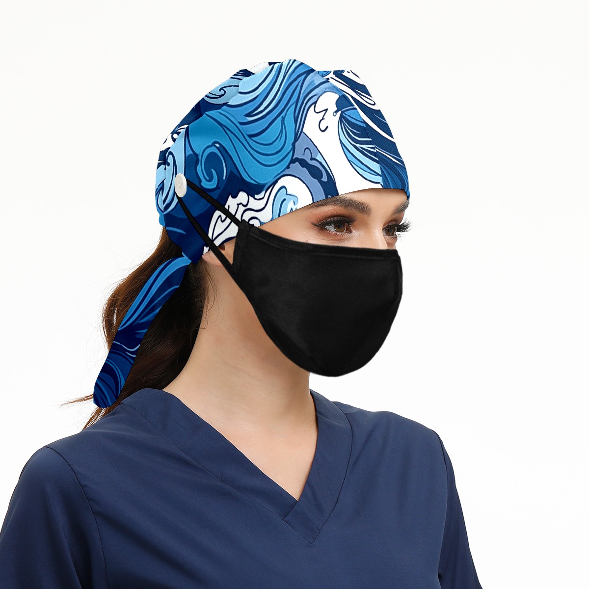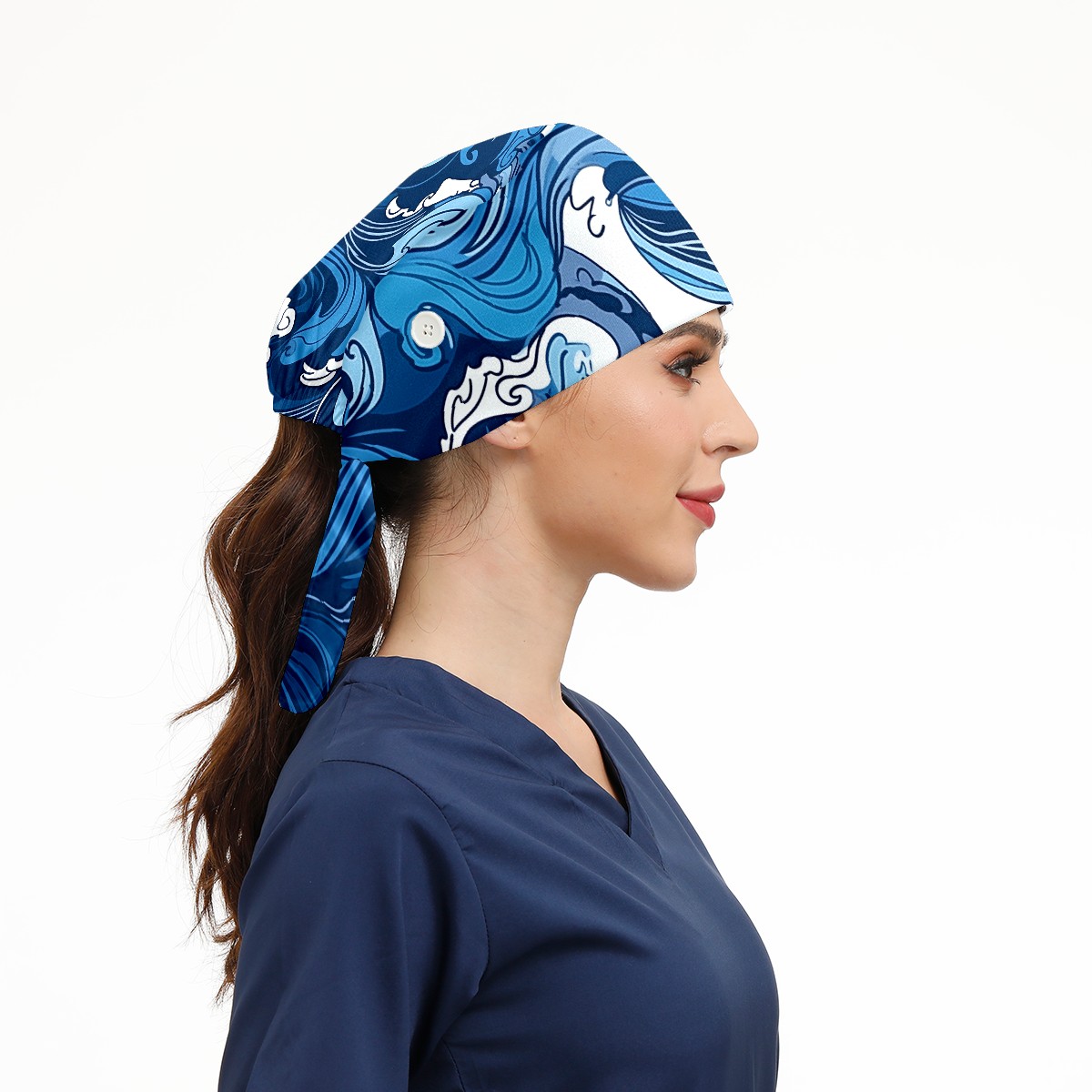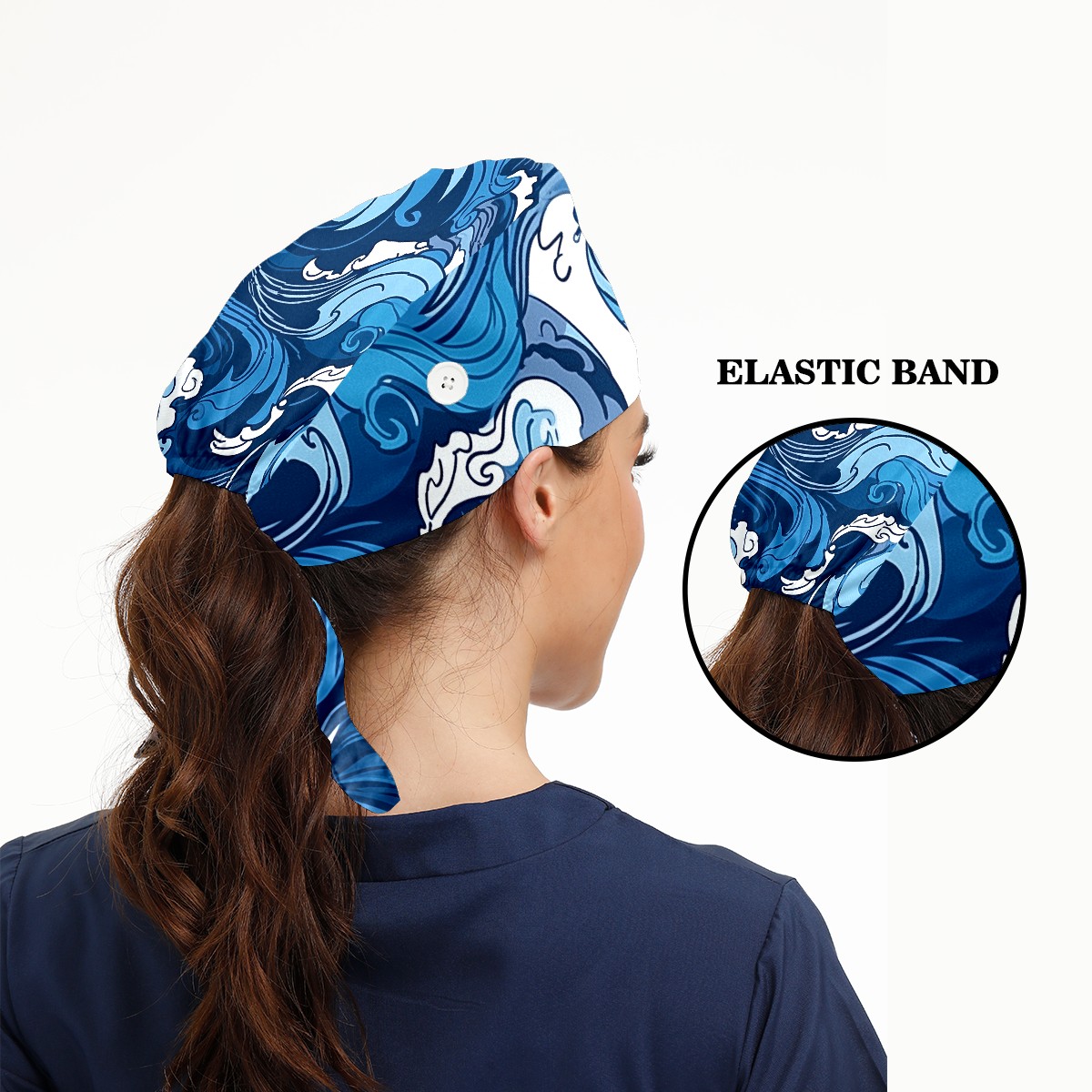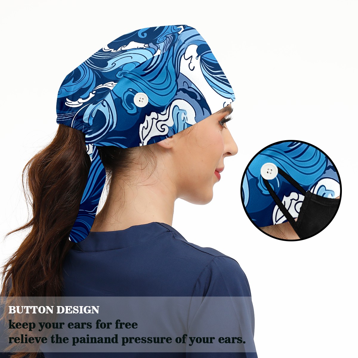 Working Caps with Button & Sweatband Satin Lined Cotton Adjustable Nurse Hats Elastic Band Scrub Cap Surgeon Hat Sea Wave