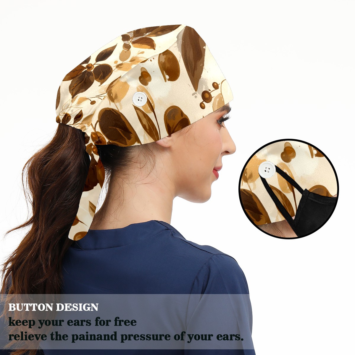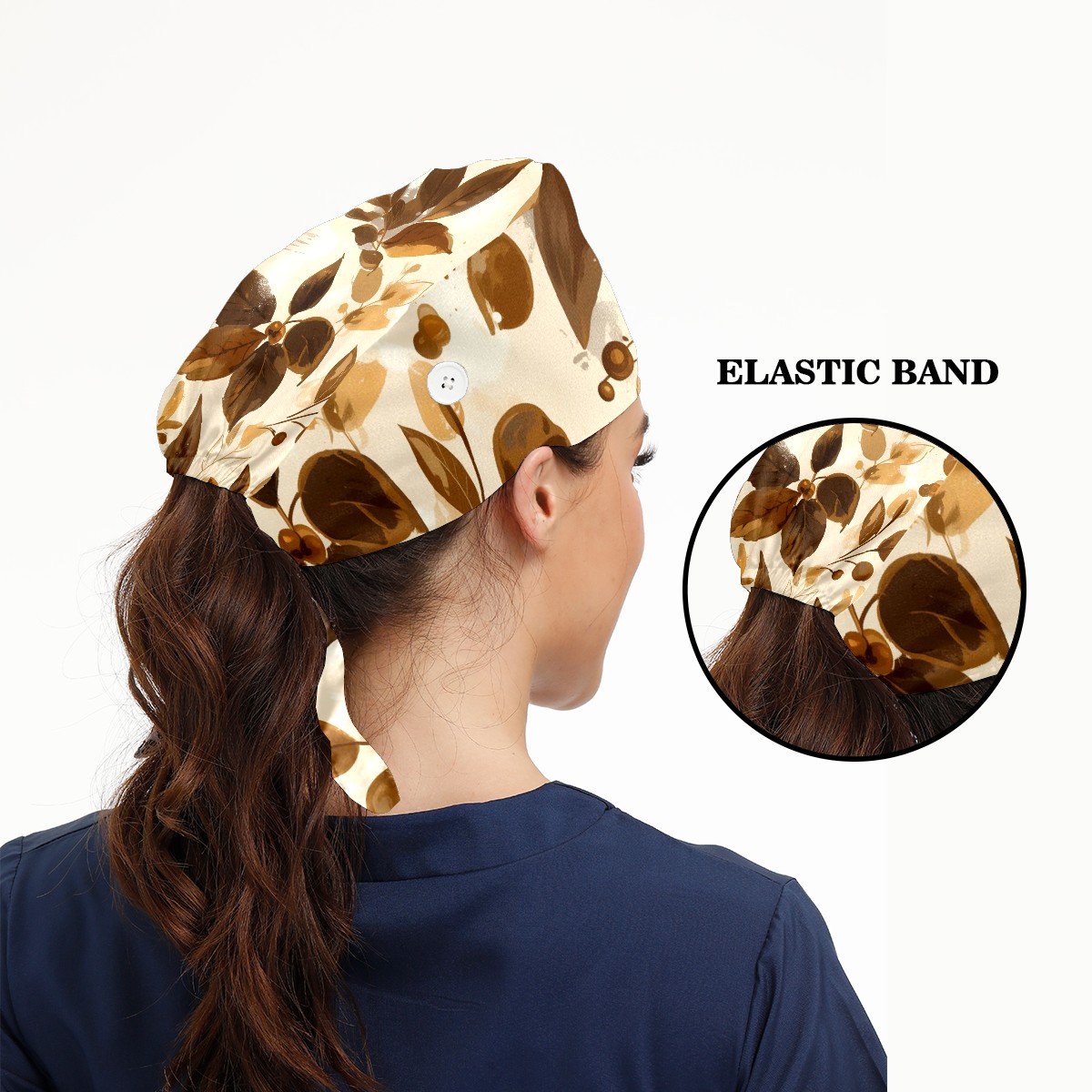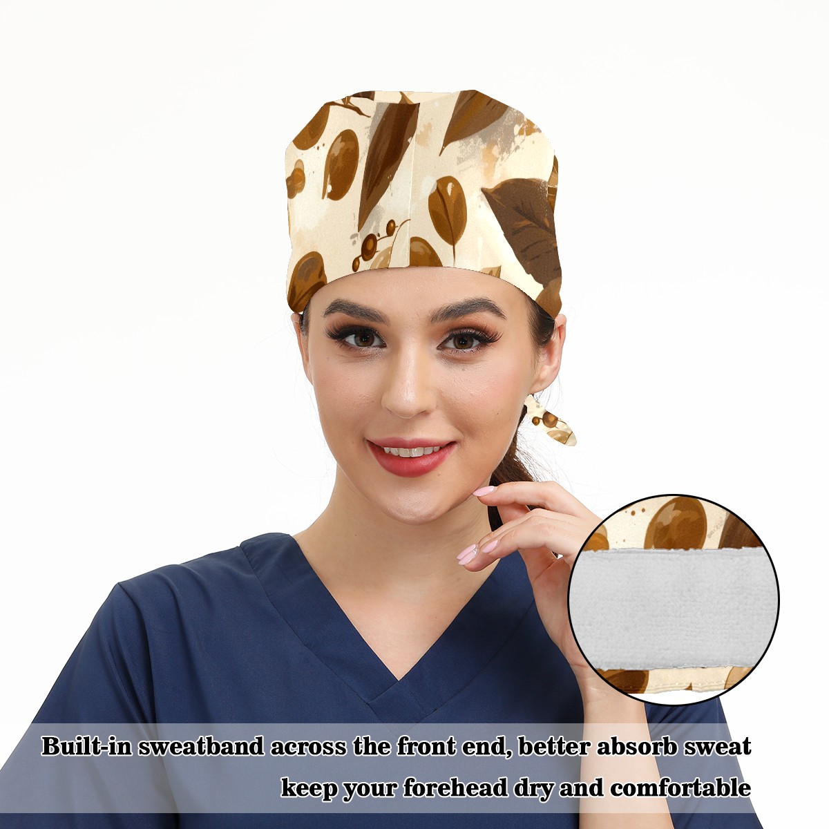 Working Caps with Button & Sweatband Satin Lined Cotton Adjustable Nurse Hats Elastic Band Scrub Cap Surgeon Hat Leave