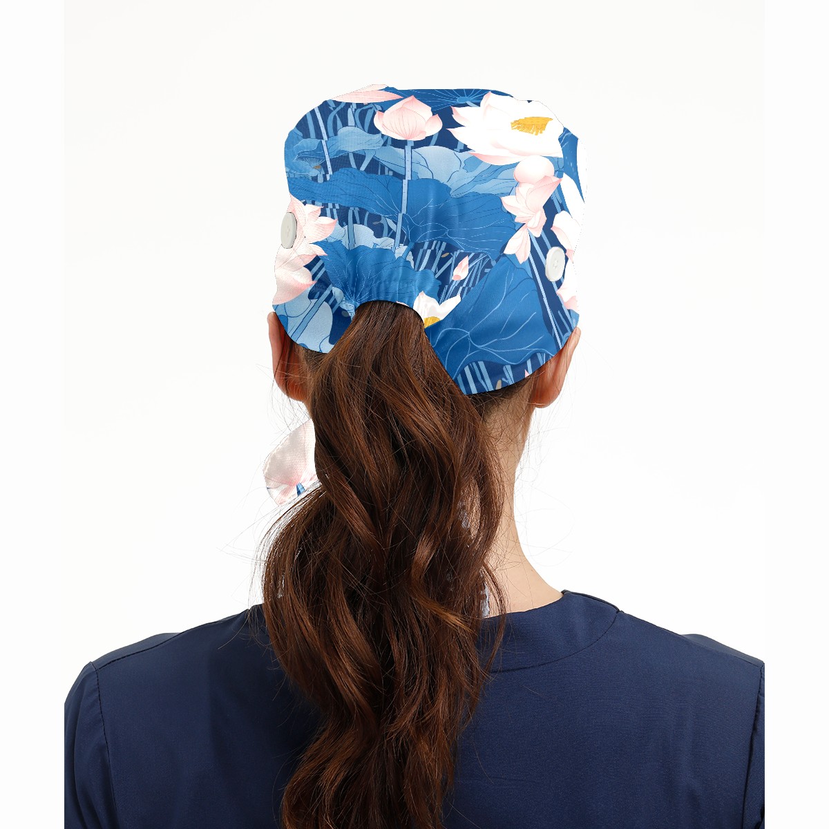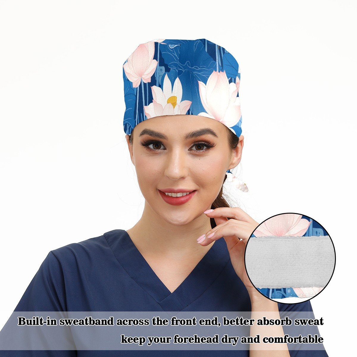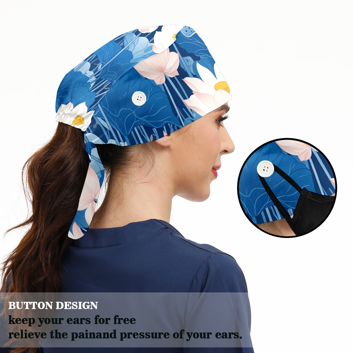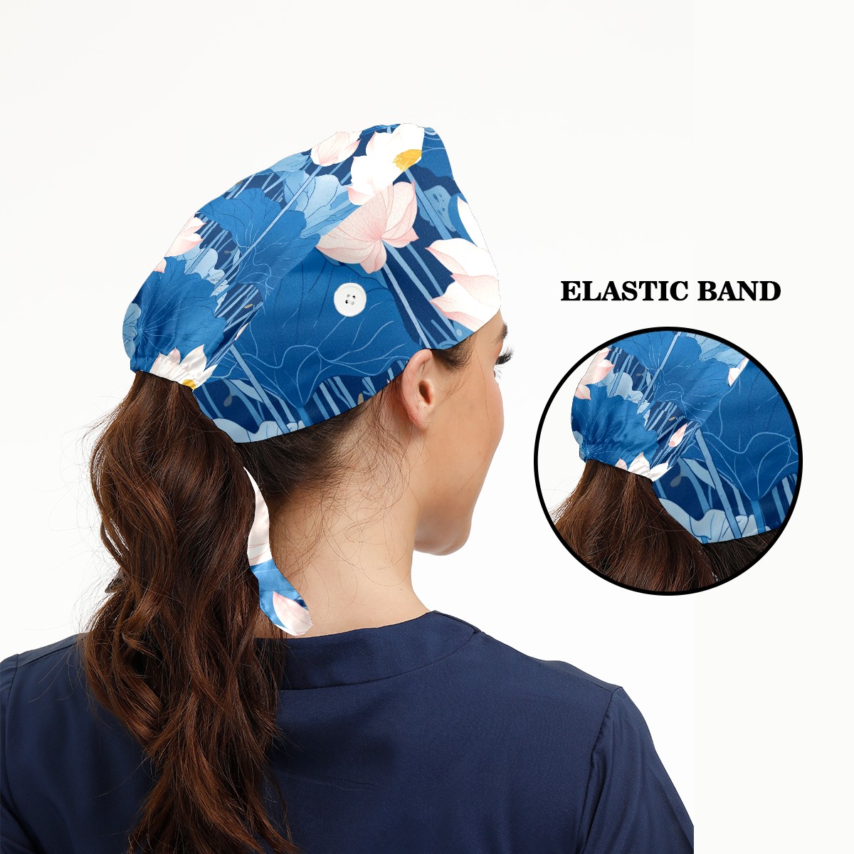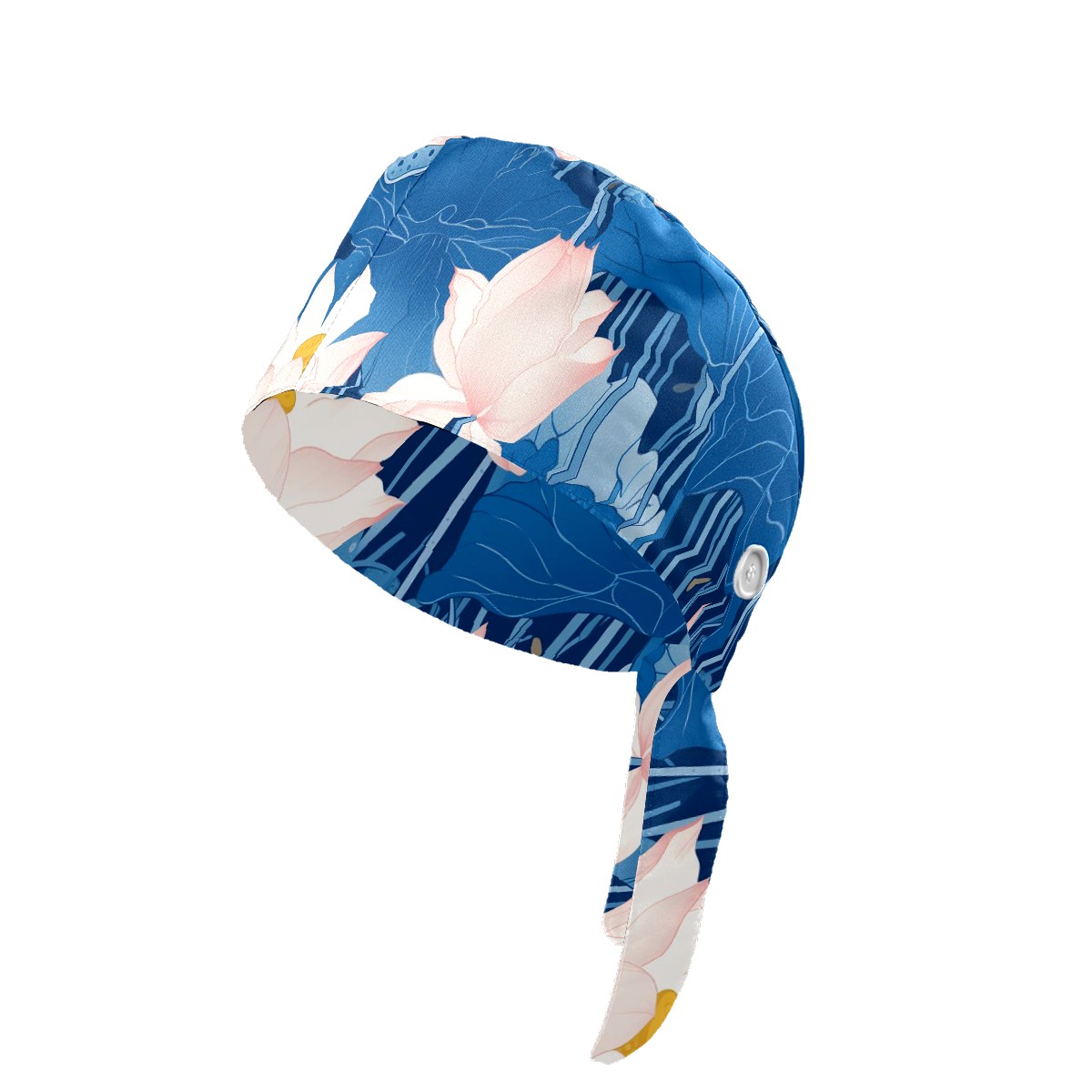 Working Caps with Button & Sweatband Satin Lined Cotton Adjustable Nurse Hats Elastic Band Scrub Cap Surgeon Hat Blue Lotus Flower