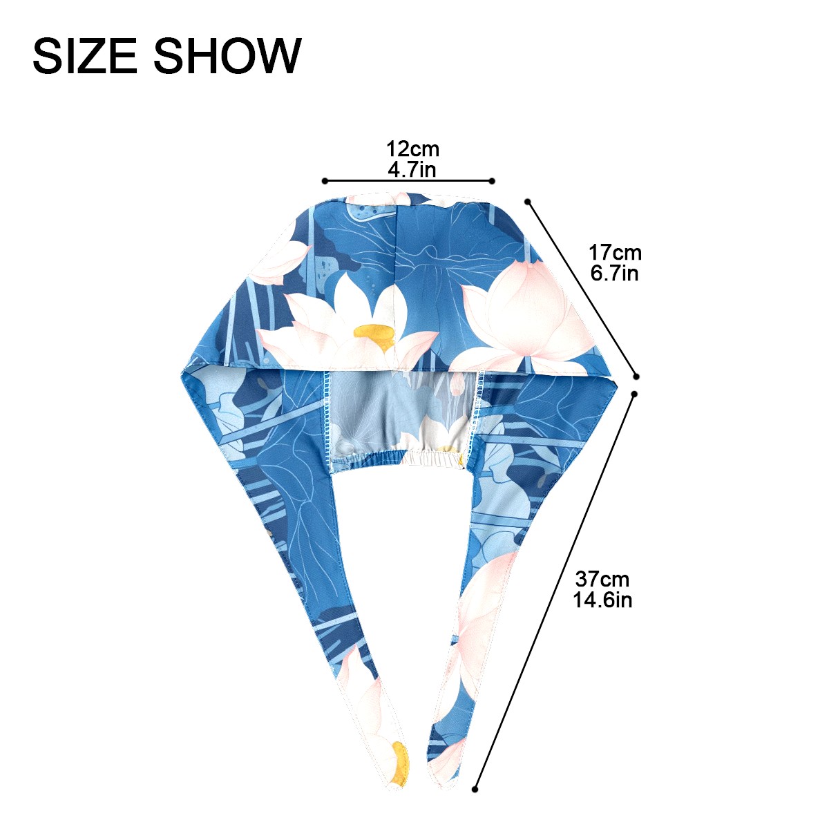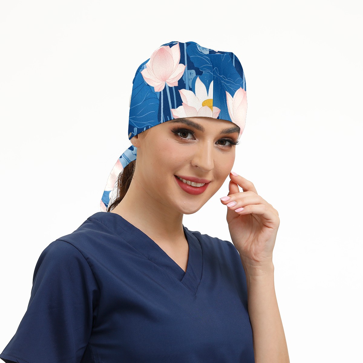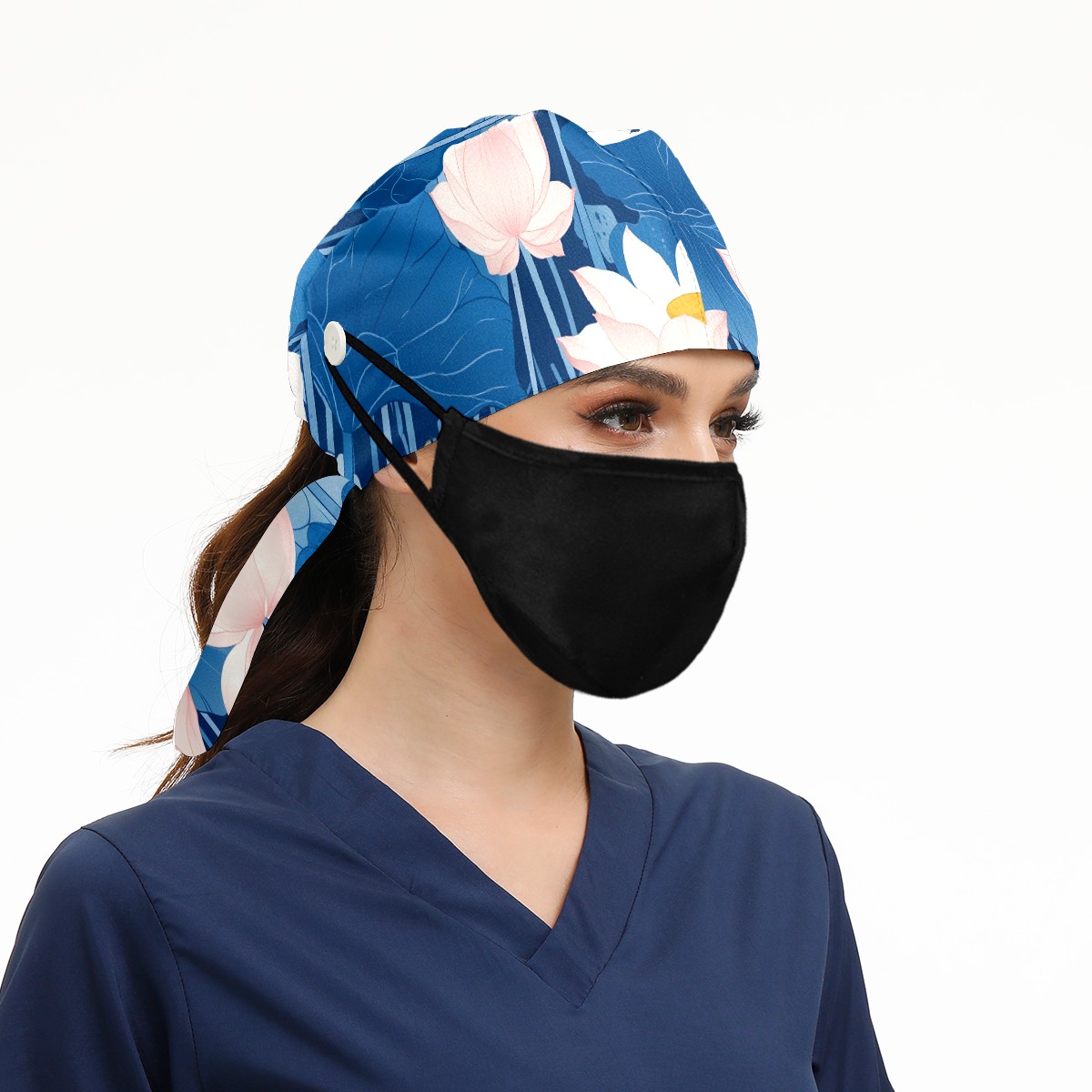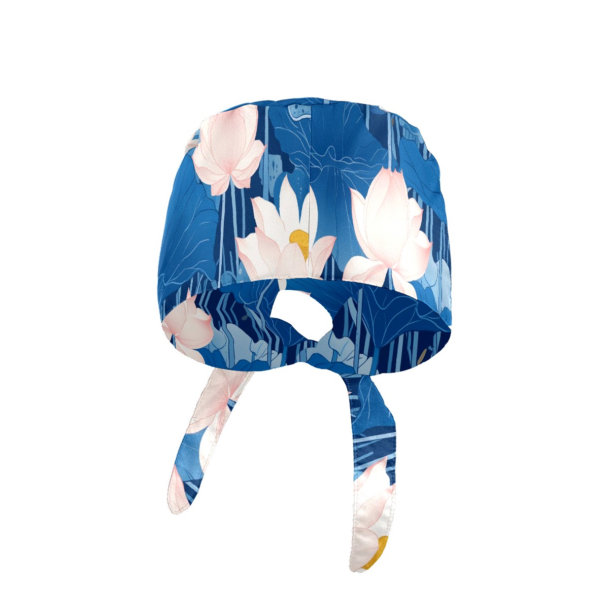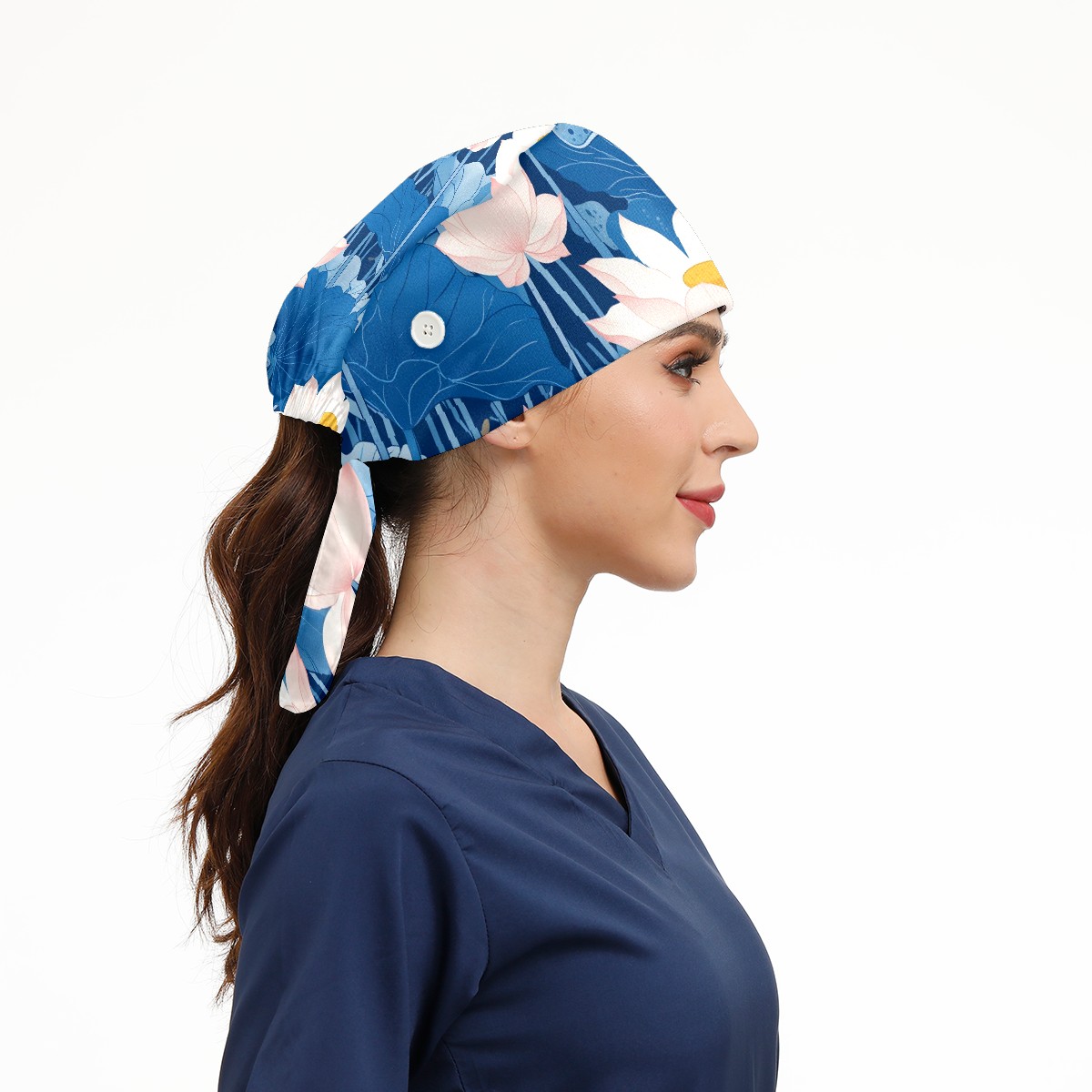 Working Caps with Button & Sweatband Satin Lined Cotton Adjustable Nurse Hats Elastic Band Scrub Cap Surgeon Hat Blue Lotus Flower