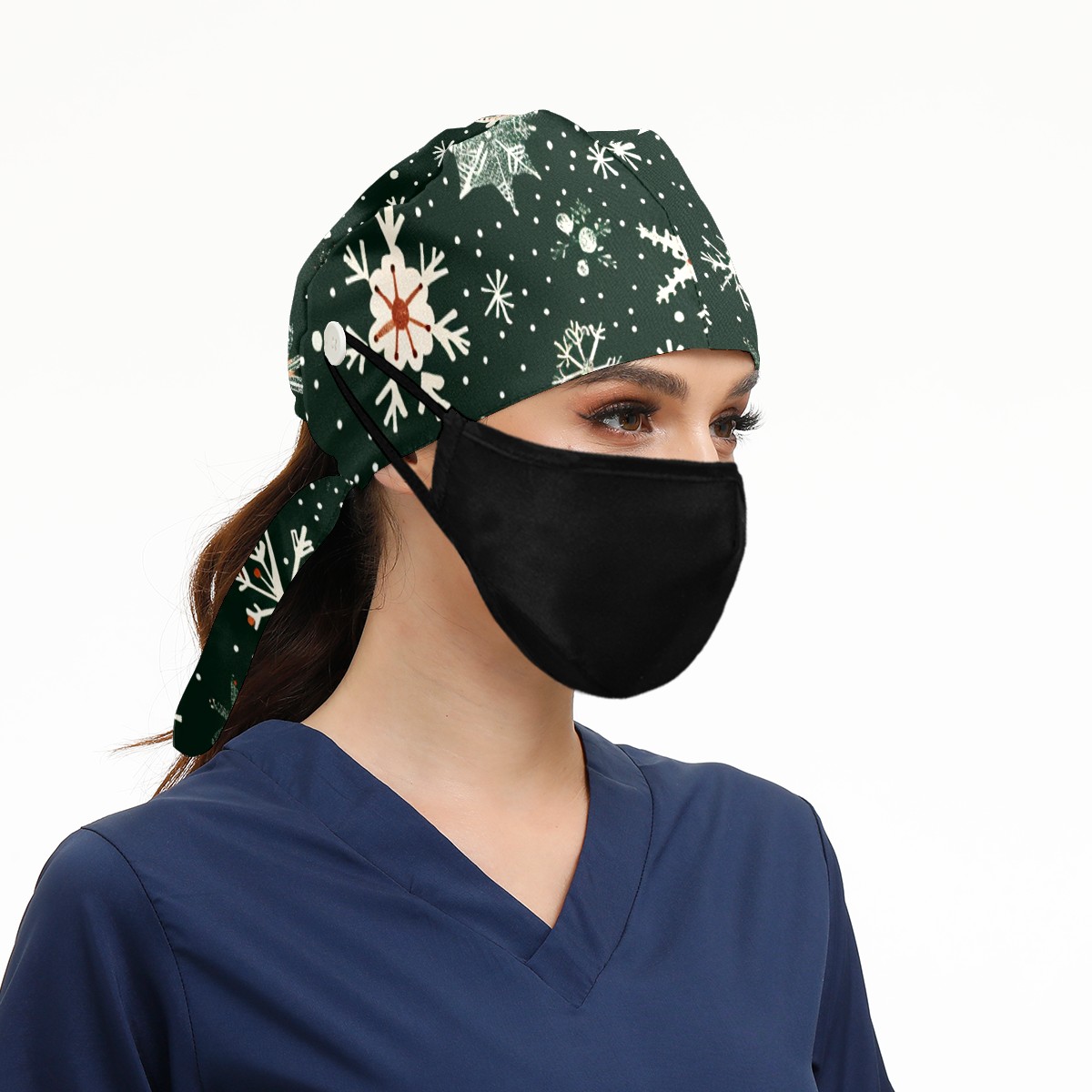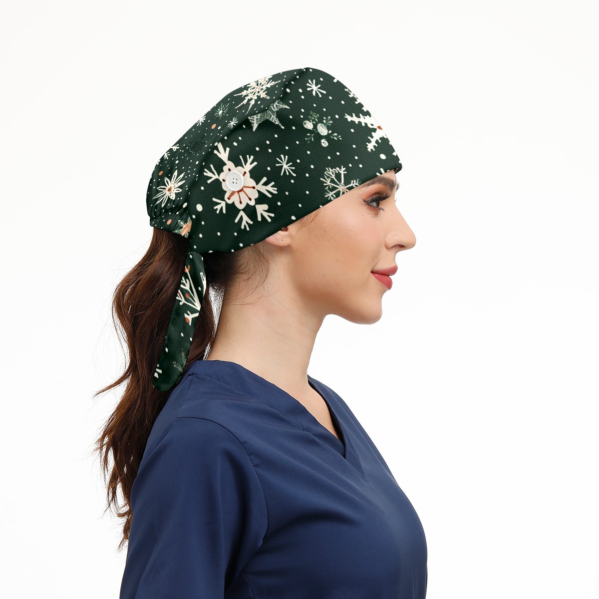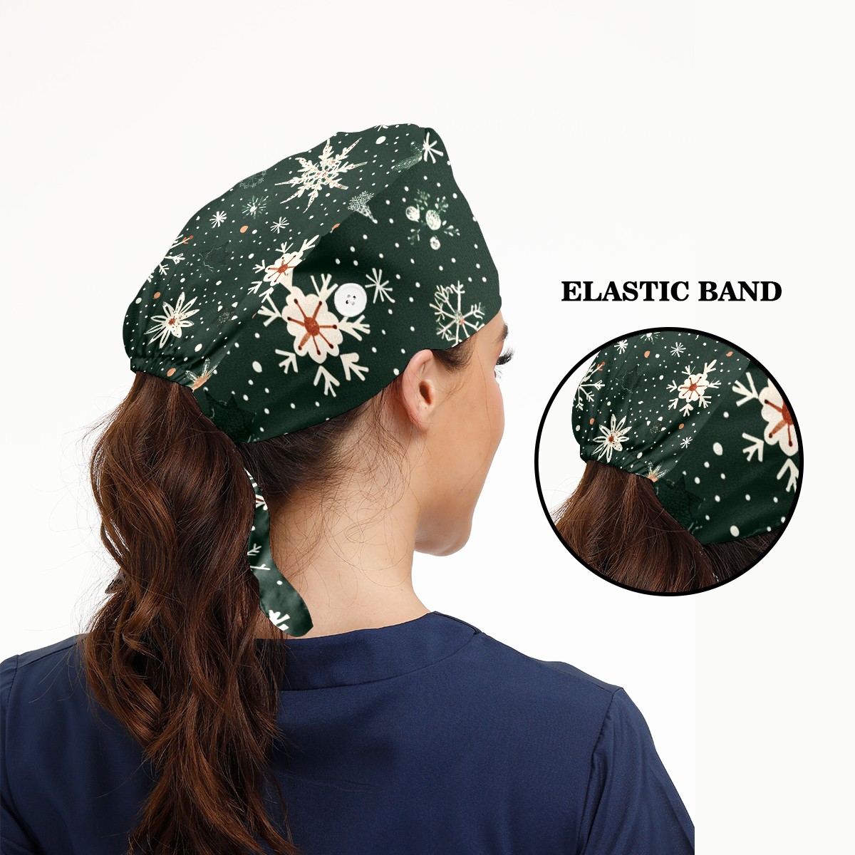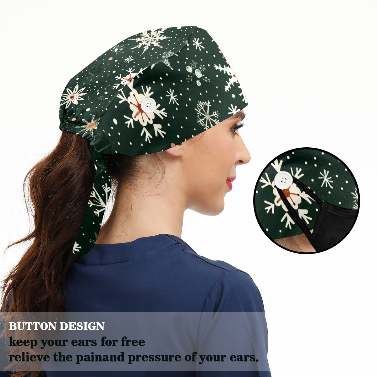 Working Caps with Button & Sweatband Satin Lined Cotton Adjustable Nurse Hats Elastic Band Scrub Cap Surgeon Hat Snowflake