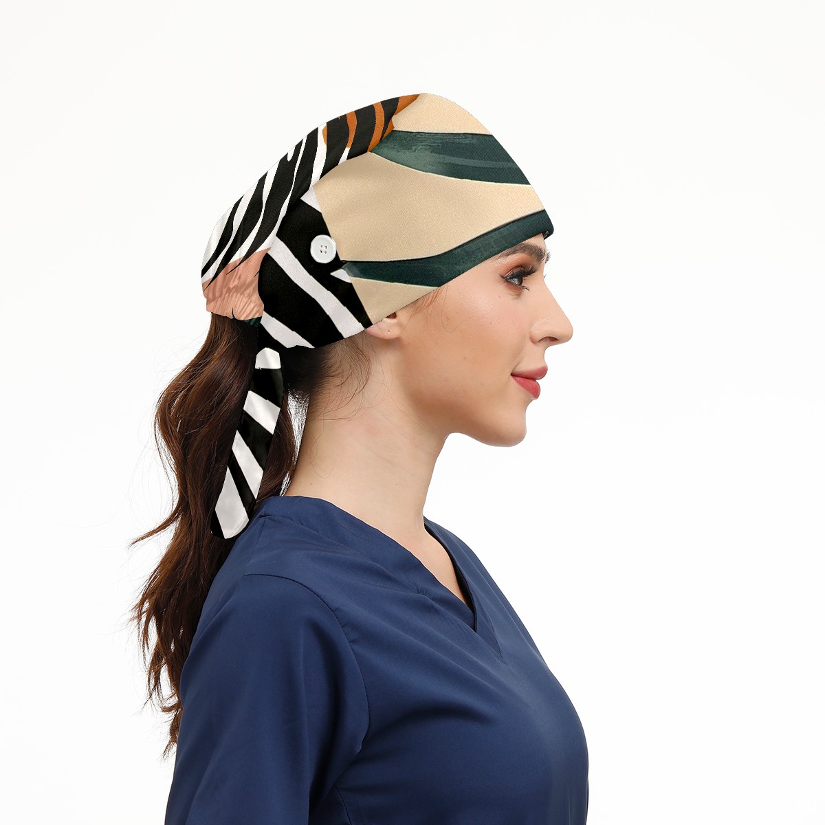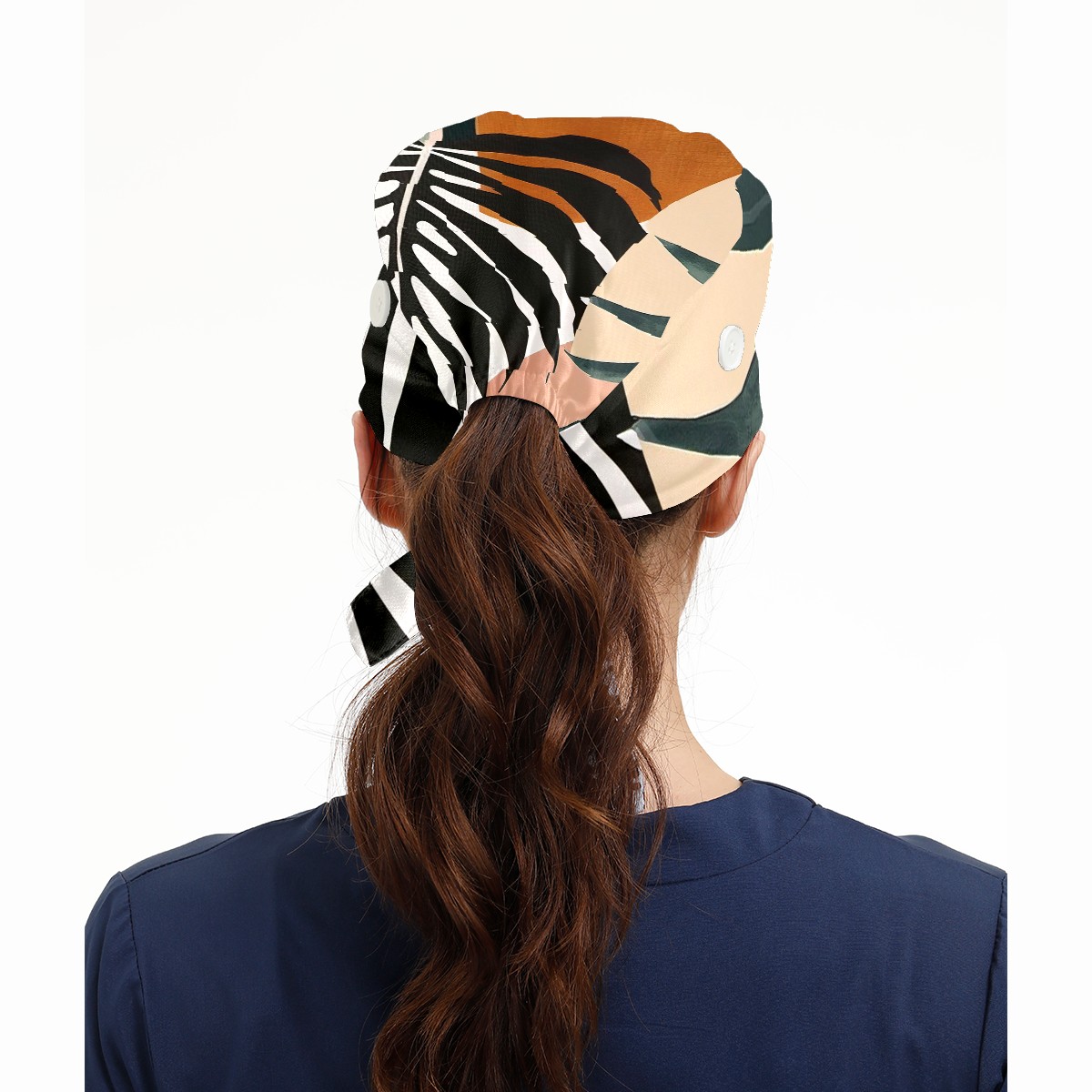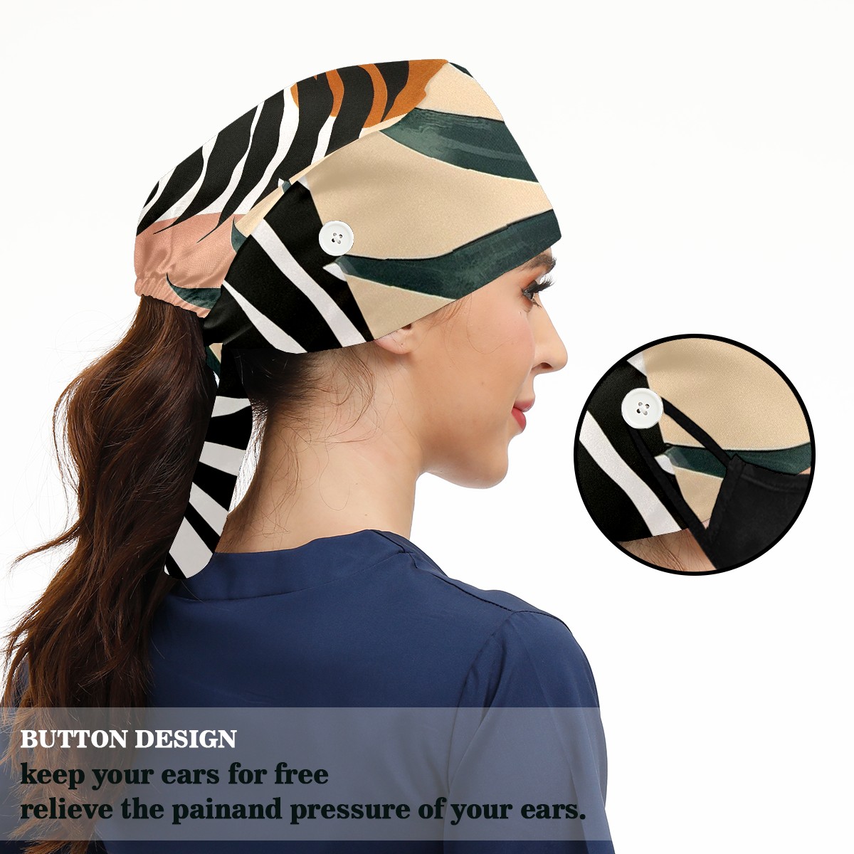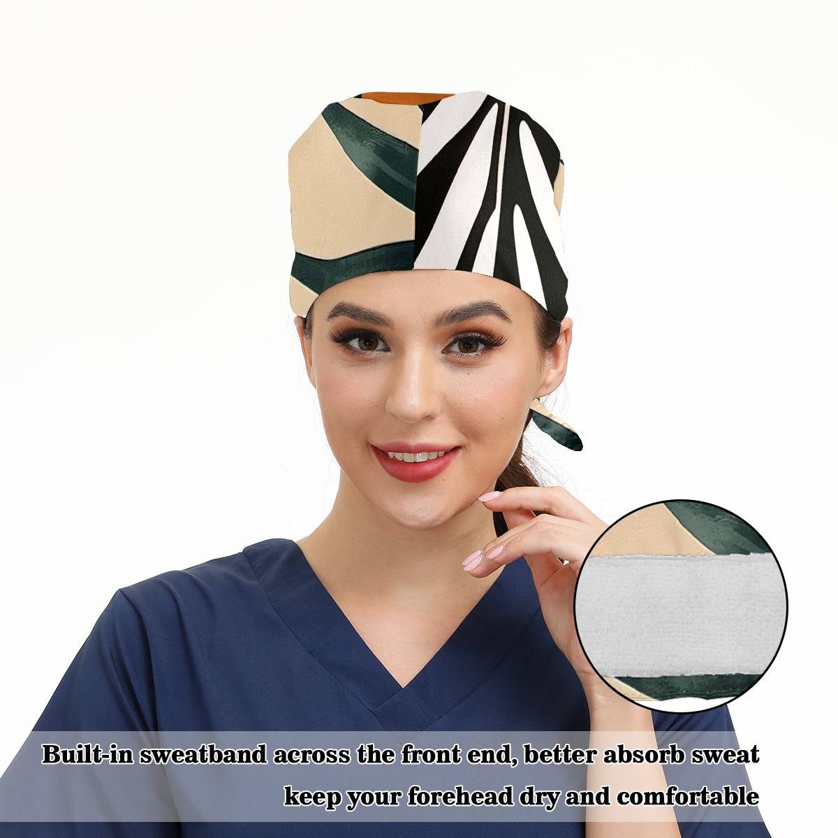 Working Caps with Button & Sweatband Satin Lined Cotton Adjustable Nurse Hats Elastic Band Scrub Cap Surgeon Hat Gold Painting Boho Leaves