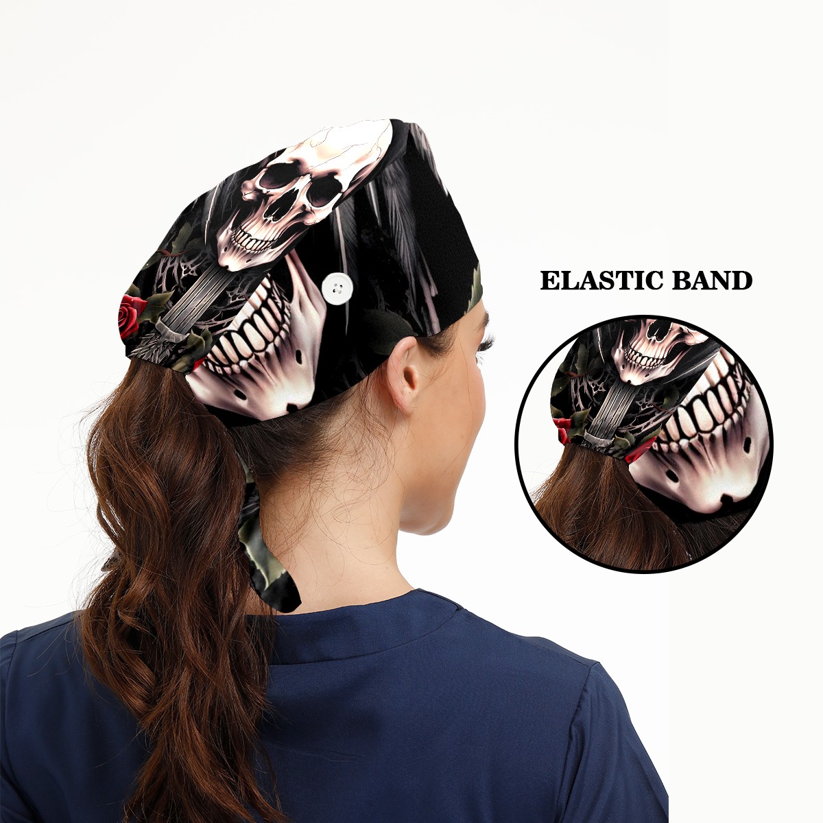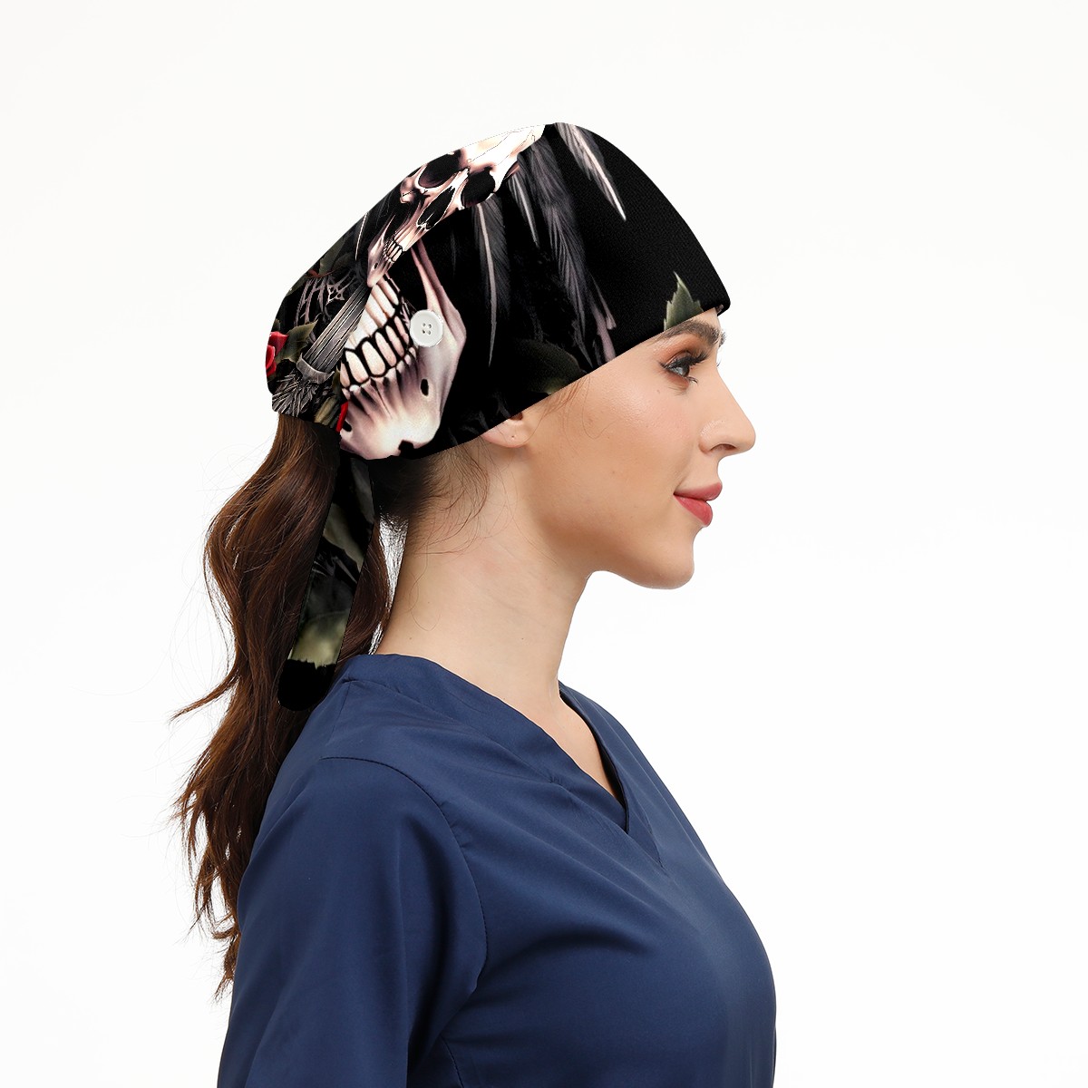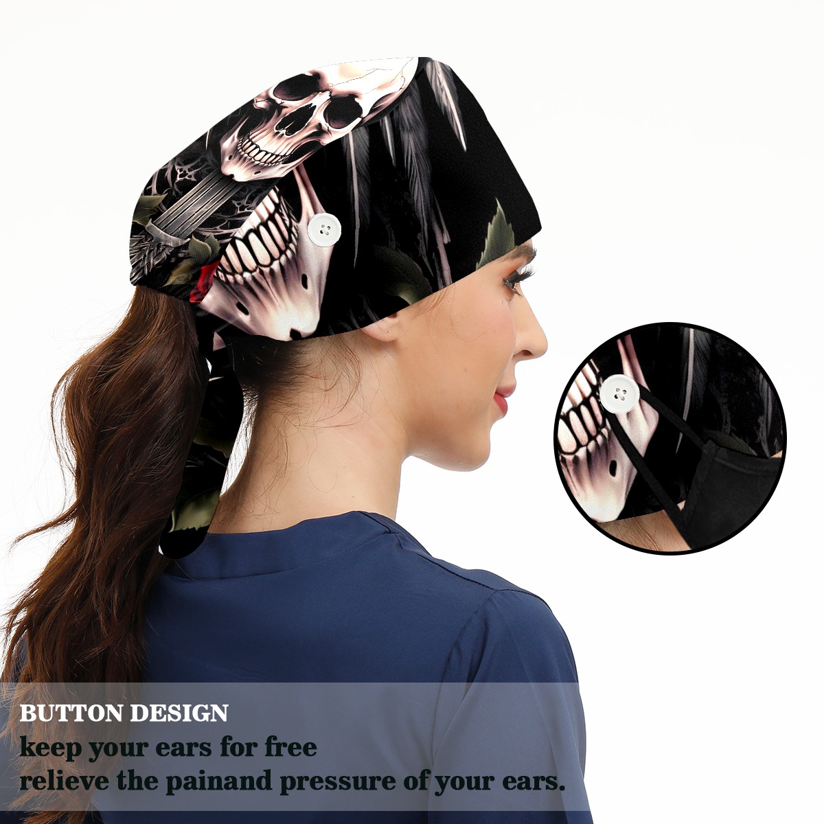 Working Caps with Button & Sweatband Satin Lined Cotton Adjustable Nurse Hats Elastic Band Scrub Cap Surgeon Hat Skull Head