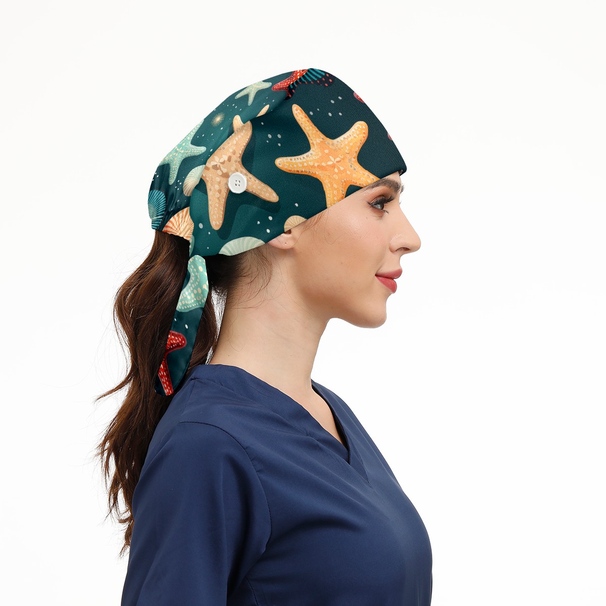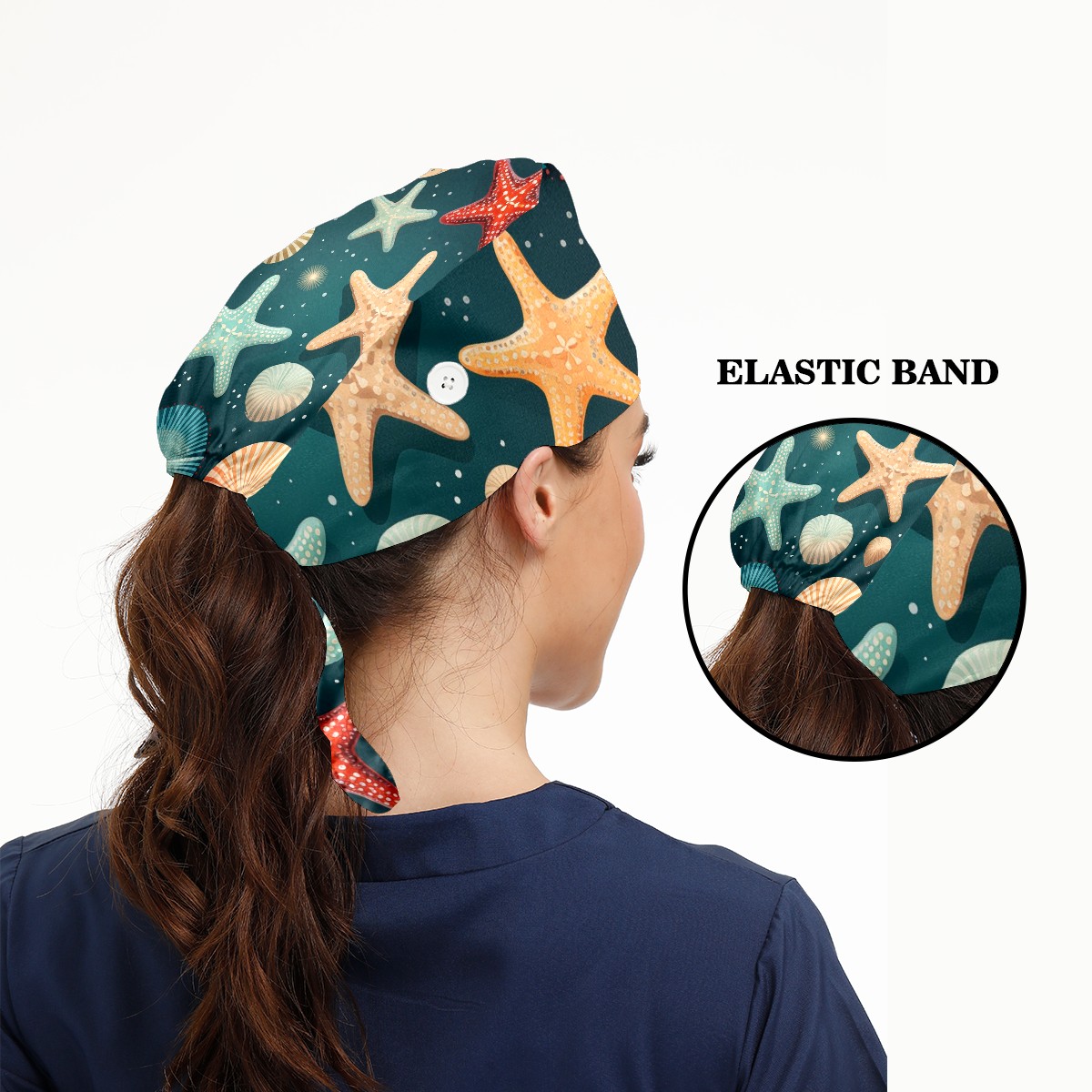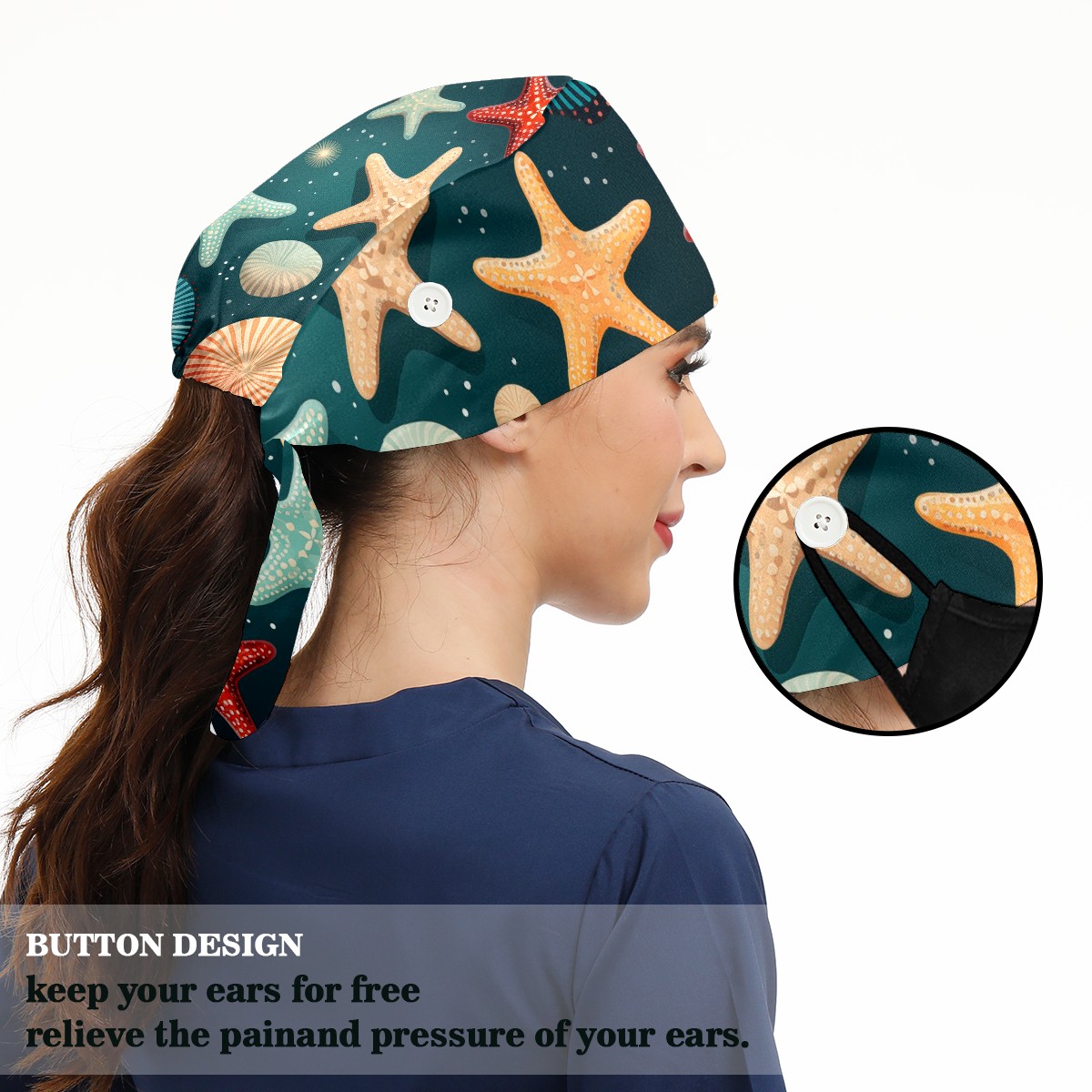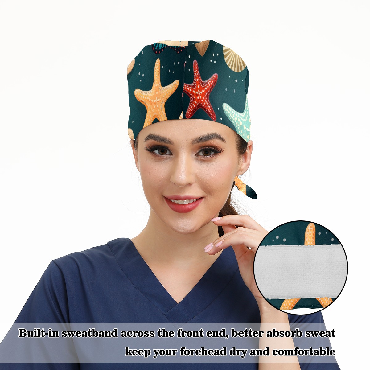 Working Caps with Button & Sweatband Satin Lined Cotton Adjustable Nurse Hats Elastic Band Scrub Cap Surgeon Hat Sea Star Shell