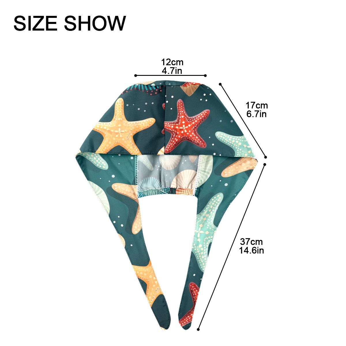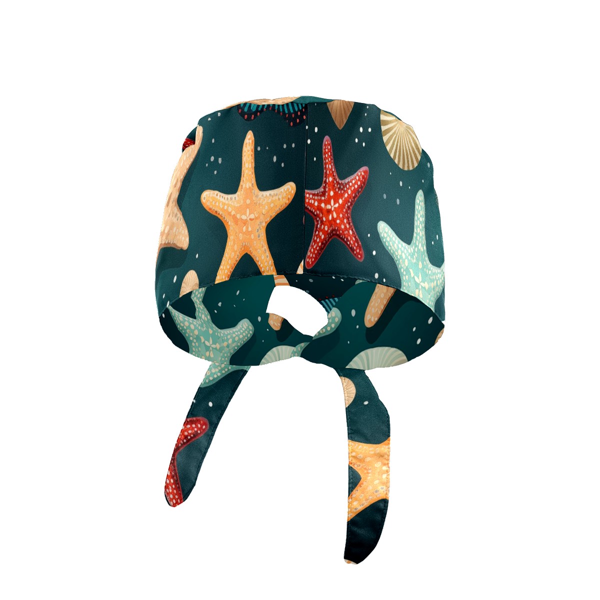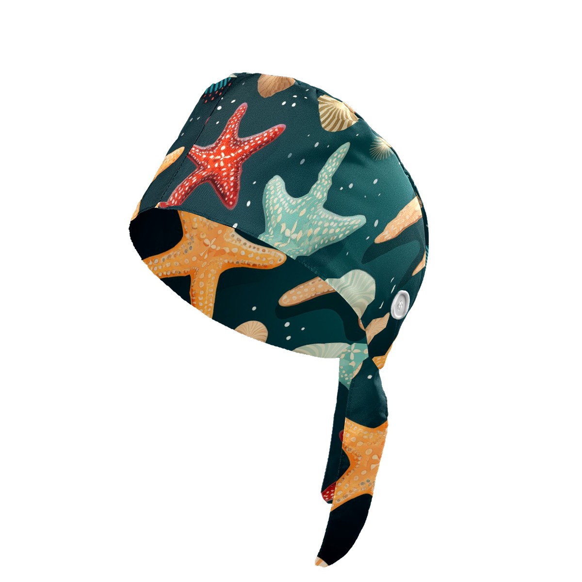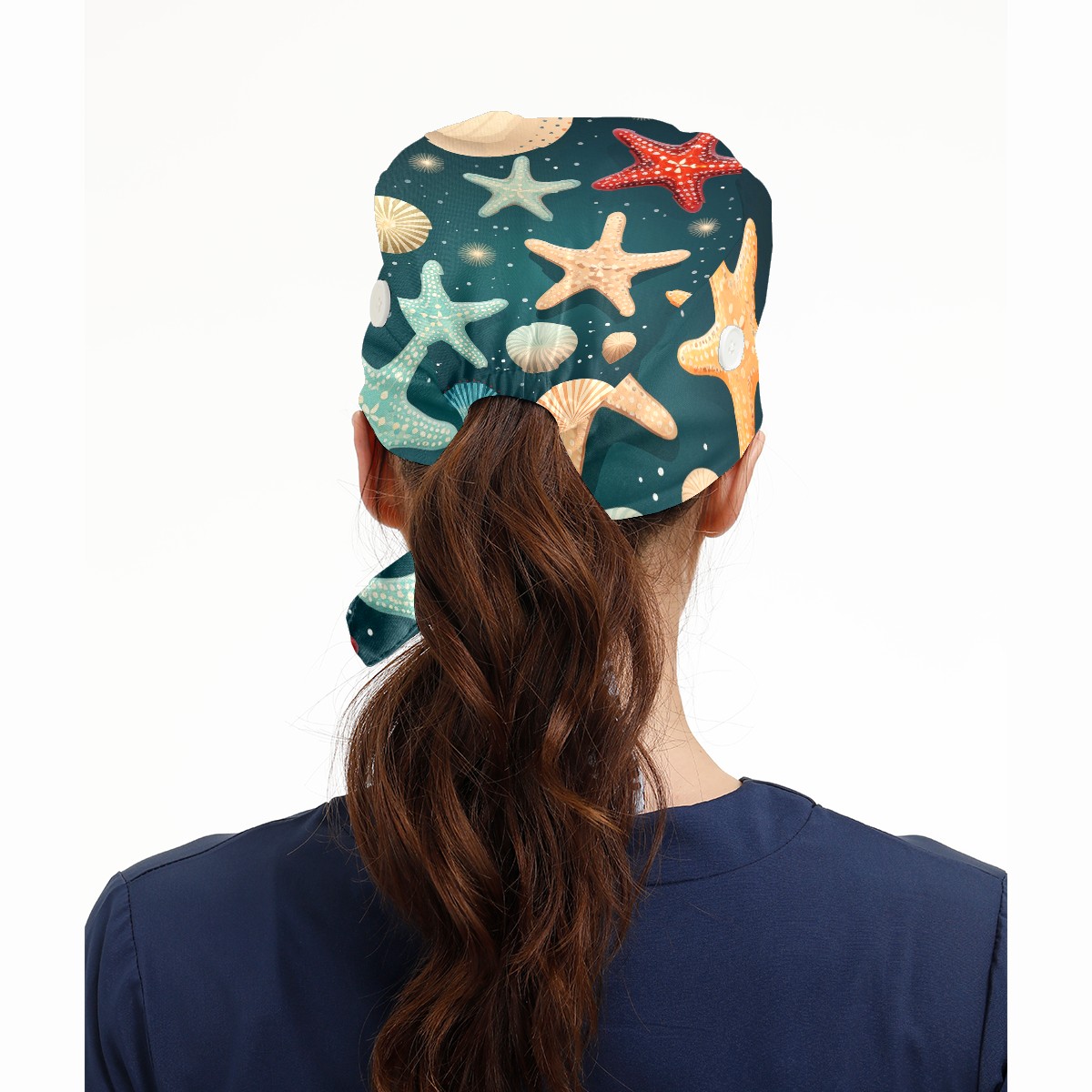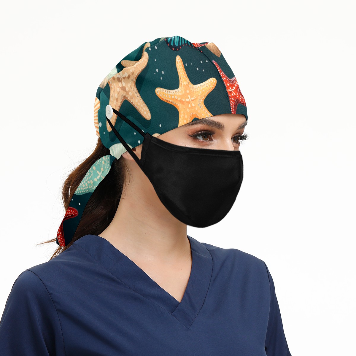 Working Caps with Button & Sweatband Satin Lined Cotton Adjustable Nurse Hats Elastic Band Scrub Cap Surgeon Hat Sea Star Shell