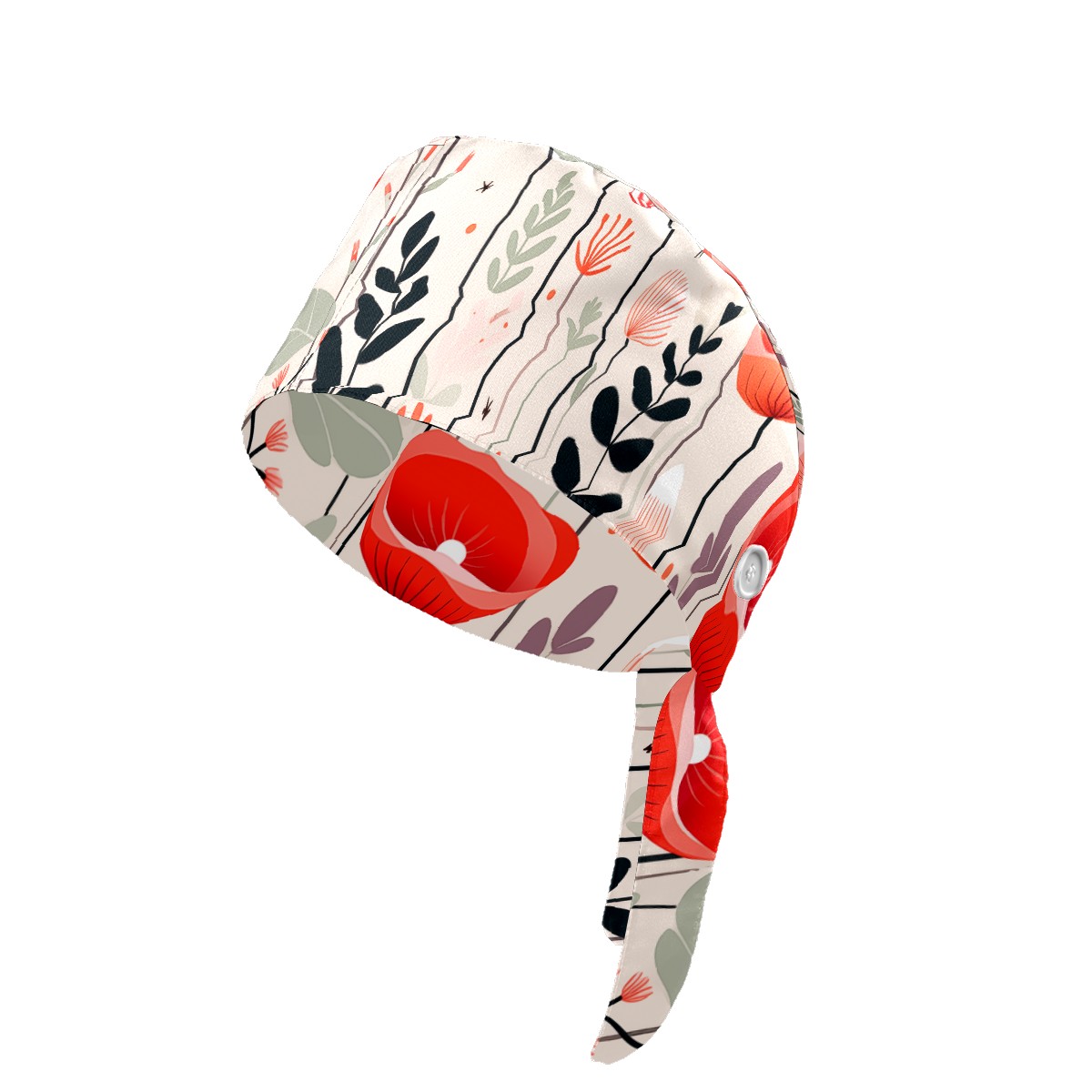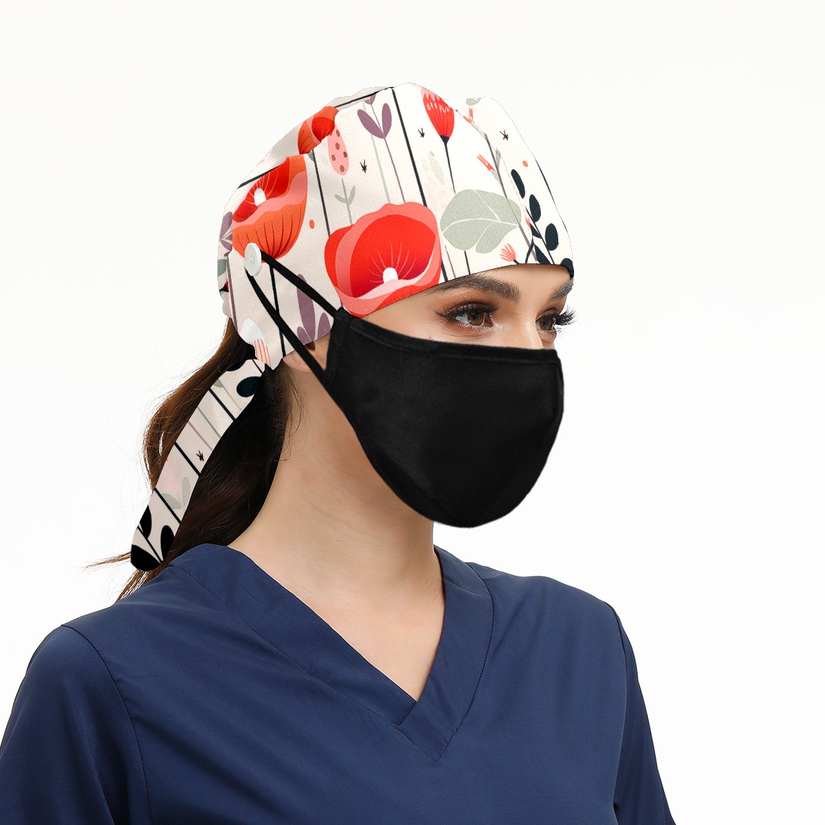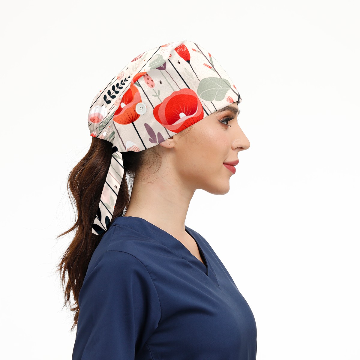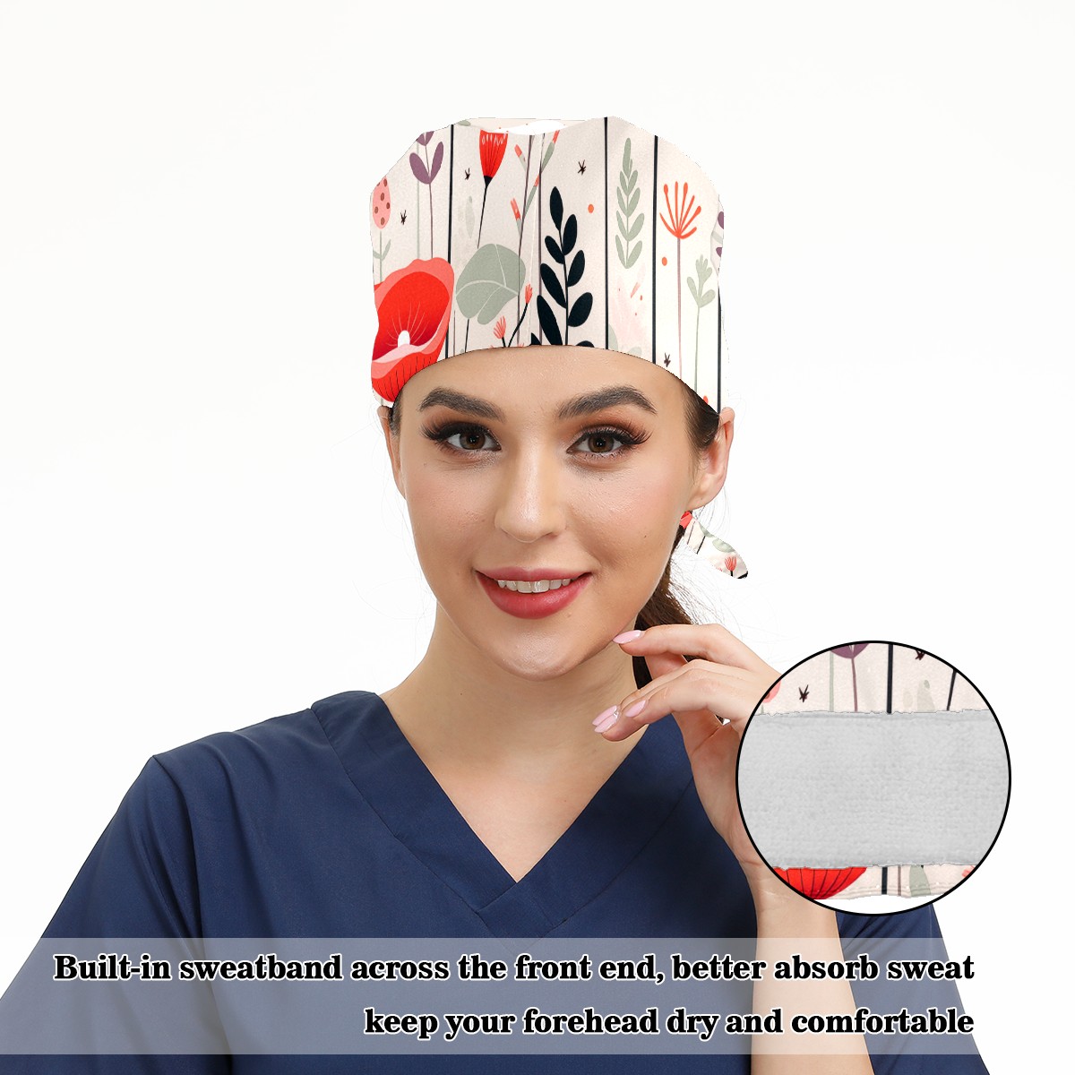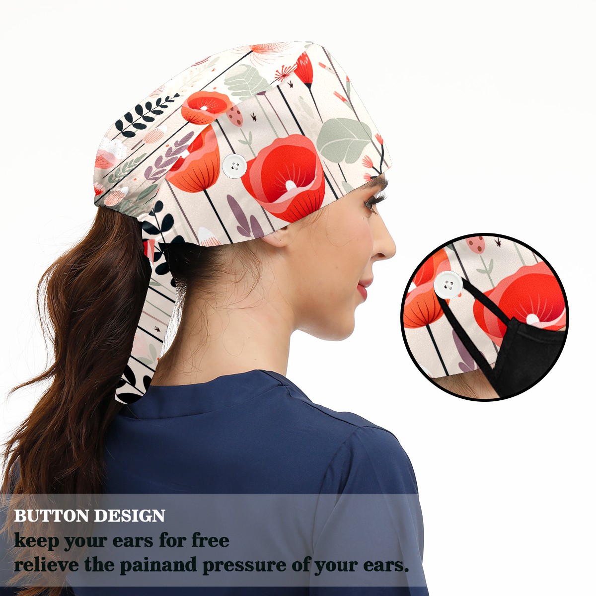 Working Caps with Button & Sweatband Satin Lined Cotton Adjustable Nurse Hats Elastic Band Scrub Cap Surgeon Hat Red Flower