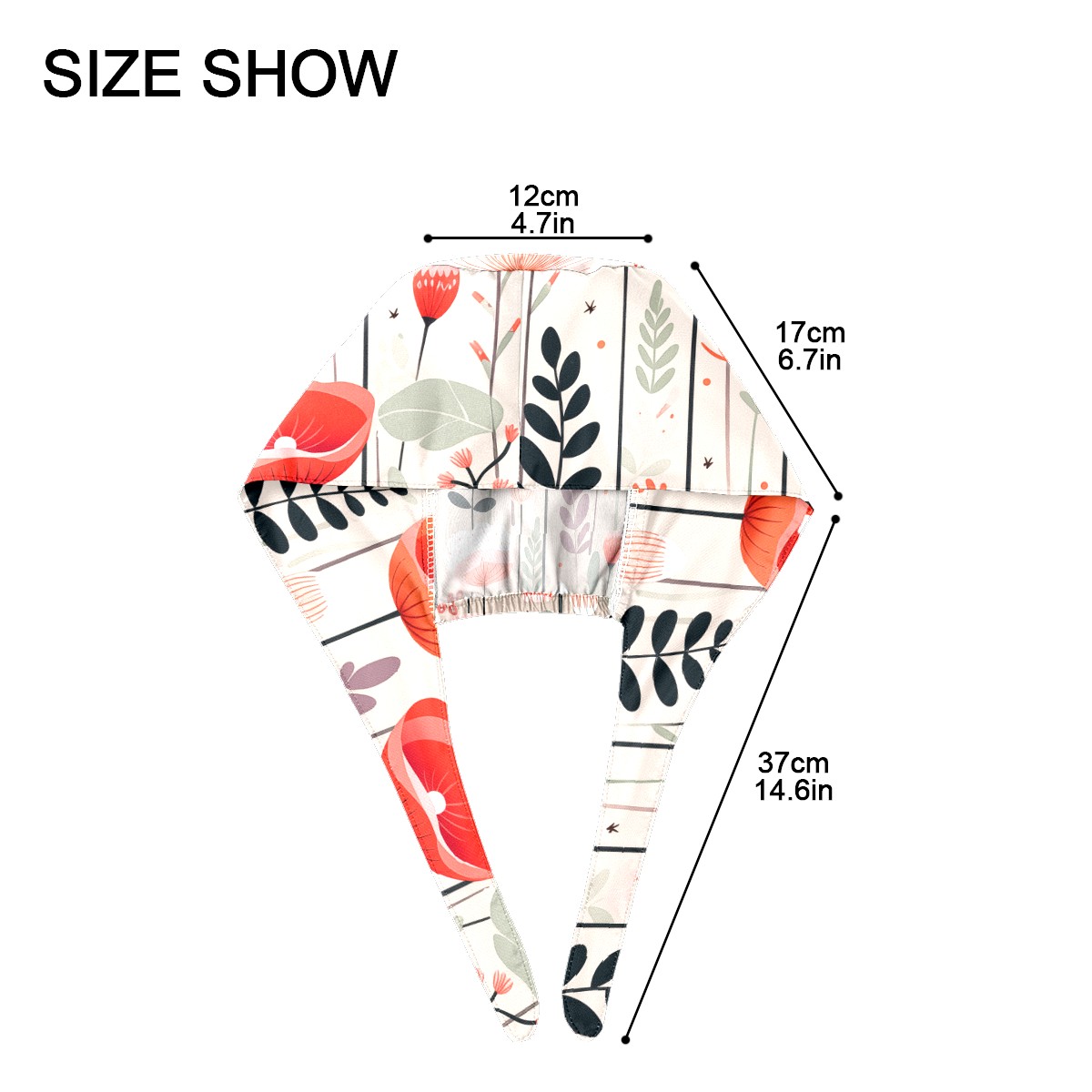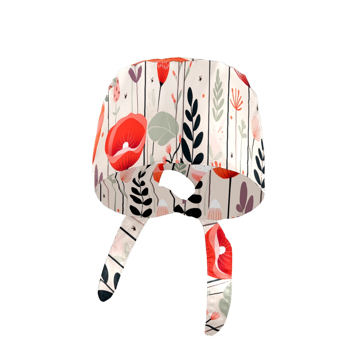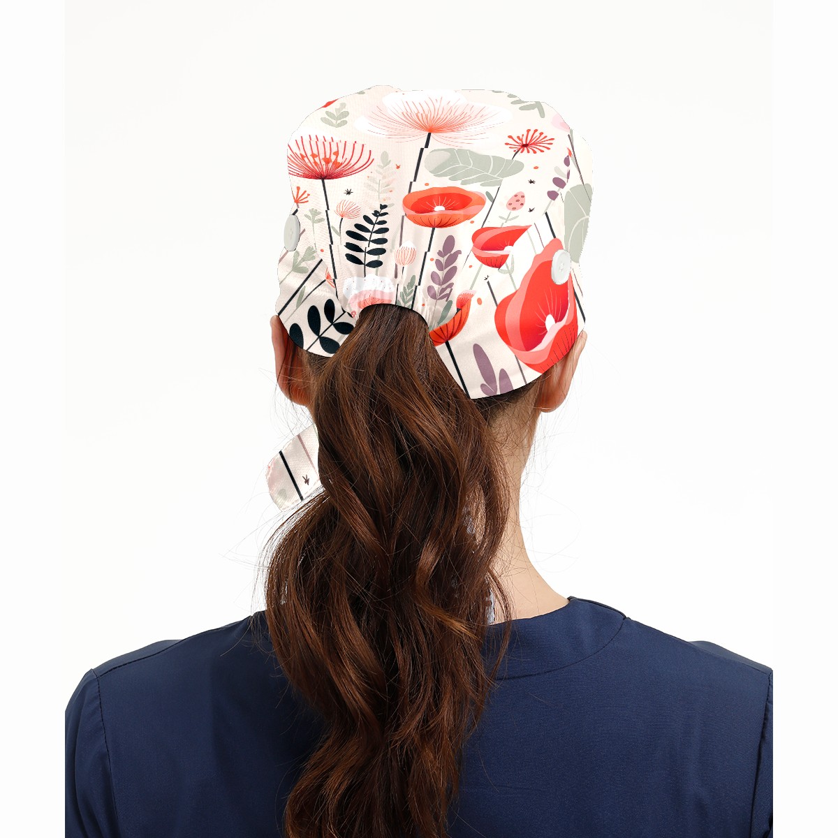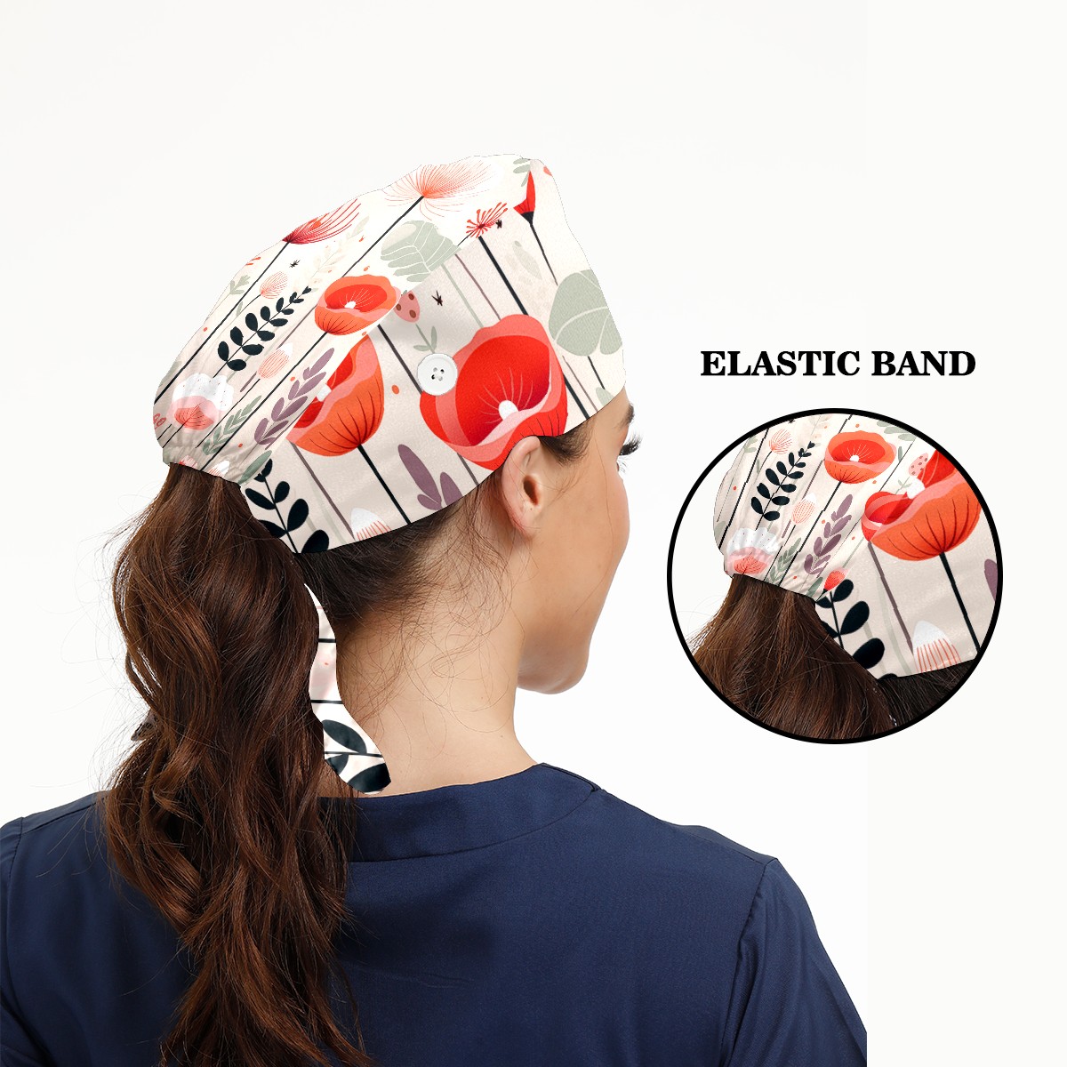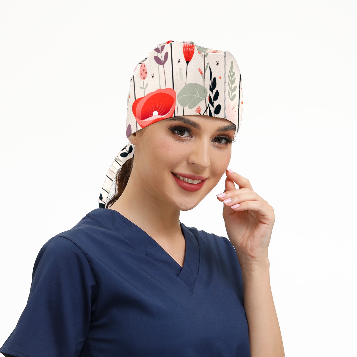 Working Caps with Button & Sweatband Satin Lined Cotton Adjustable Nurse Hats Elastic Band Scrub Cap Surgeon Hat Red Flower