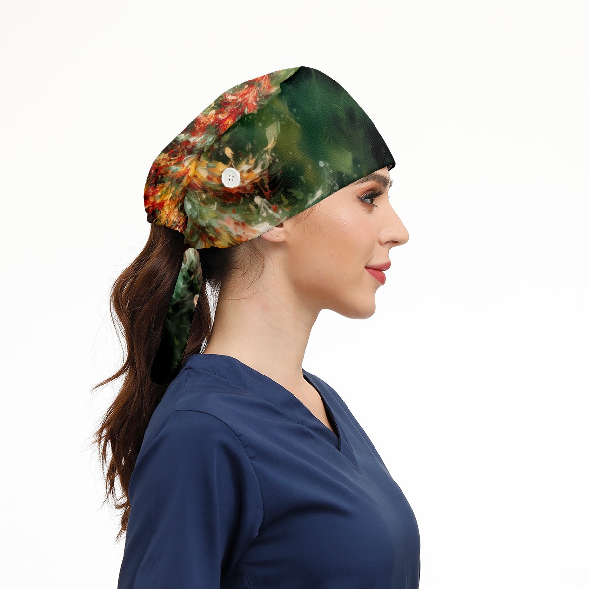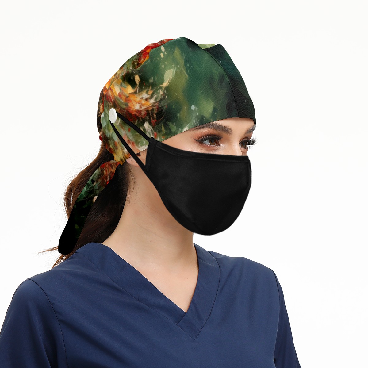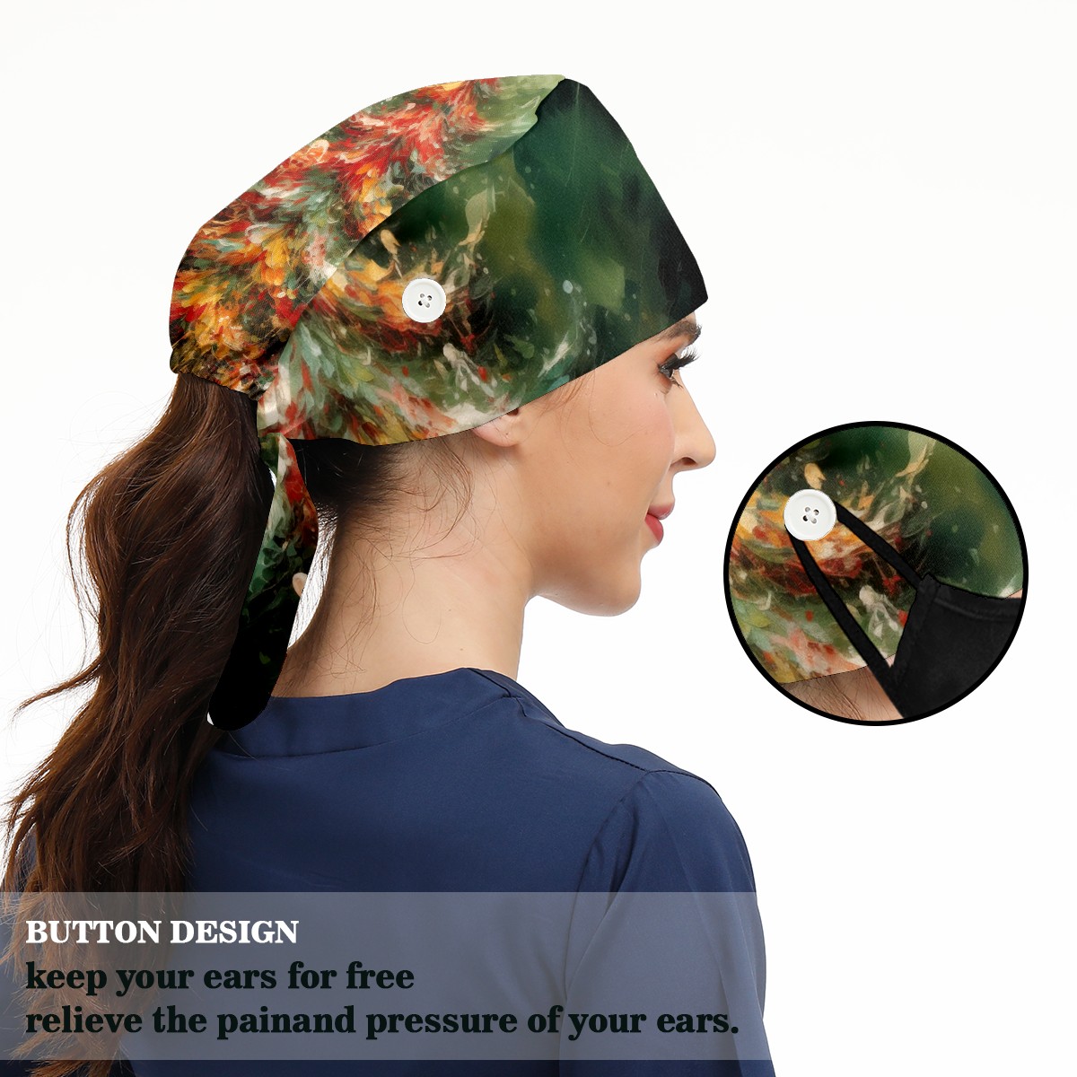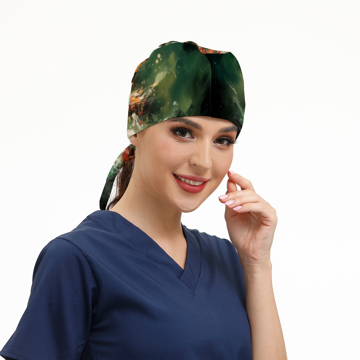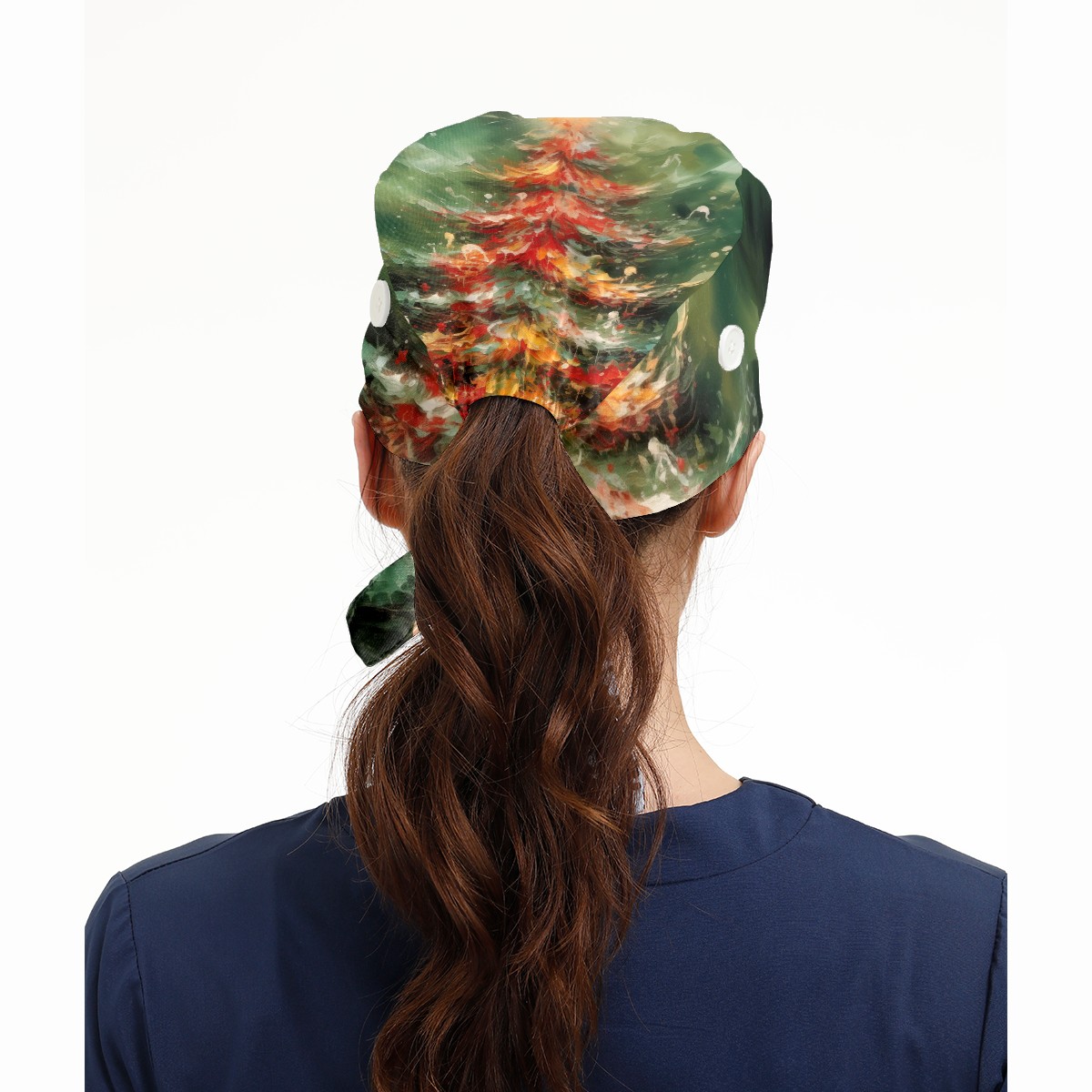 Working Caps with Button & Sweatband Satin Lined Cotton Adjustable Nurse Hats Elastic Band Scrub Cap Surgeon Hat Christmas Tree