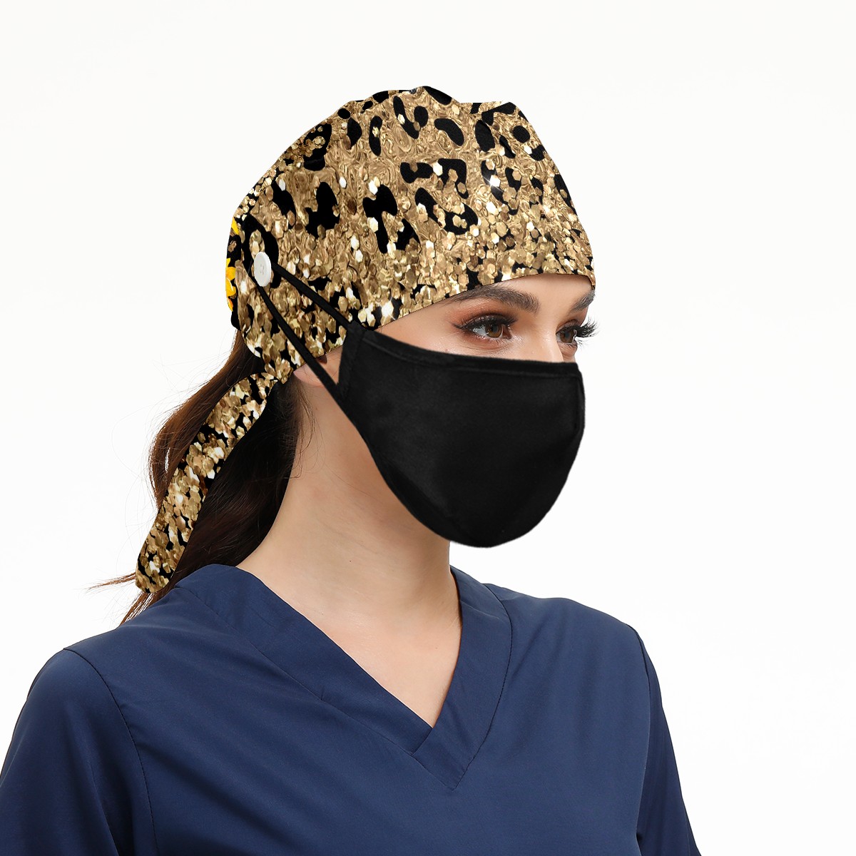 Working Caps with Button & Sweatband Satin Lined Cotton Adjustable Nurse Hats Elastic Band Scrub Cap Surgeon Hat Leopard Sunflower (1)