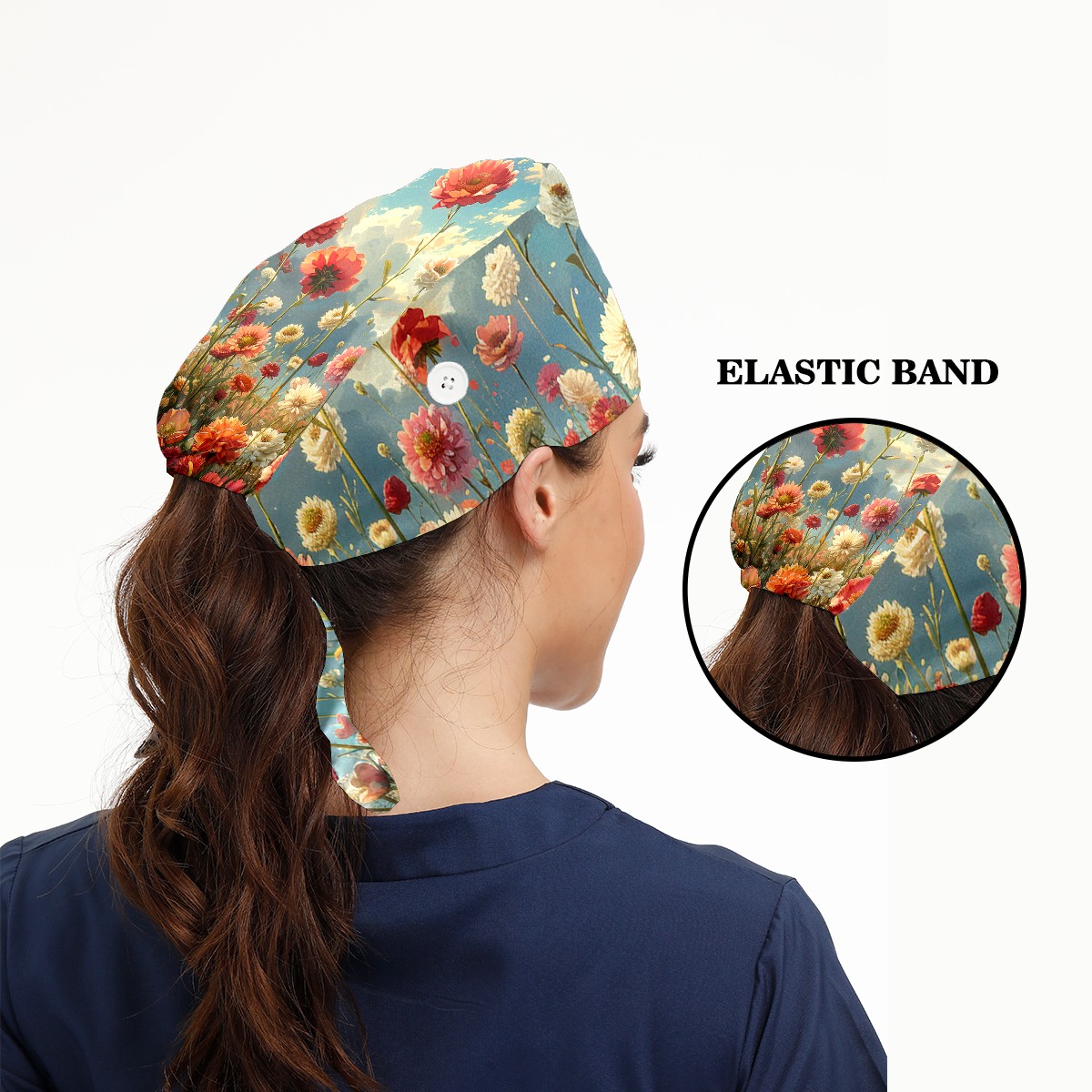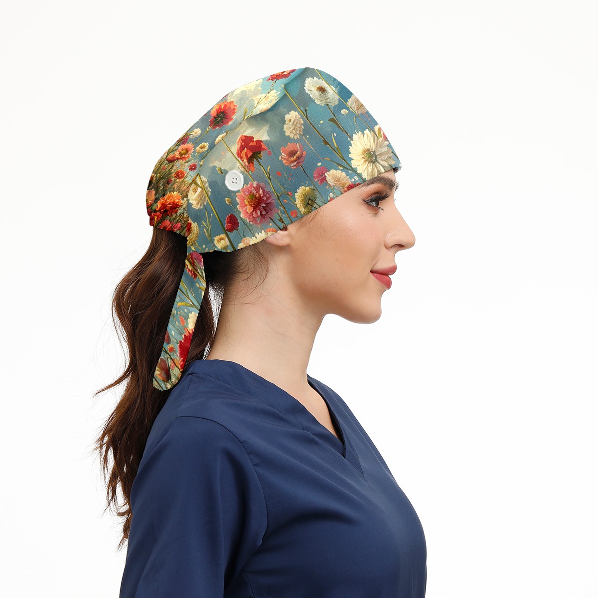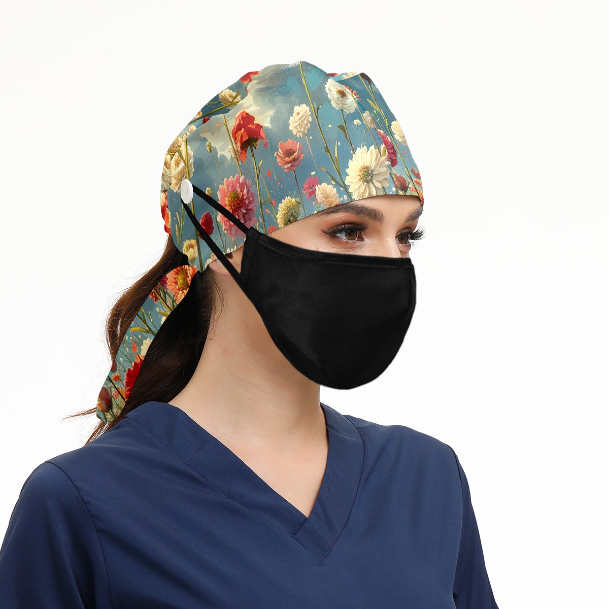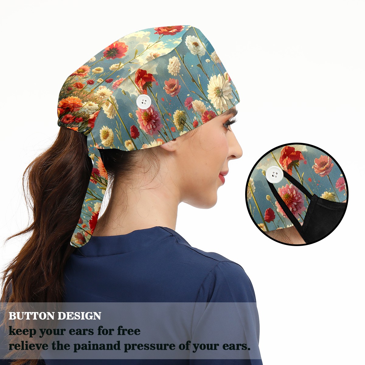 Working Caps with Button & Sweatband Satin Lined Cotton Adjustable Nurse Hats Elastic Band Scrub Cap Surgeon Hat Flower