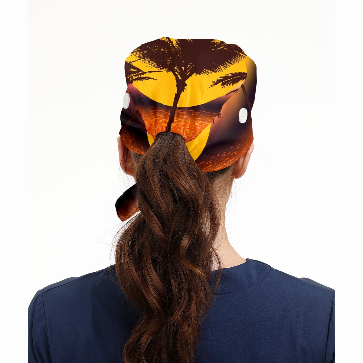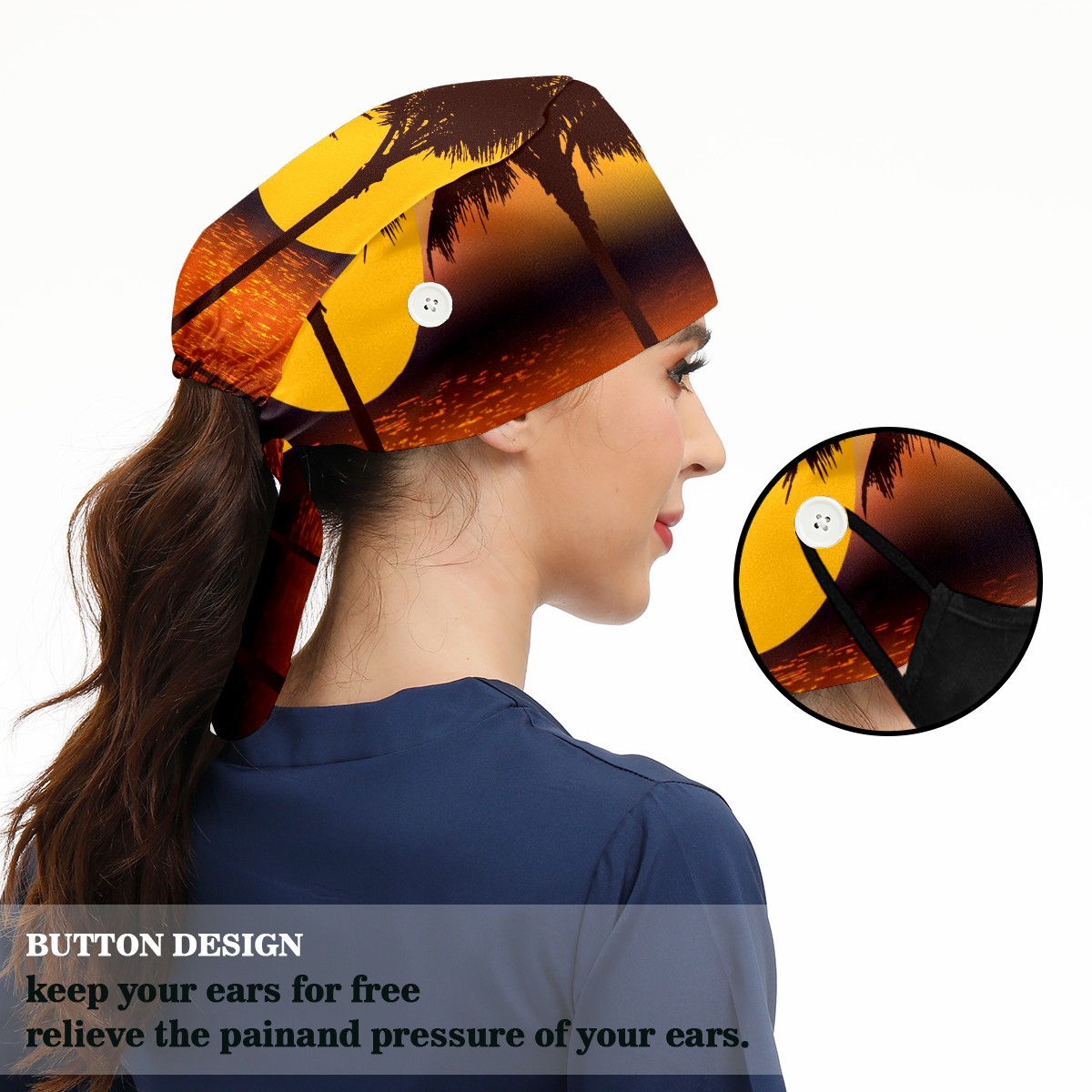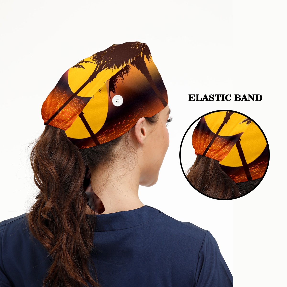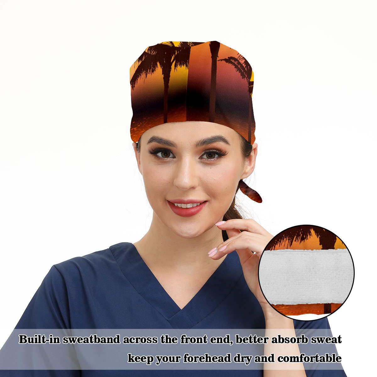 Working Caps with Button & Sweatband Satin Lined Cotton Adjustable Nurse Hats Elastic Band Scrub Cap Surgeon Hat Tropical Sunset Palm Trees
