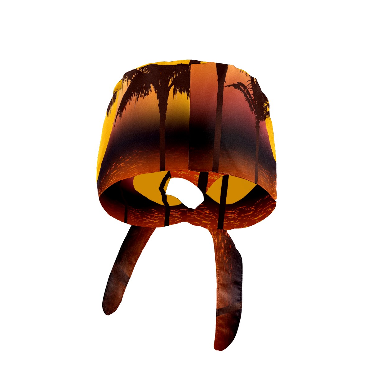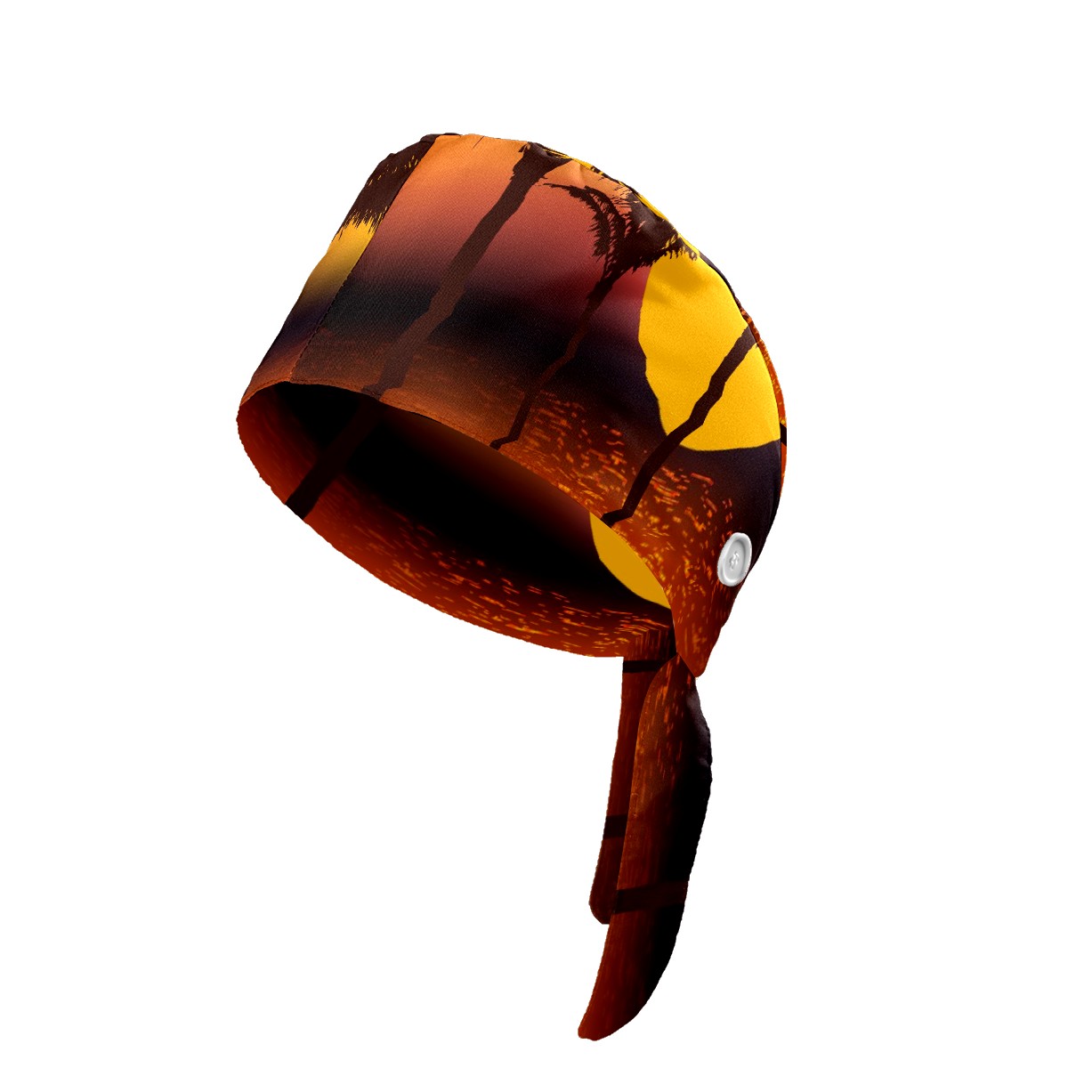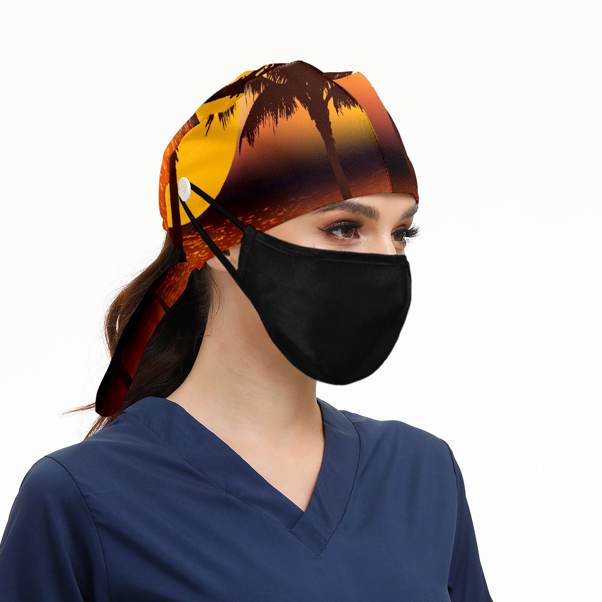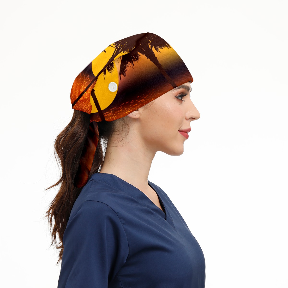 Working Caps with Button & Sweatband Satin Lined Cotton Adjustable Nurse Hats Elastic Band Scrub Cap Surgeon Hat Tropical Sunset Palm Trees