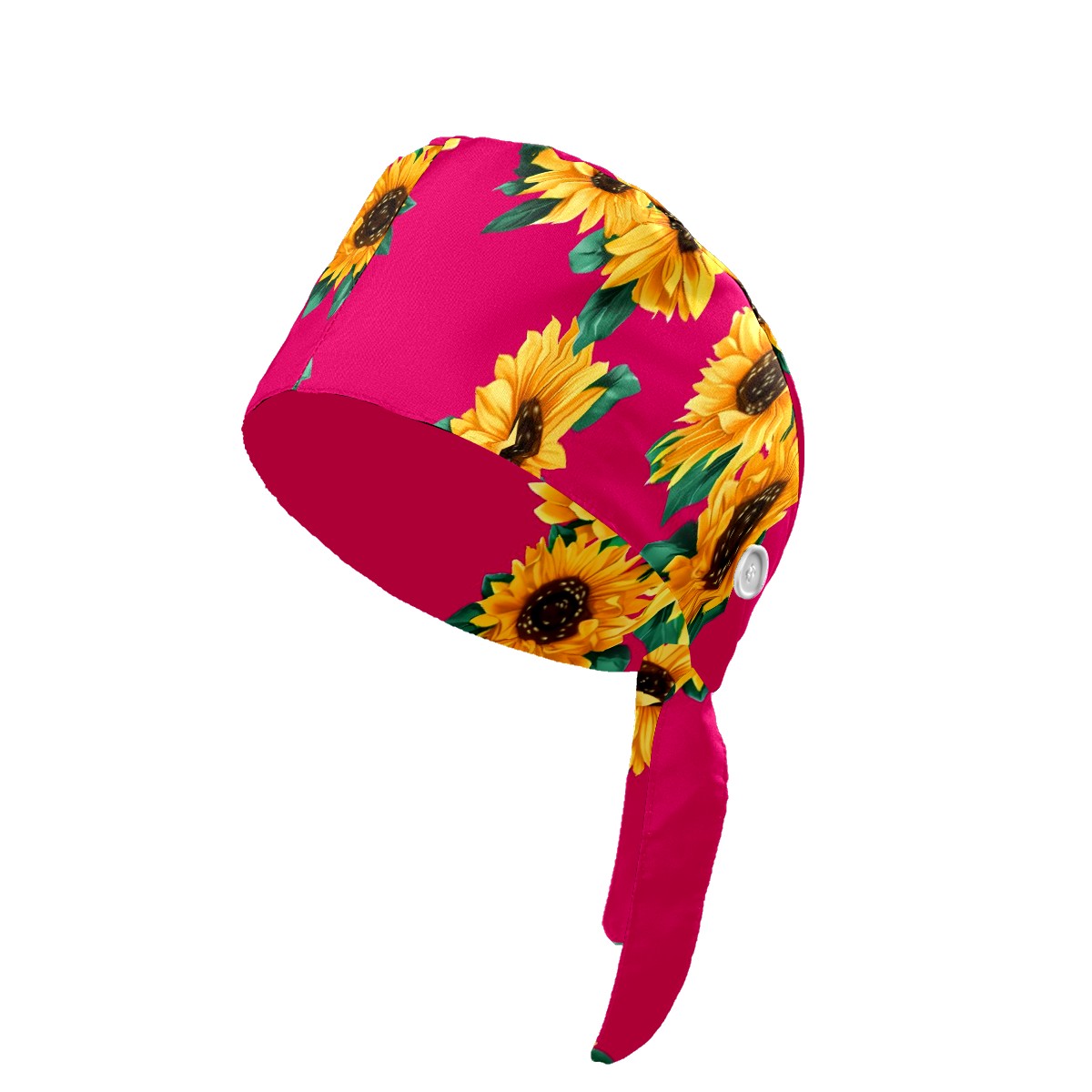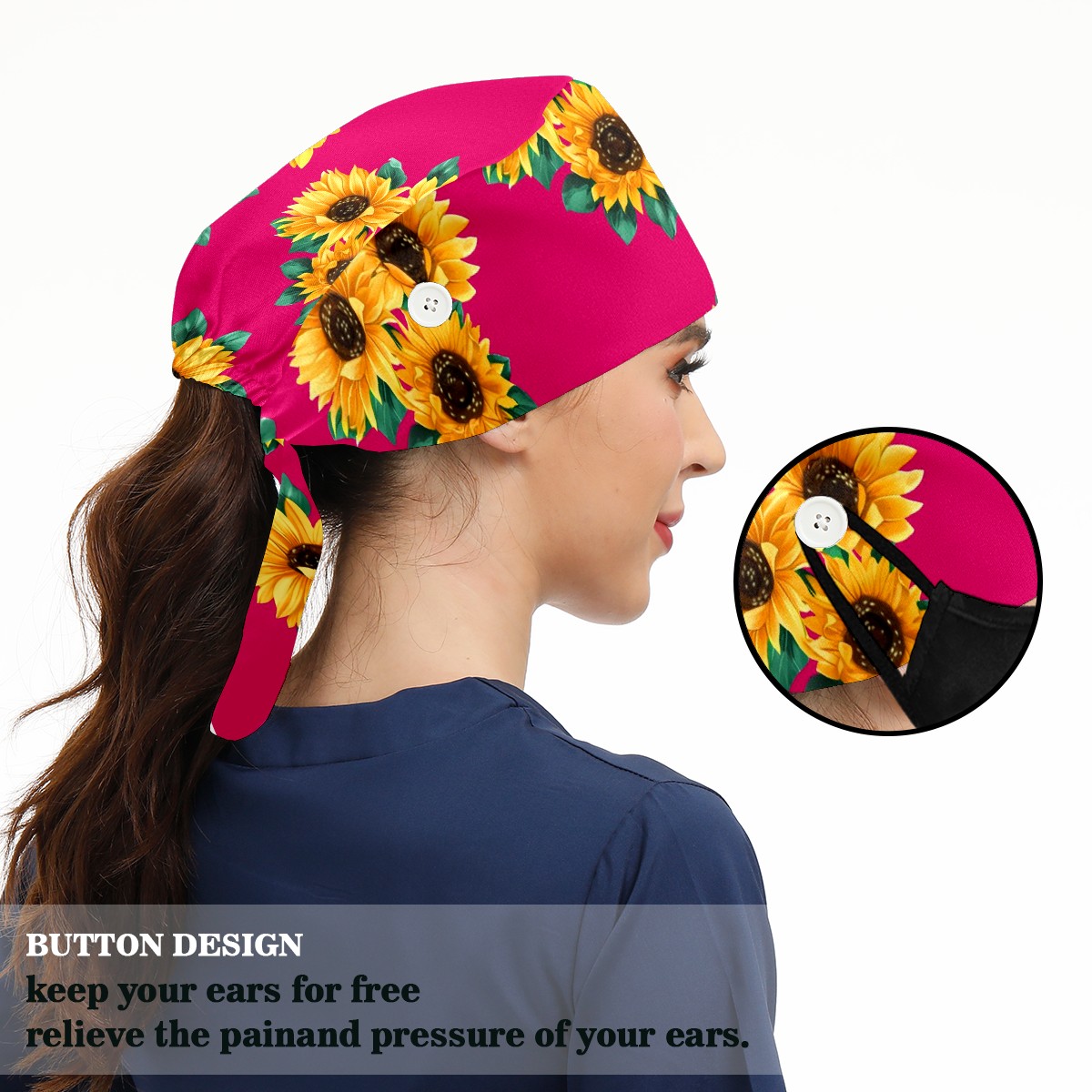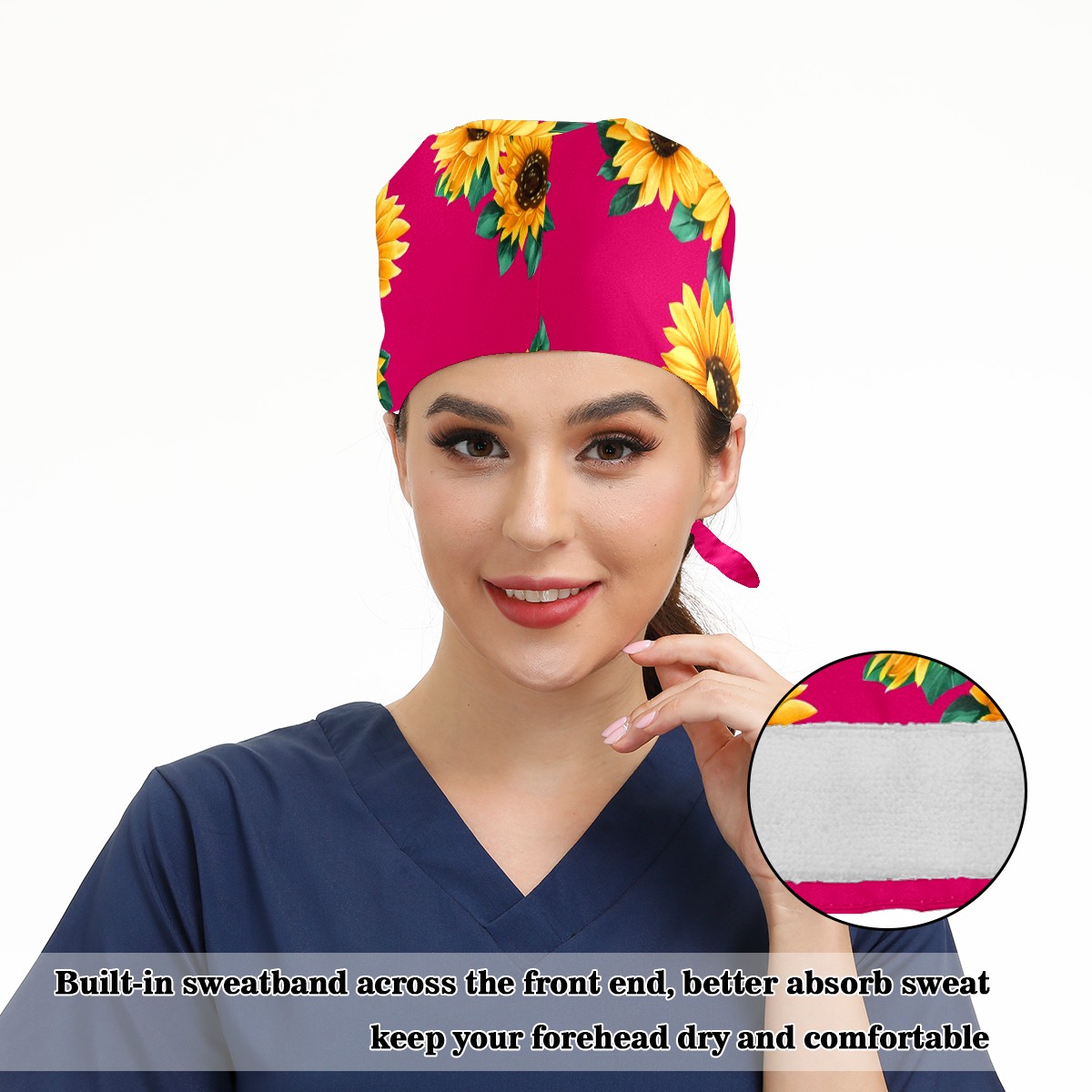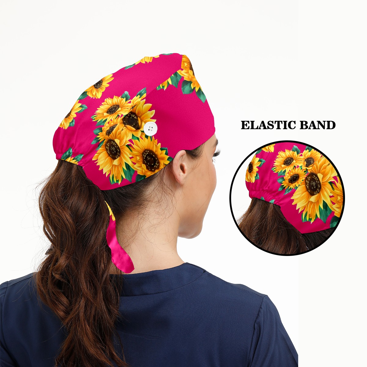 Working Caps with Button & Sweatband Satin Lined Cotton Adjustable Nurse Hats Elastic Band Scrub Cap Surgeon Hat Sunflower