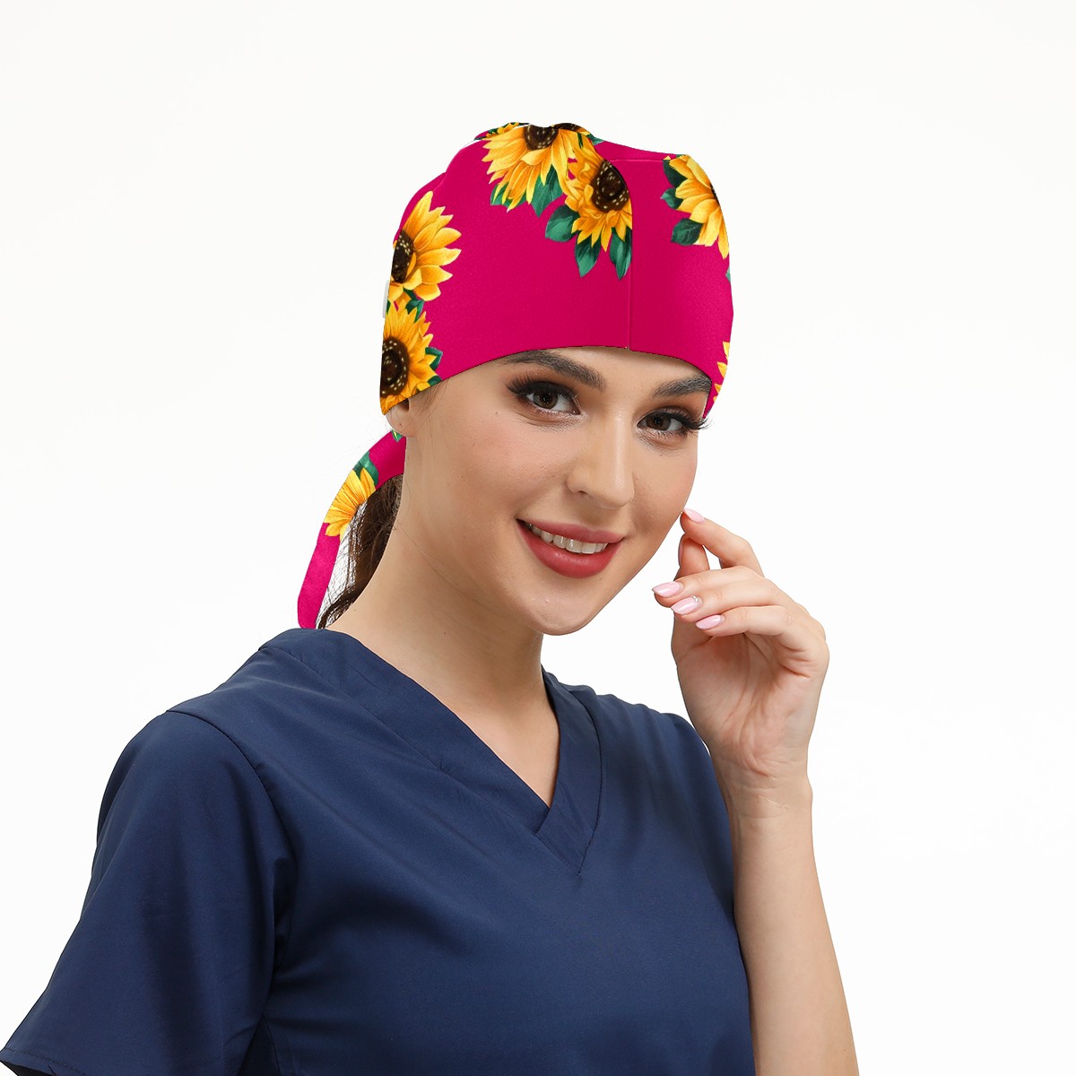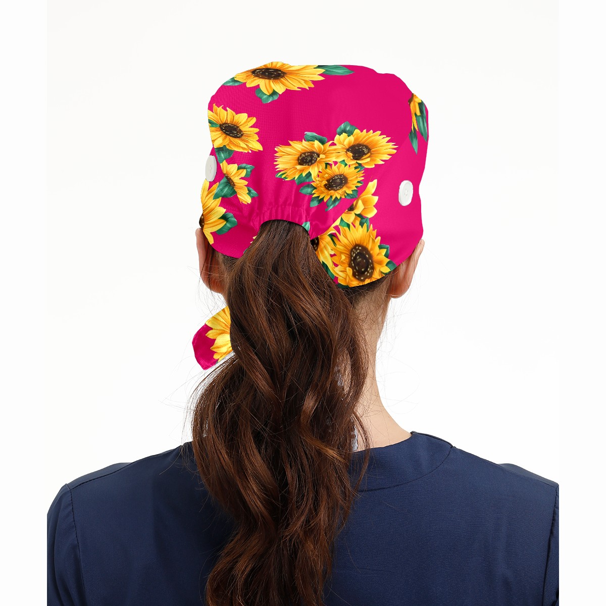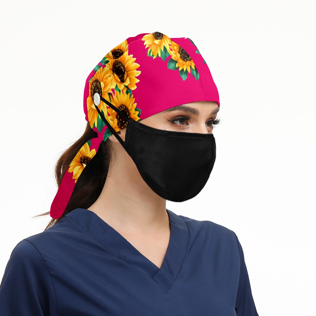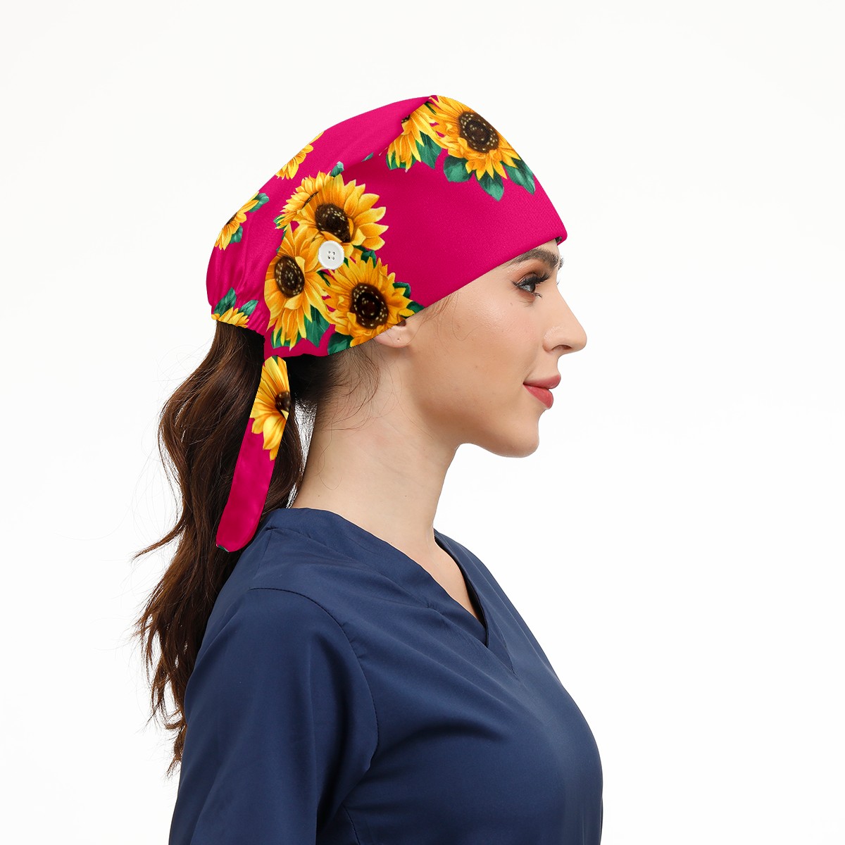 Working Caps with Button & Sweatband Satin Lined Cotton Adjustable Nurse Hats Elastic Band Scrub Cap Surgeon Hat Sunflower