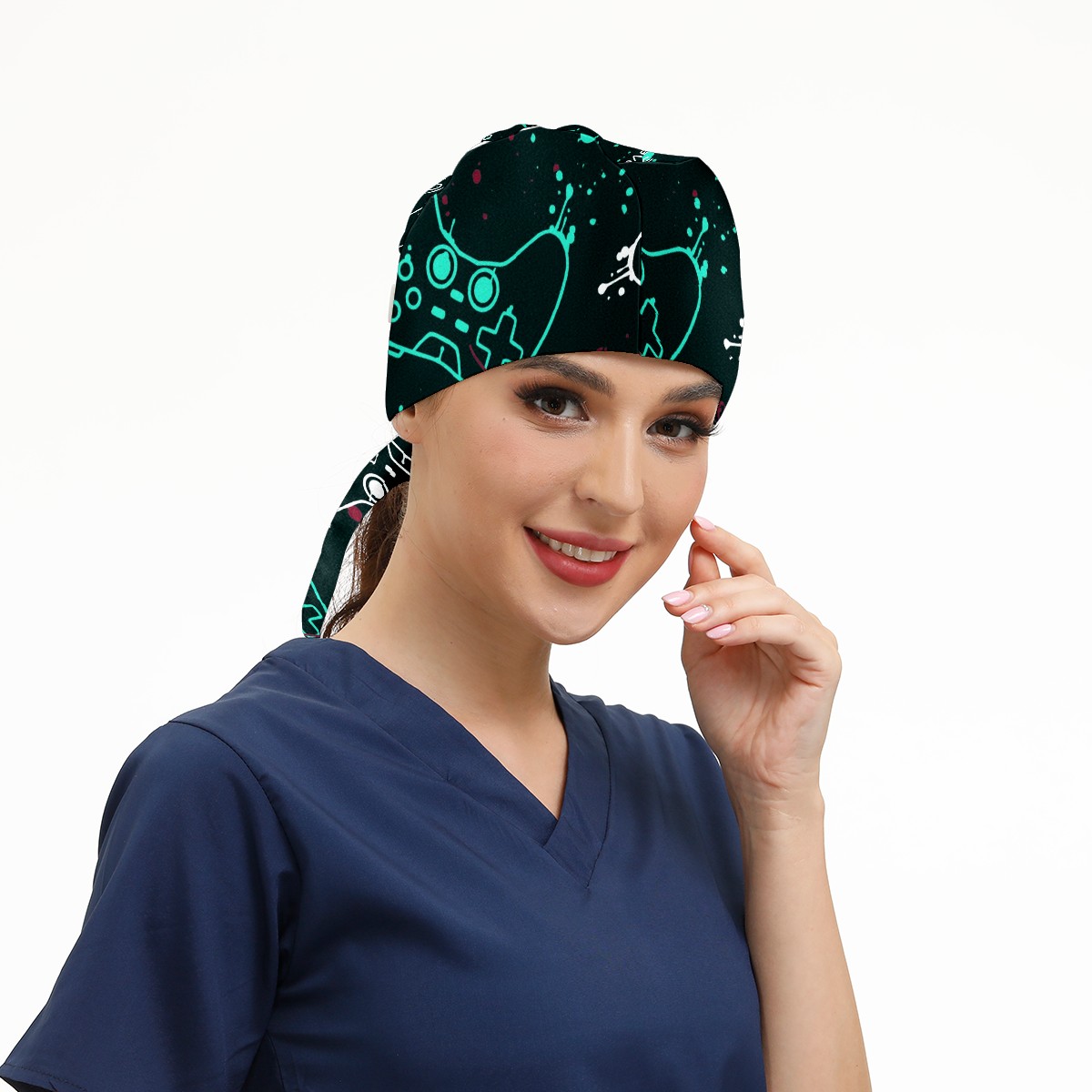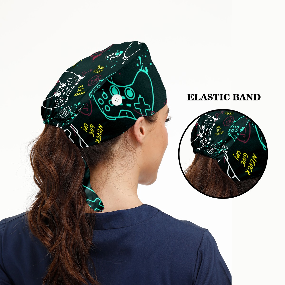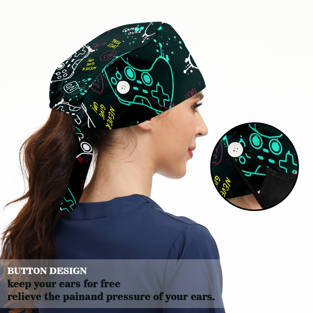 Working Caps with Button & Sweatband Satin Lined Cotton Adjustable Nurse Hats Elastic Band Scrub Cap Surgeon Hat Gamepad Video Game Joystick