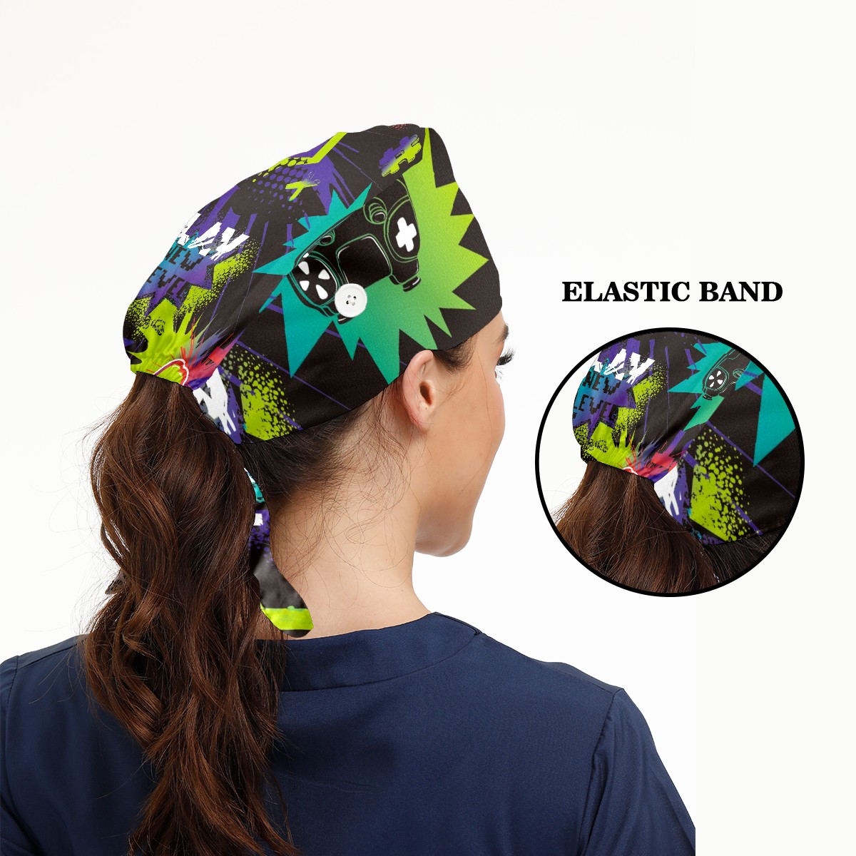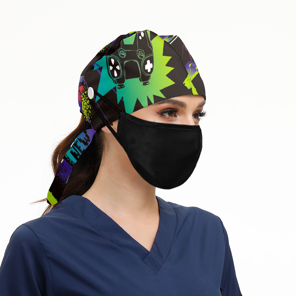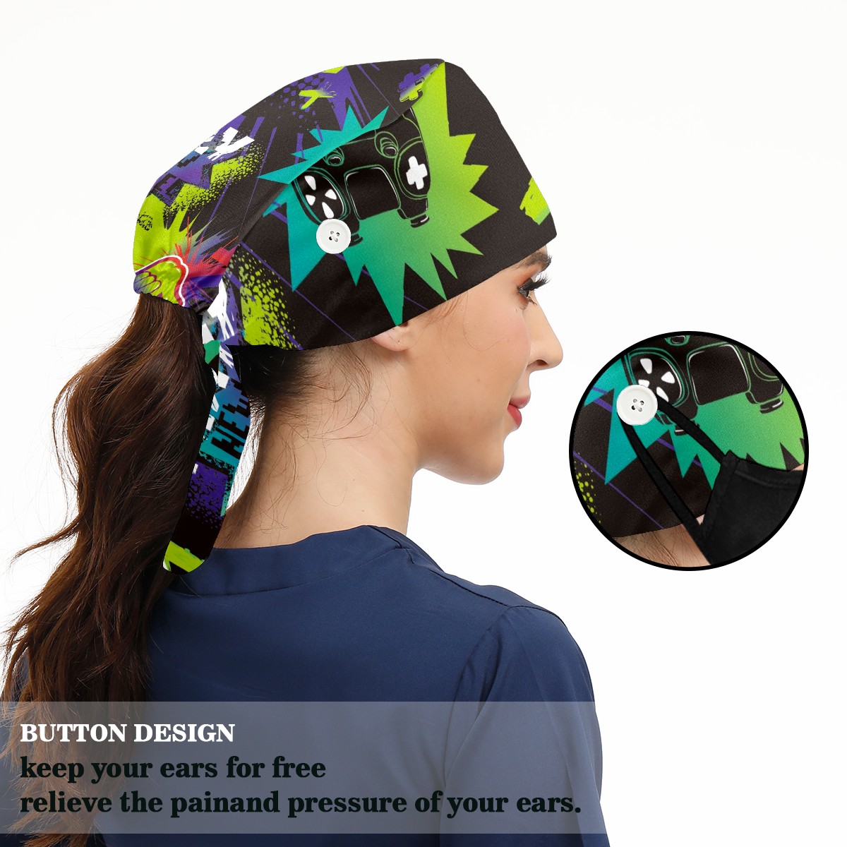 Working Caps with Button & Sweatband Satin Lined Cotton Adjustable Nurse Hats Elastic Band Scrub Cap Surgeon Hat Gamepad Game Joystick
