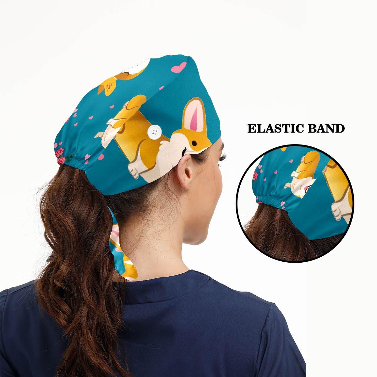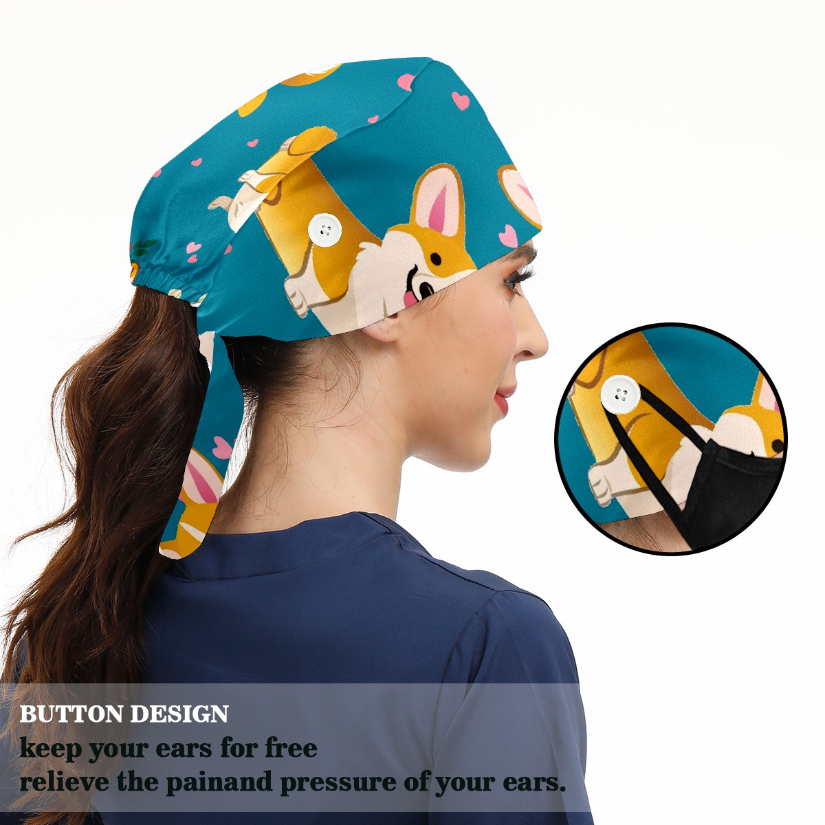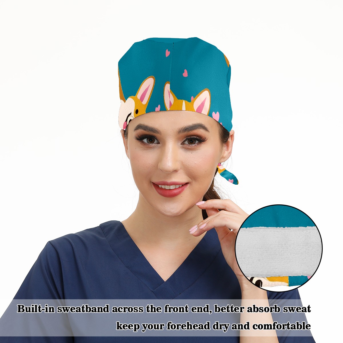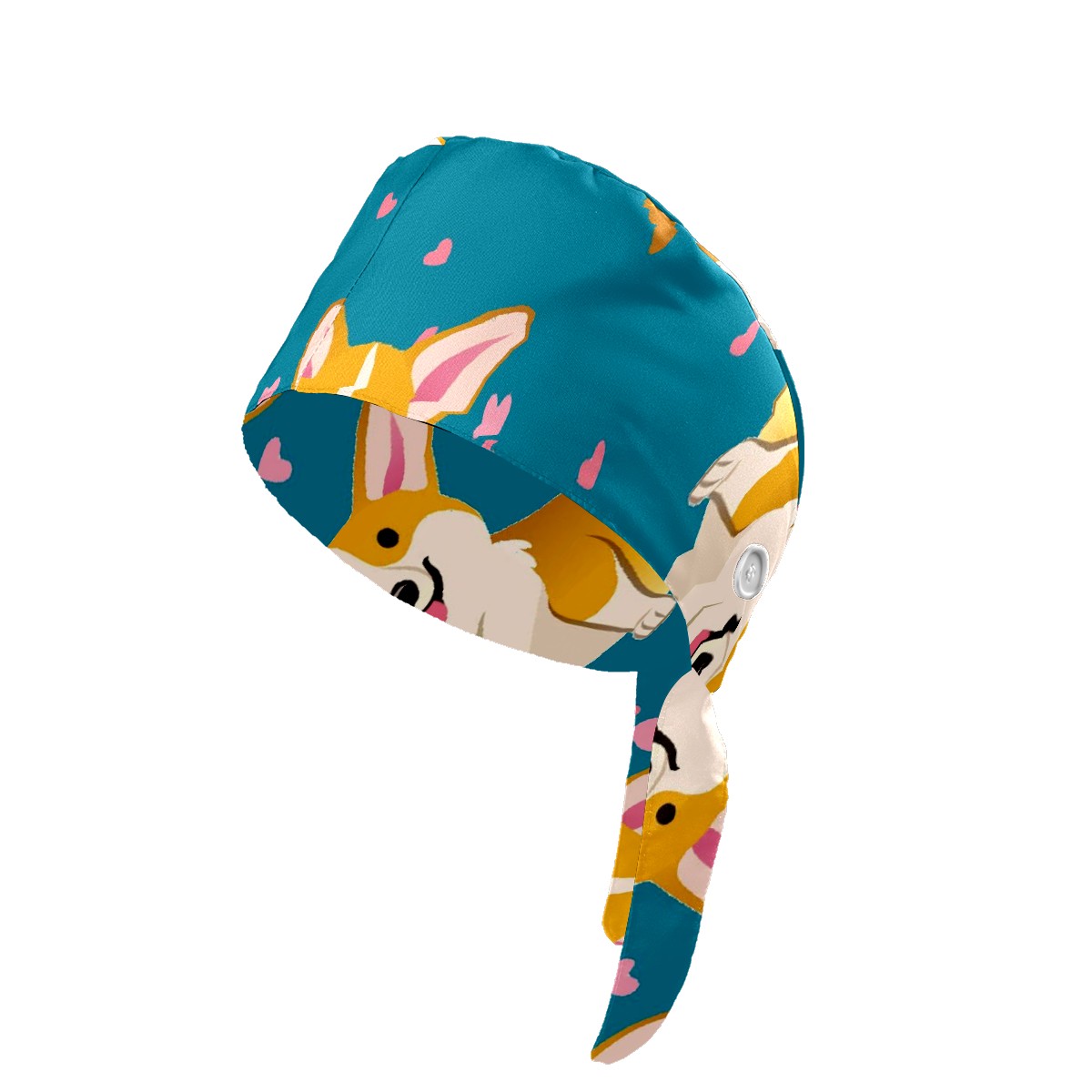 Working Caps with Button & Sweatband Satin Lined Cotton Adjustable Nurse Hats Elastic Band Scrub Cap Surgeon Hat Cute Corgi Dog