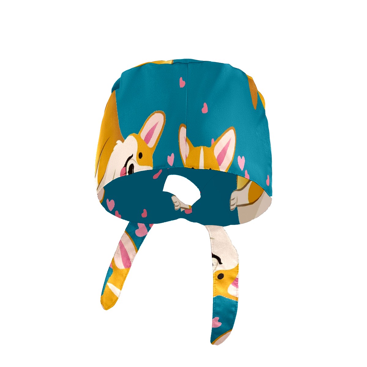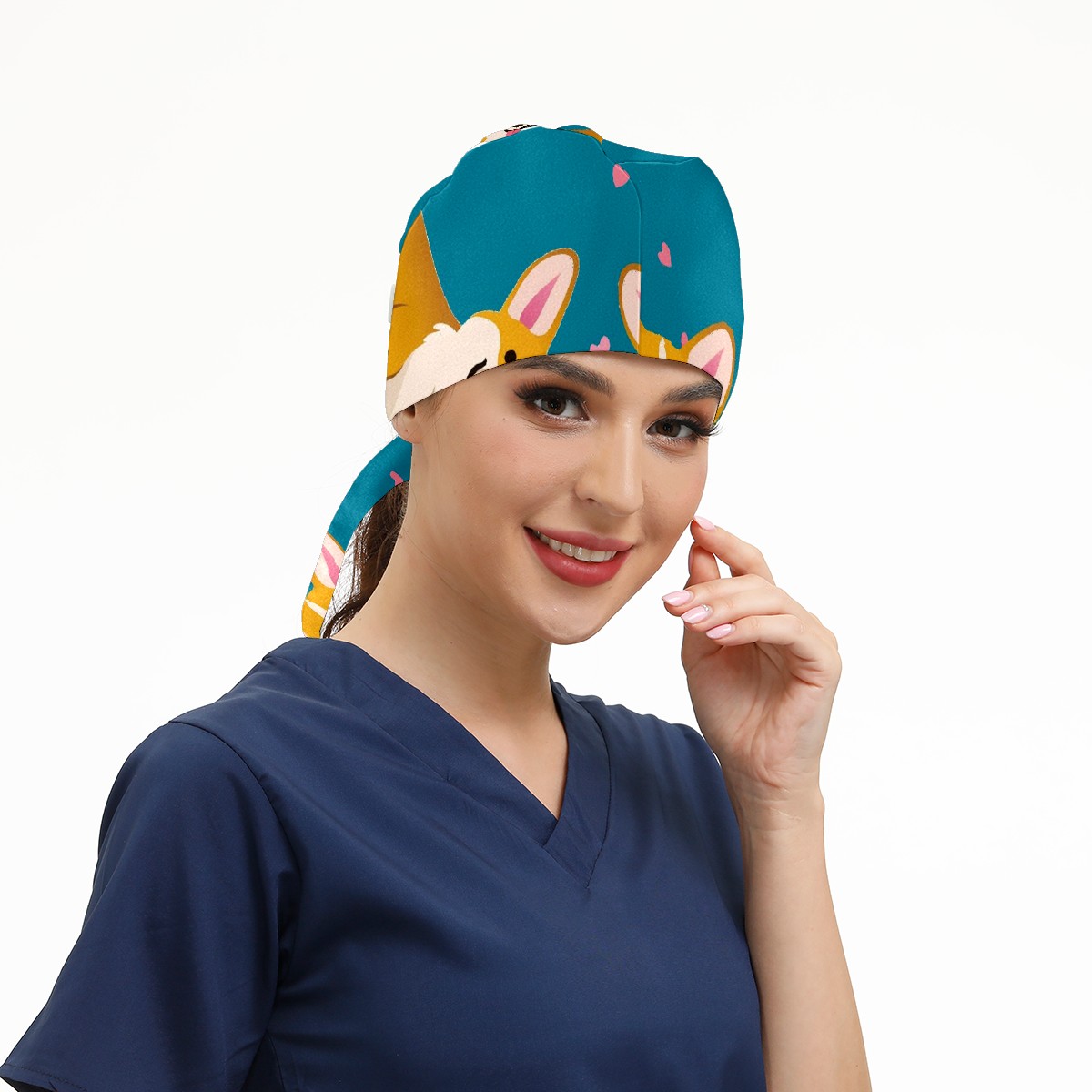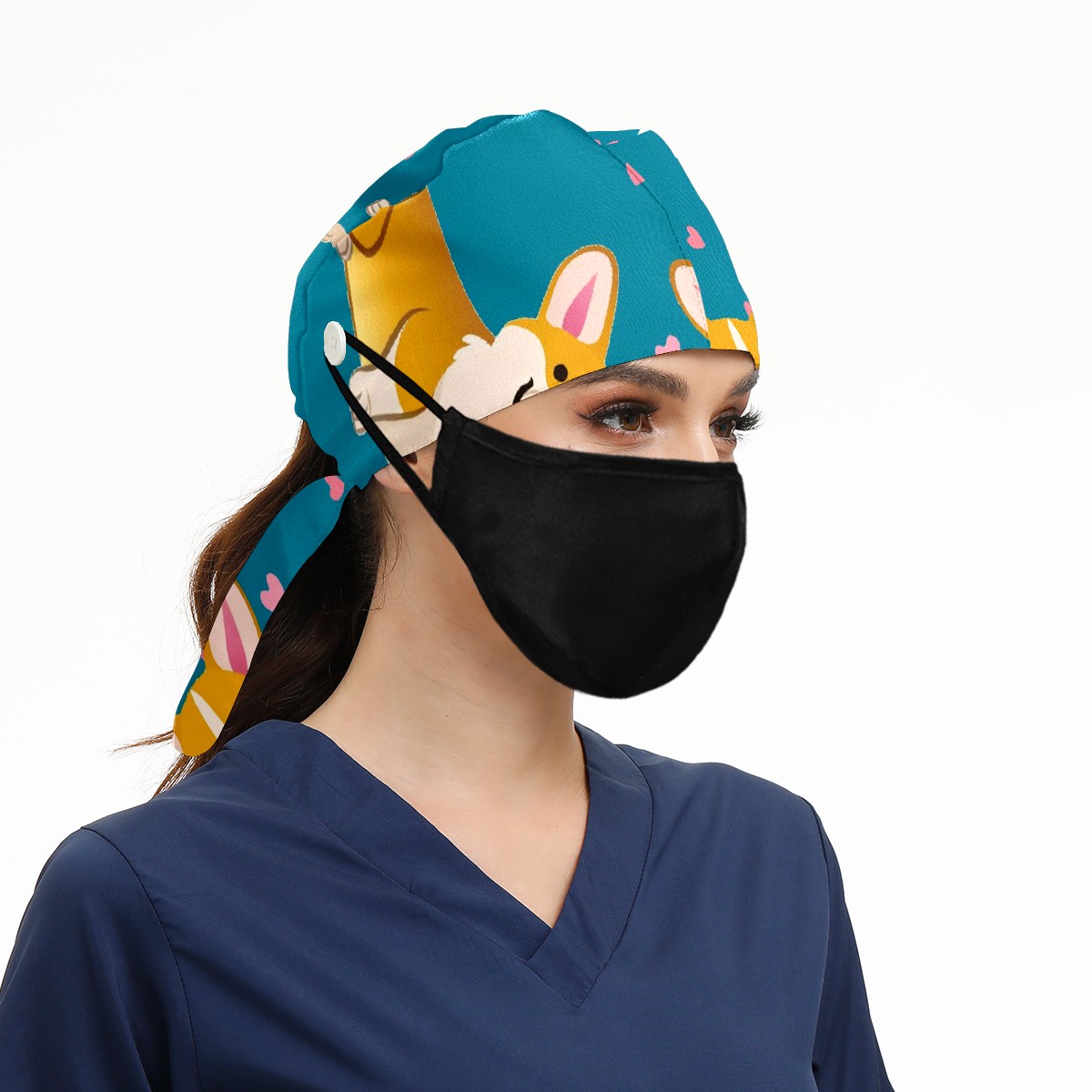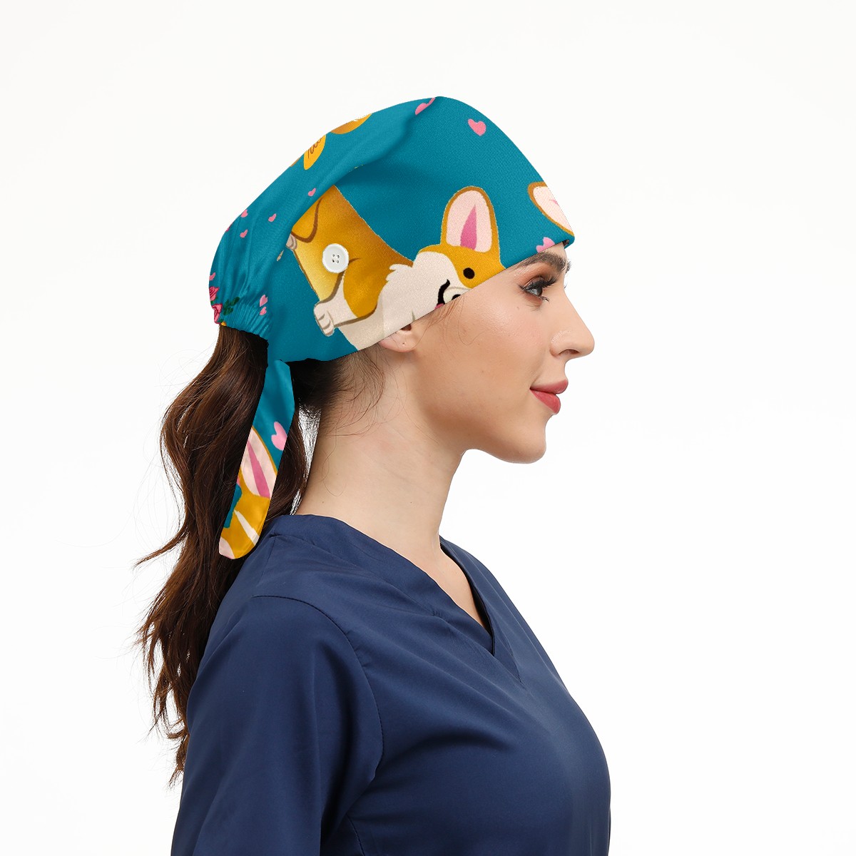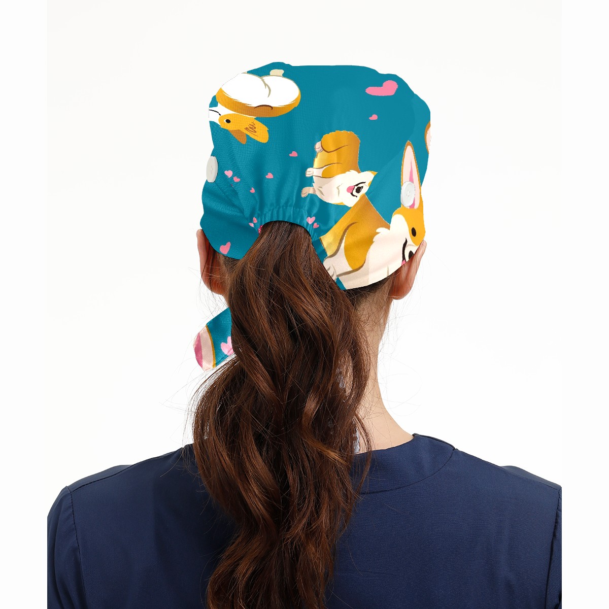 Working Caps with Button & Sweatband Satin Lined Cotton Adjustable Nurse Hats Elastic Band Scrub Cap Surgeon Hat Cute Corgi Dog