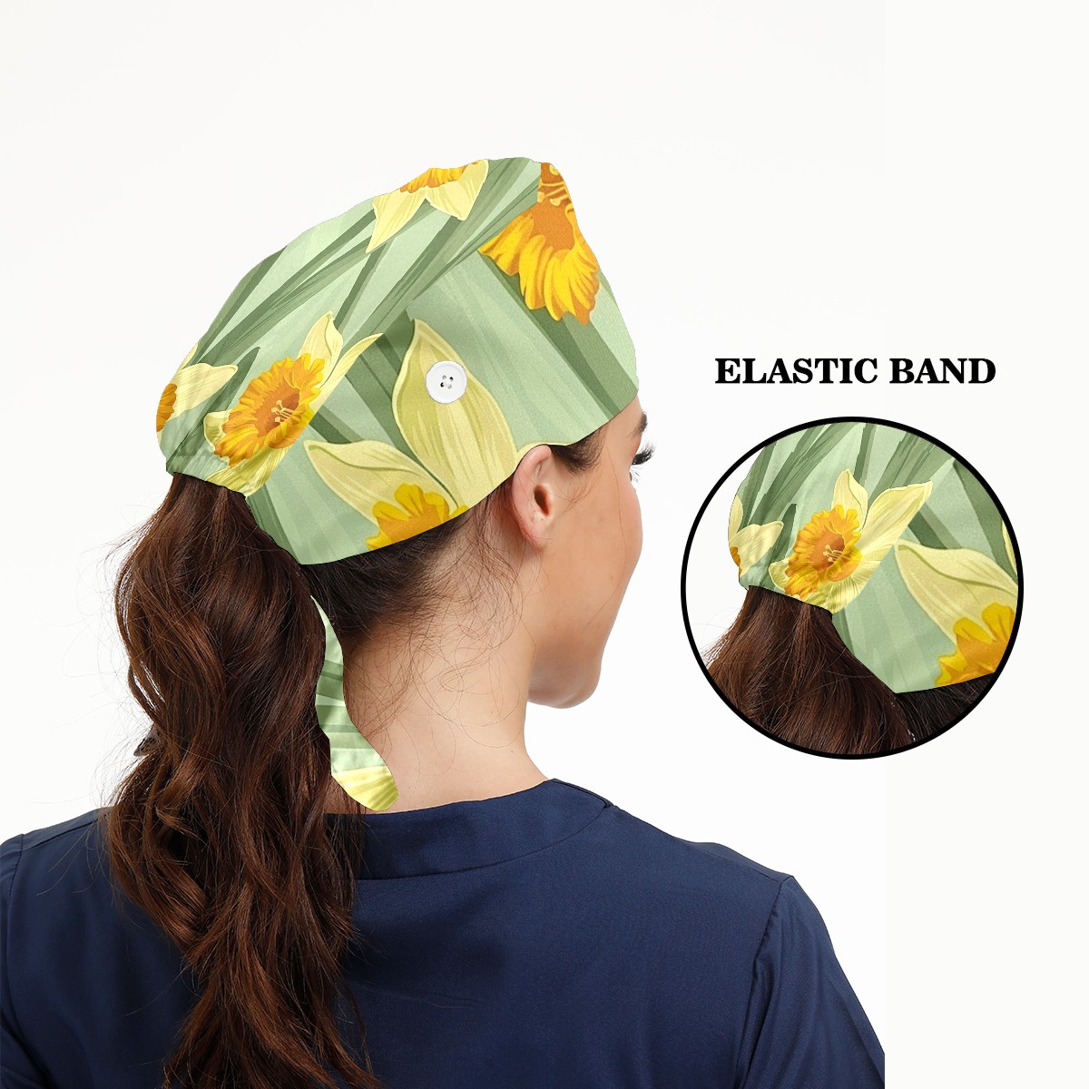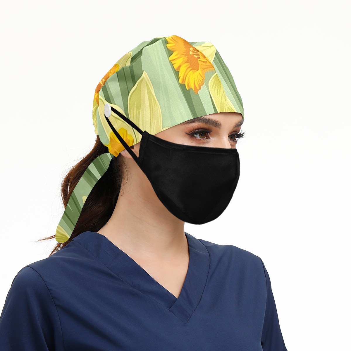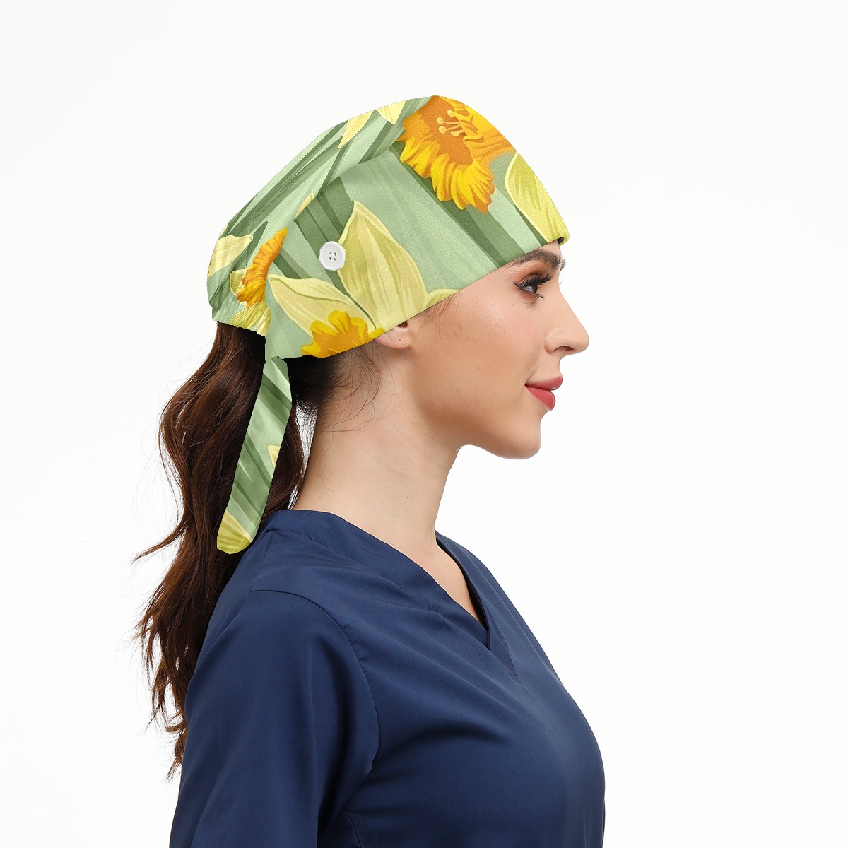 Working Caps with Button & Sweatband Satin Lined Cotton Adjustable Nurse Hats Elastic Band Scrub Cap Surgeon Hat Flower