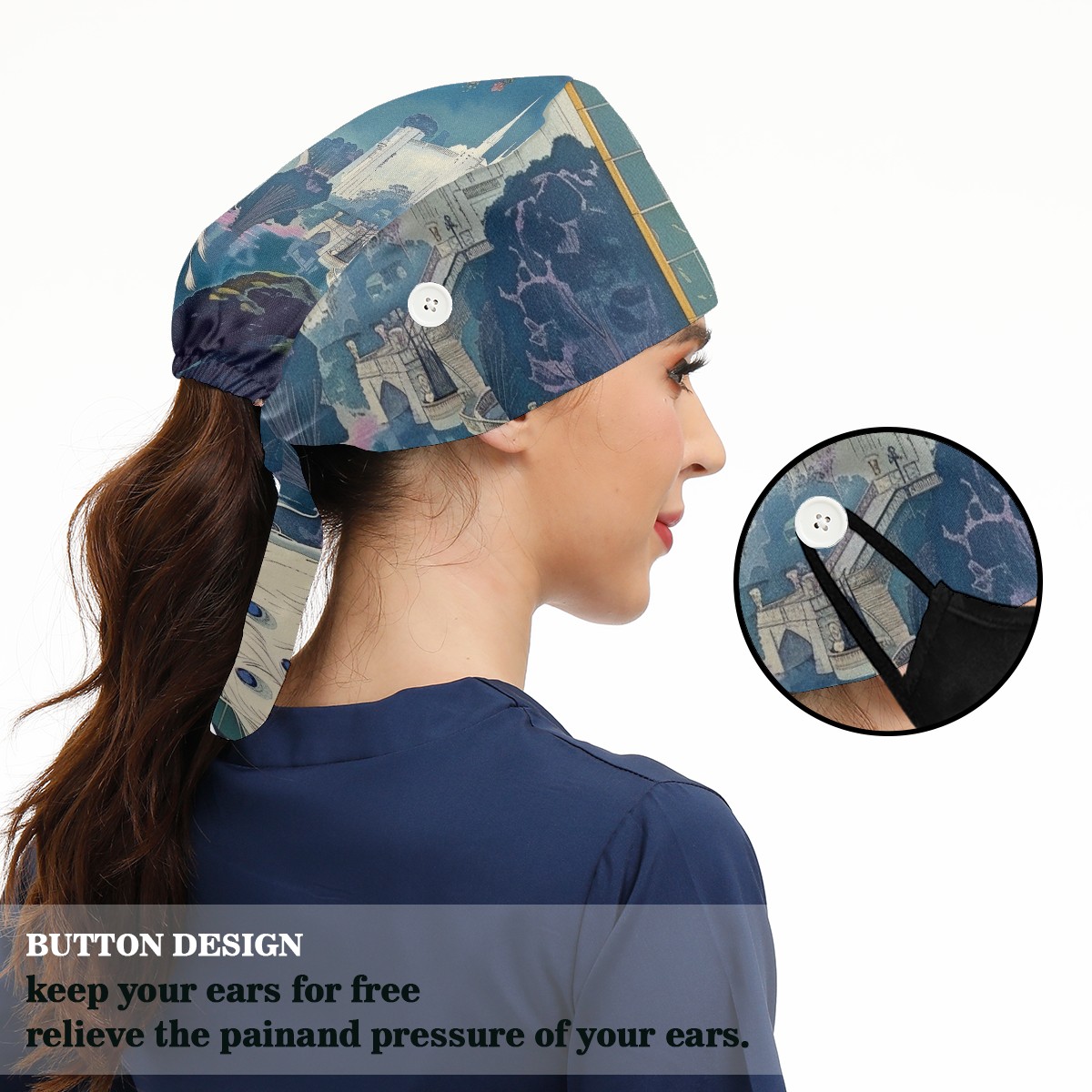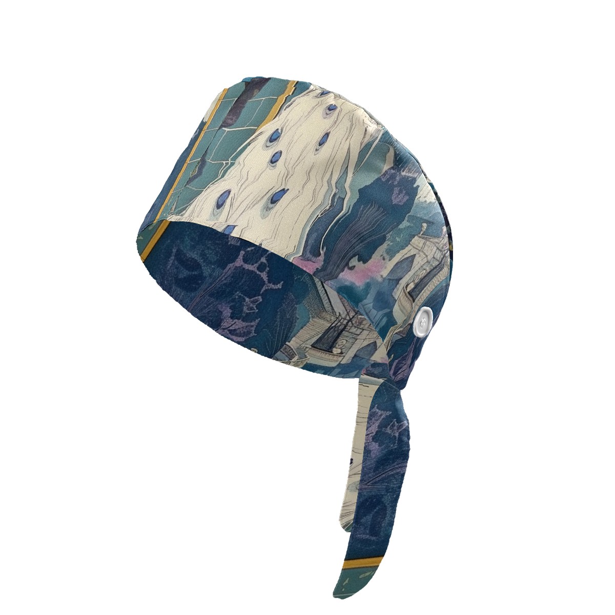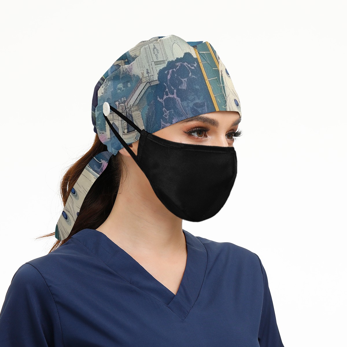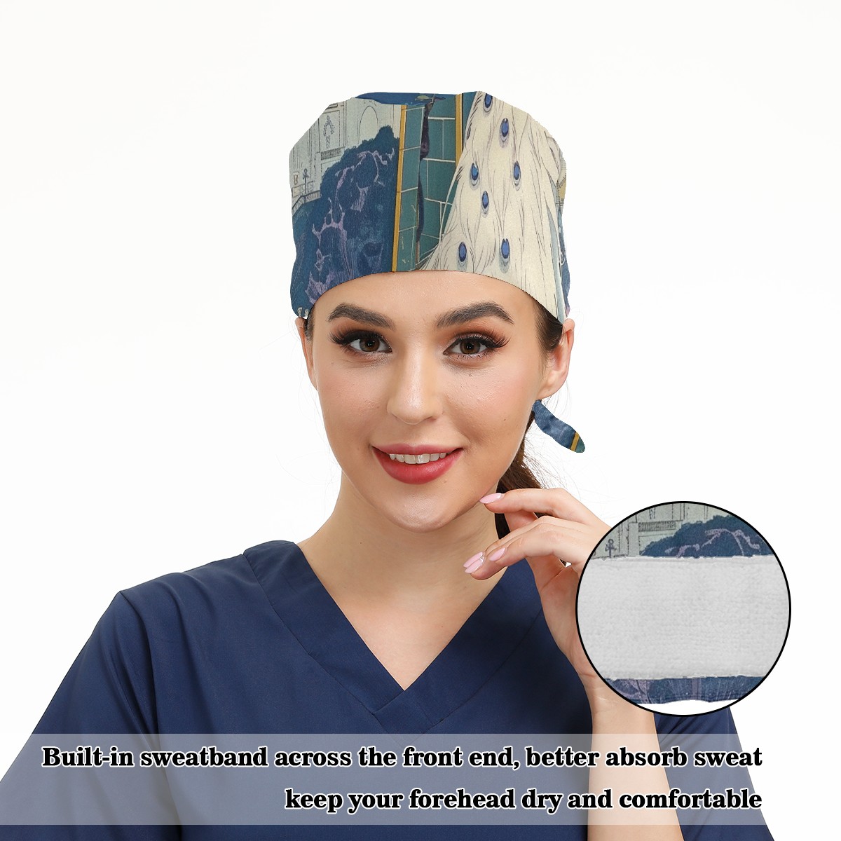 Working Caps with Button & Sweatband Satin Lined Cotton Adjustable Nurse Hats Elastic Band Scrub Cap Surgeon Hat Peacock