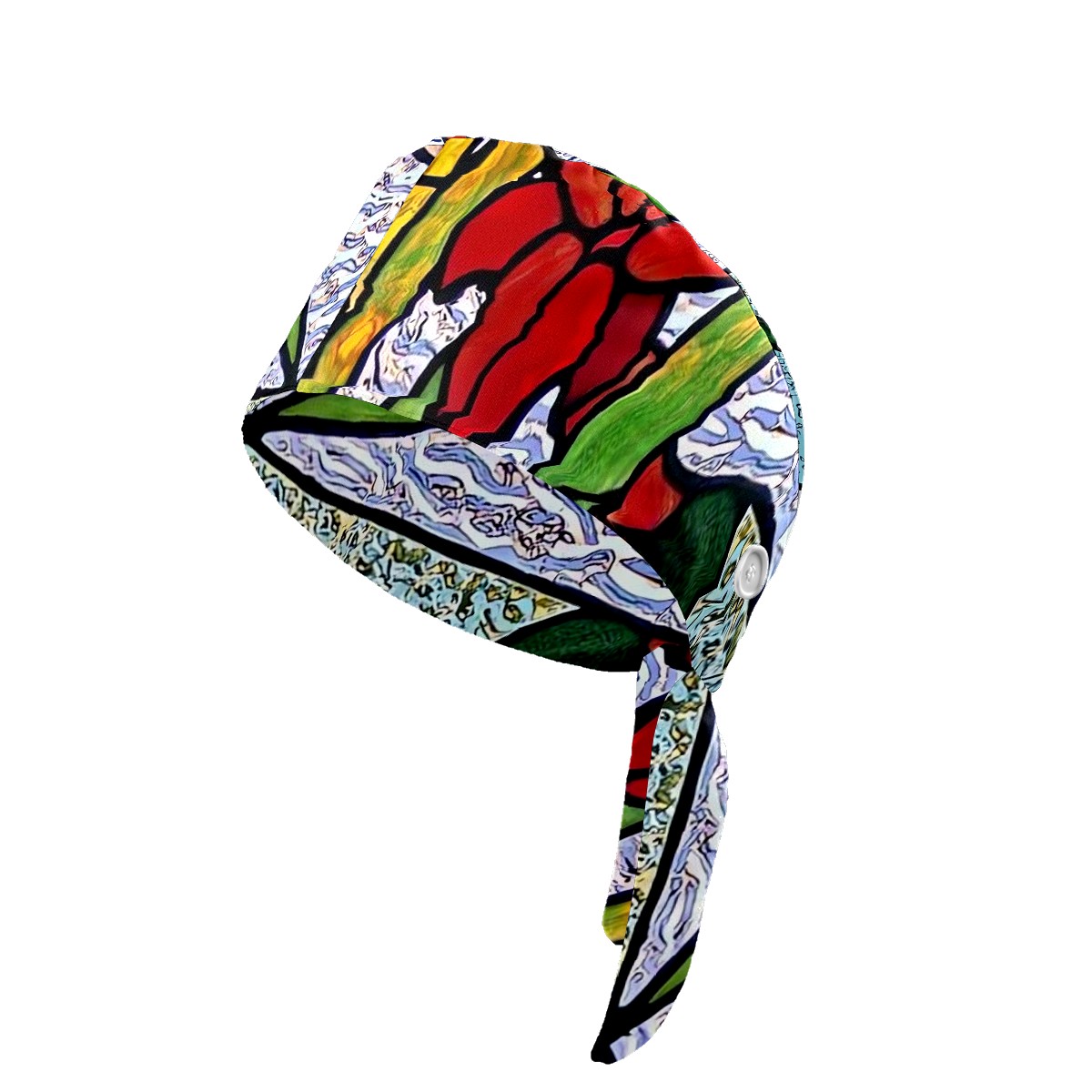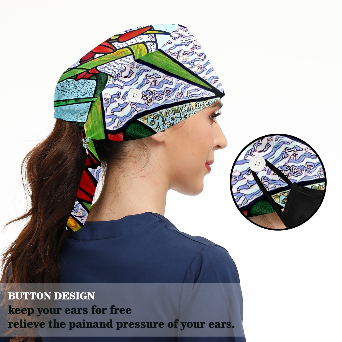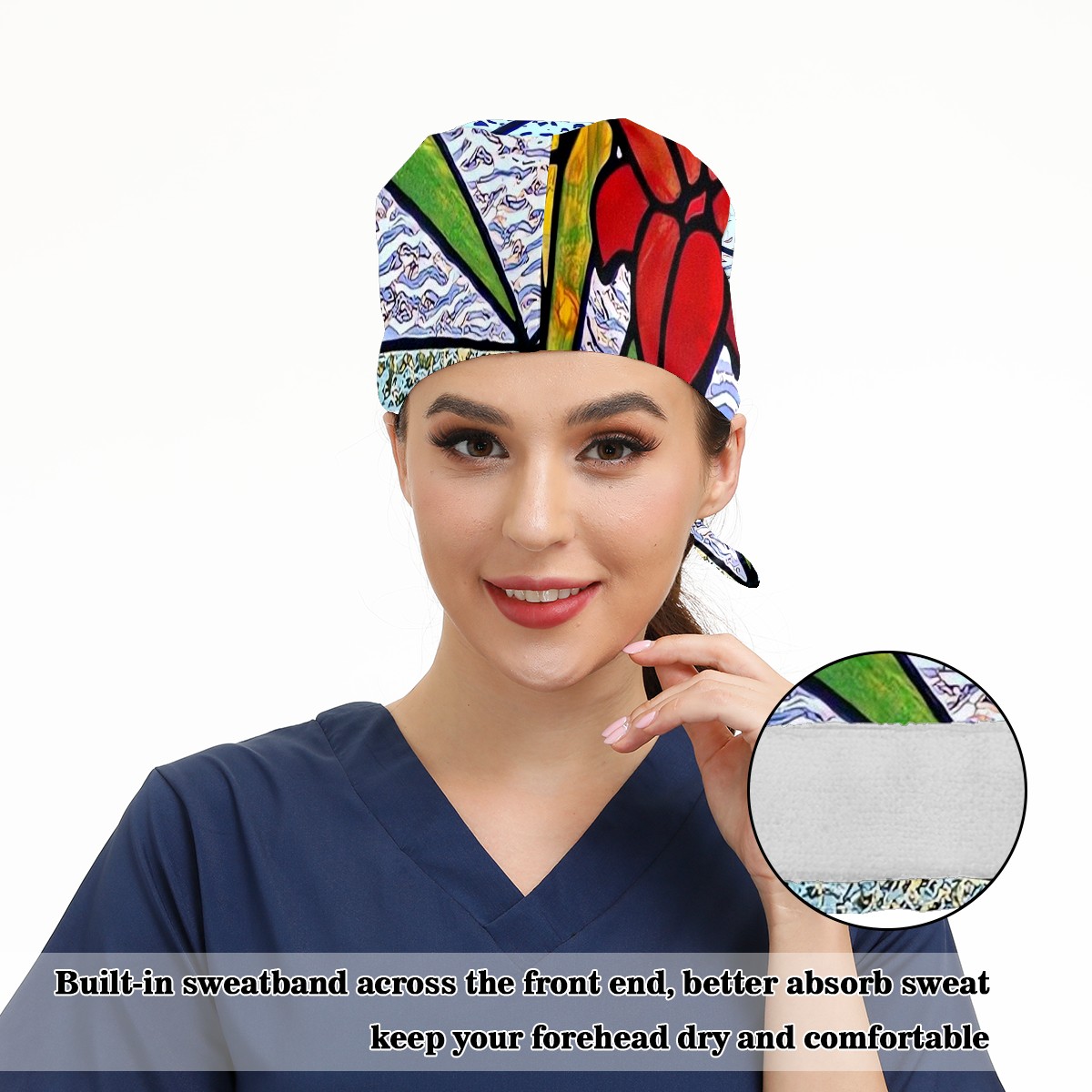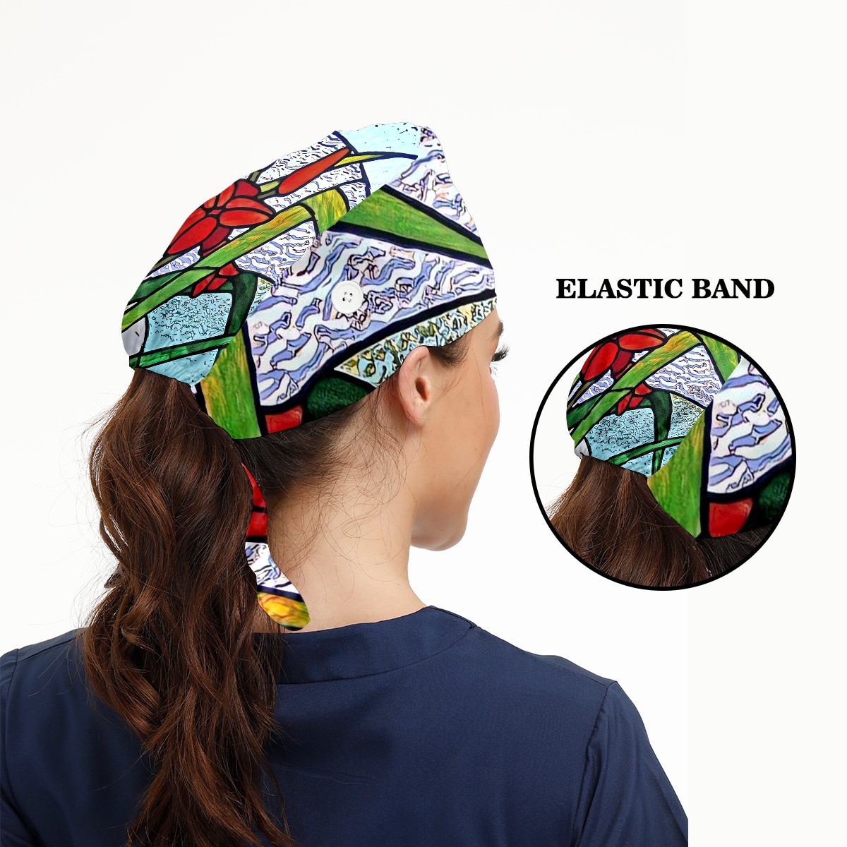 Working Caps with Button & Sweatband Satin Lined Cotton Adjustable Nurse Hats Elastic Band Scrub Cap Surgeon Hat Stained Glass