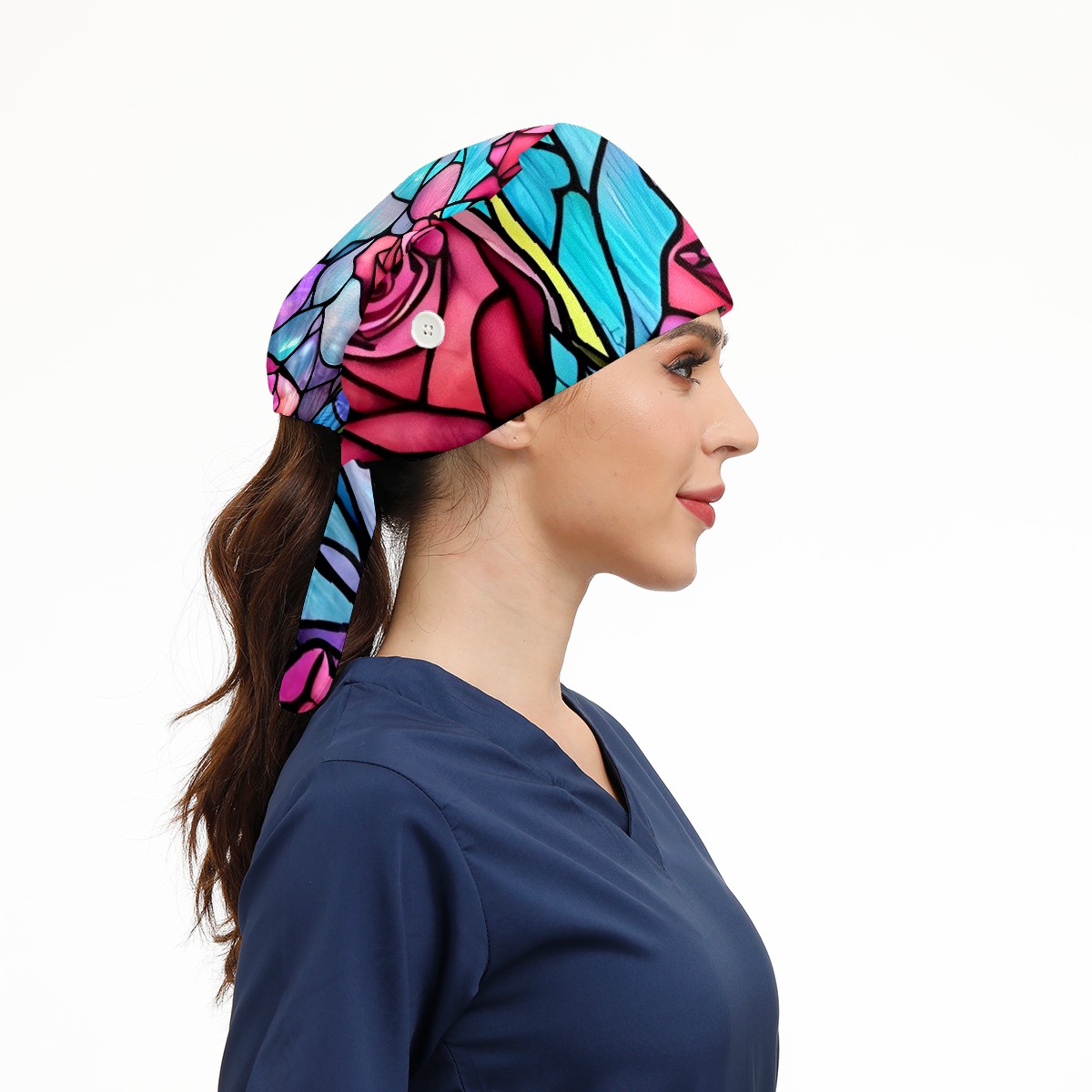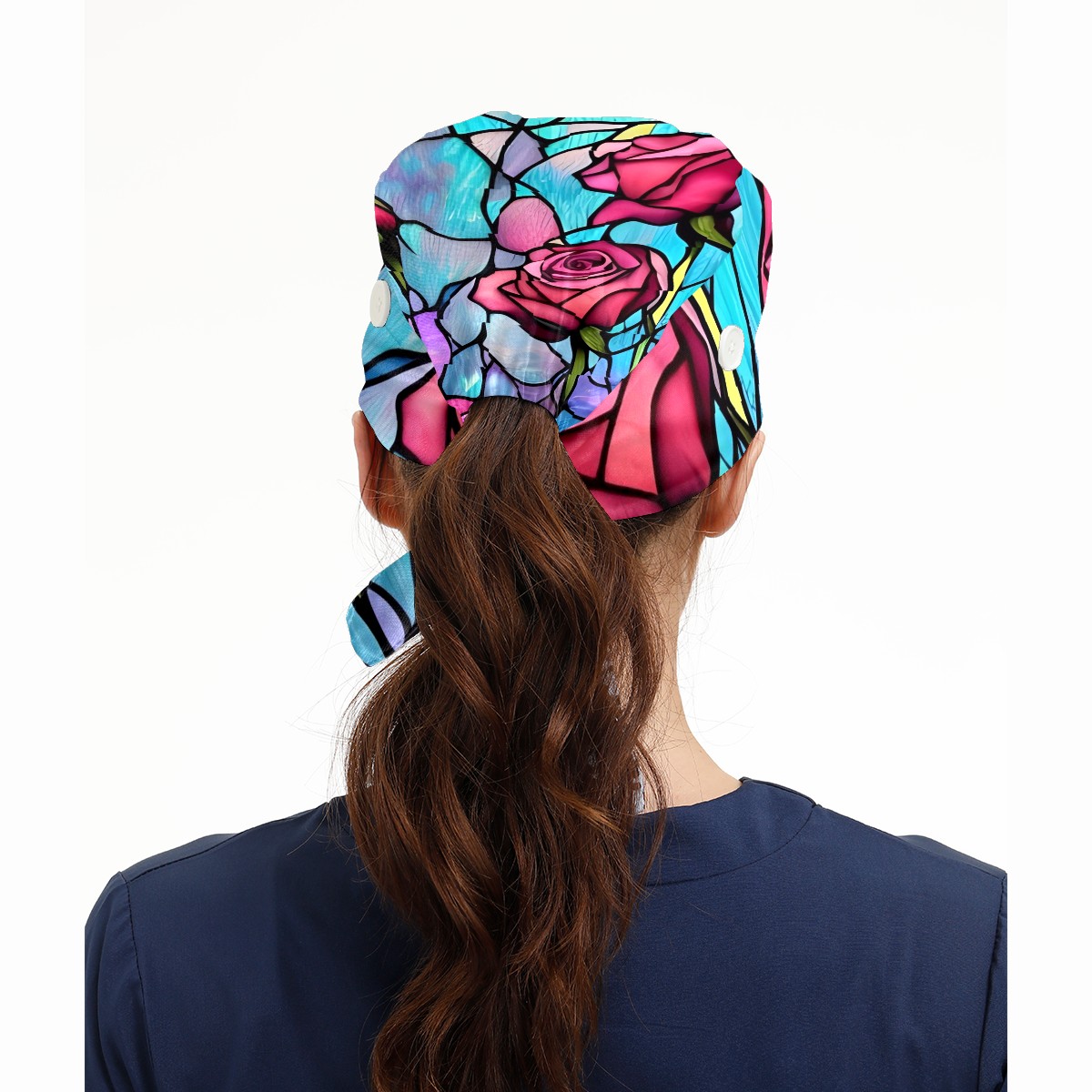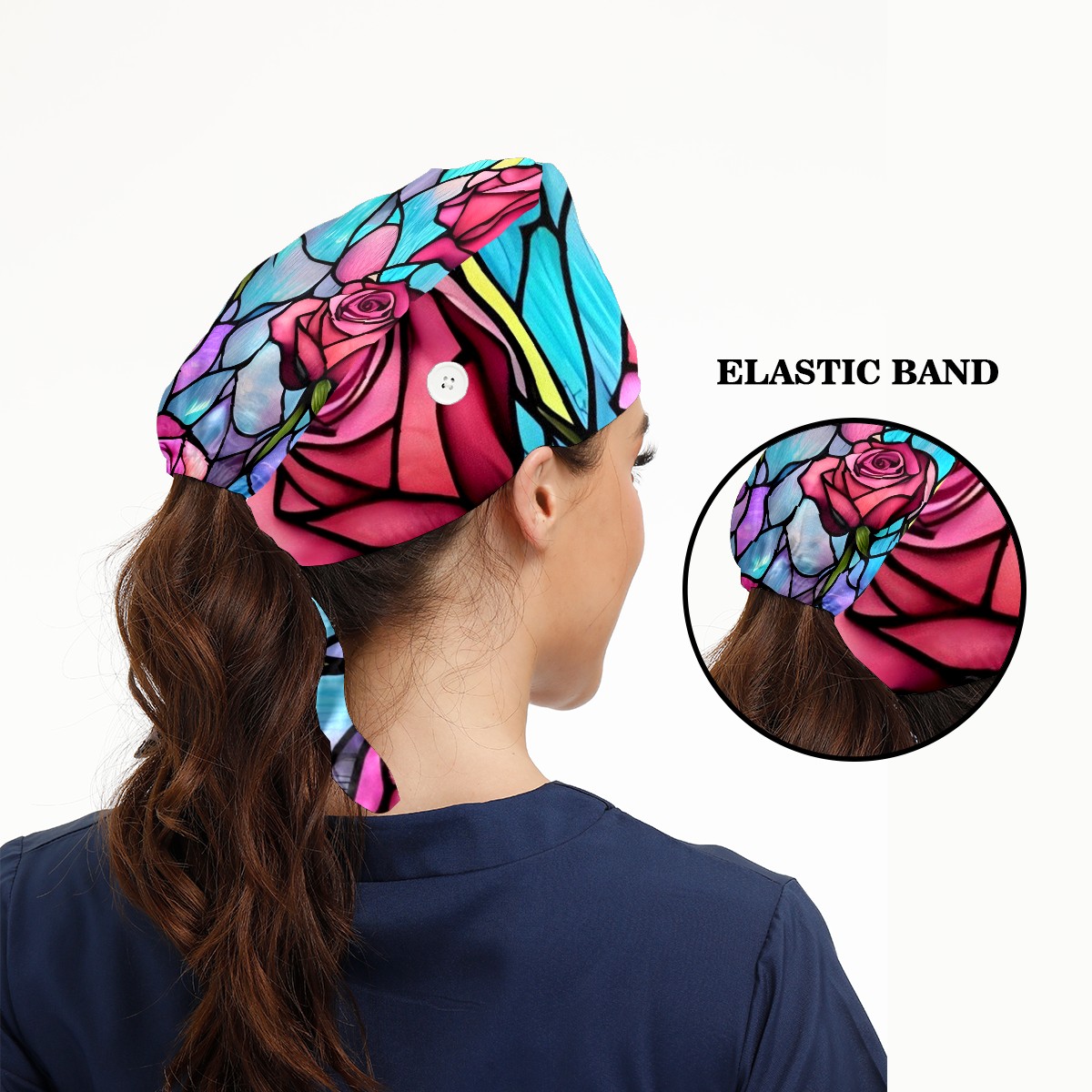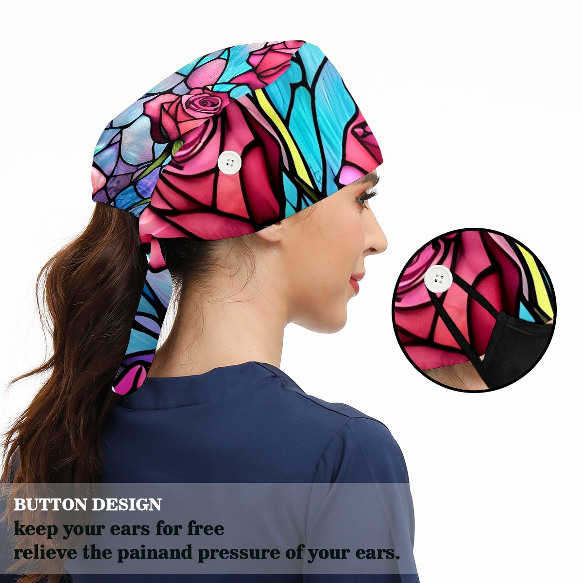 Working Caps with Button & Sweatband Satin Lined Cotton Adjustable Nurse Hats Elastic Band Scrub Cap Surgeon Hat Stained Glass Roses