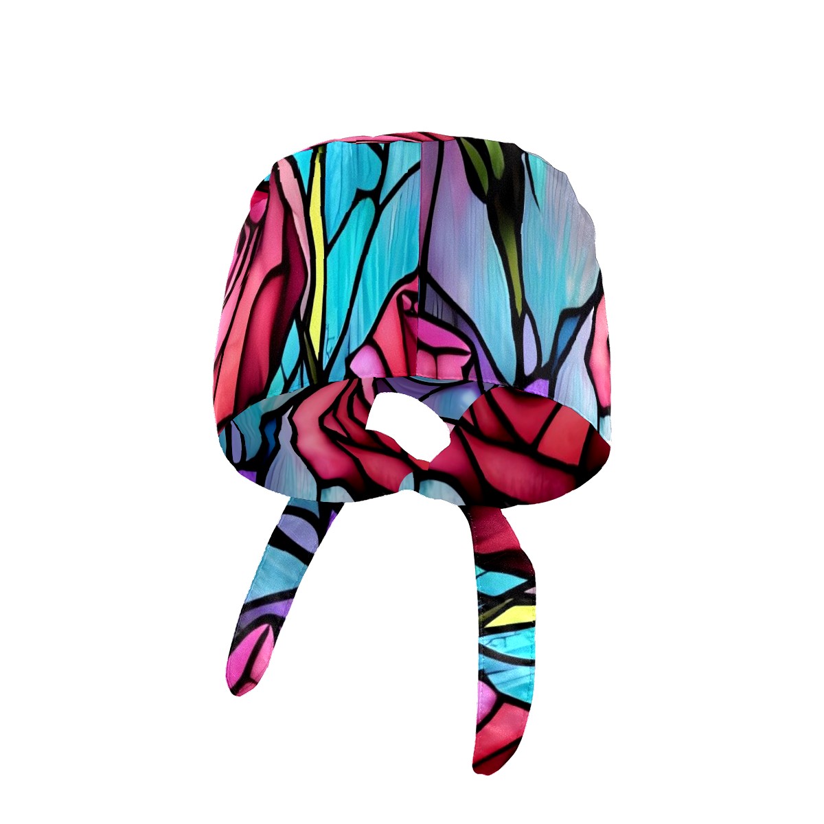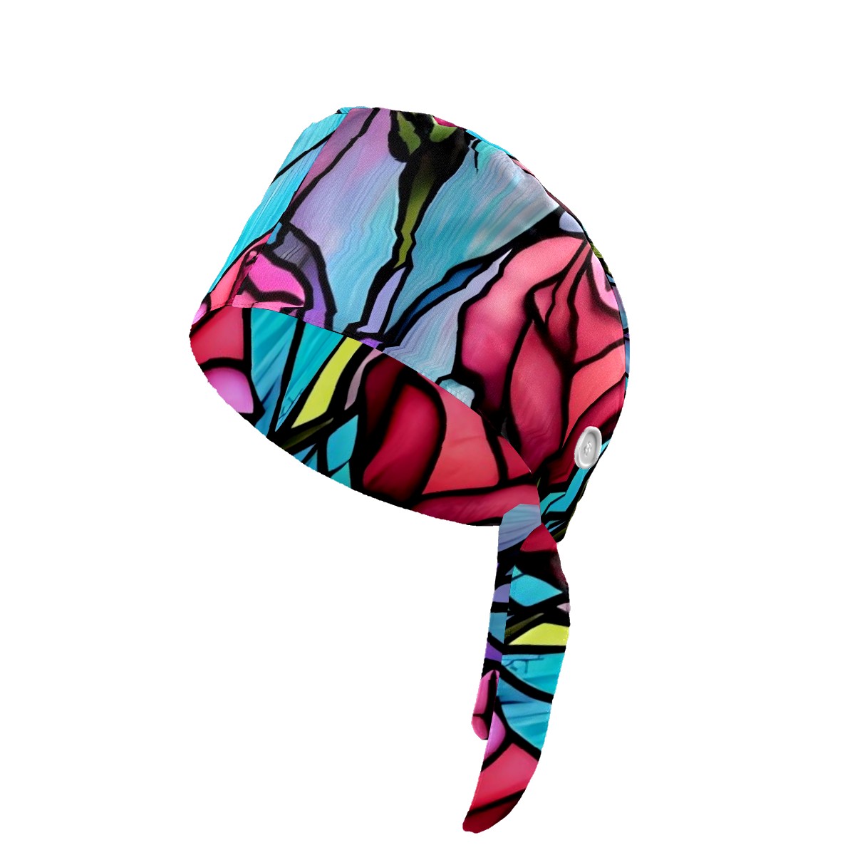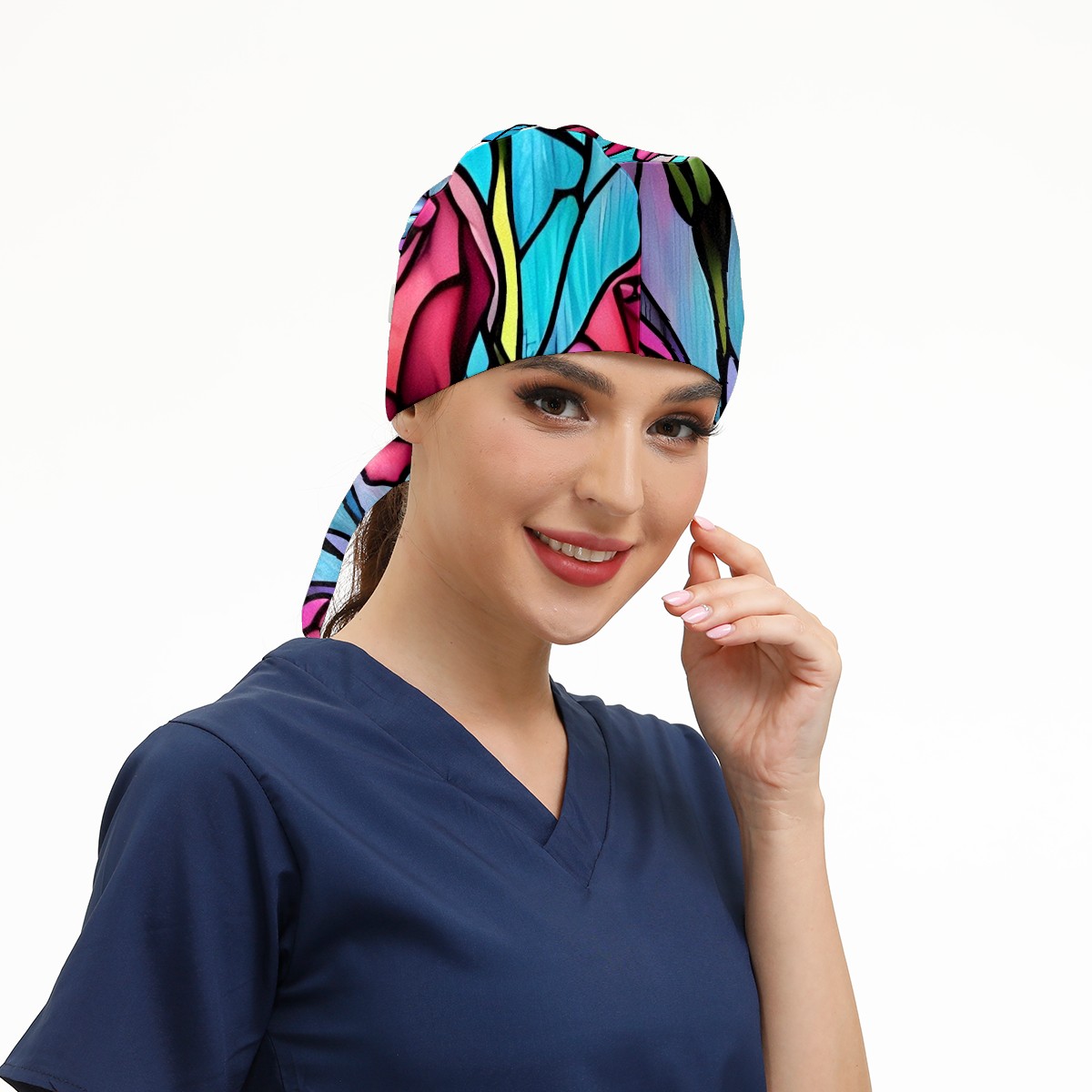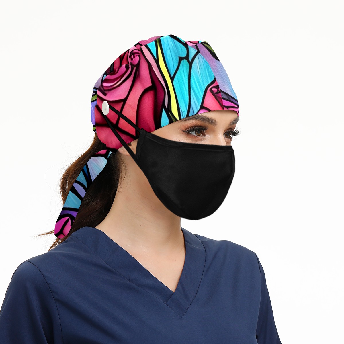 Working Caps with Button & Sweatband Satin Lined Cotton Adjustable Nurse Hats Elastic Band Scrub Cap Surgeon Hat Stained Glass Roses