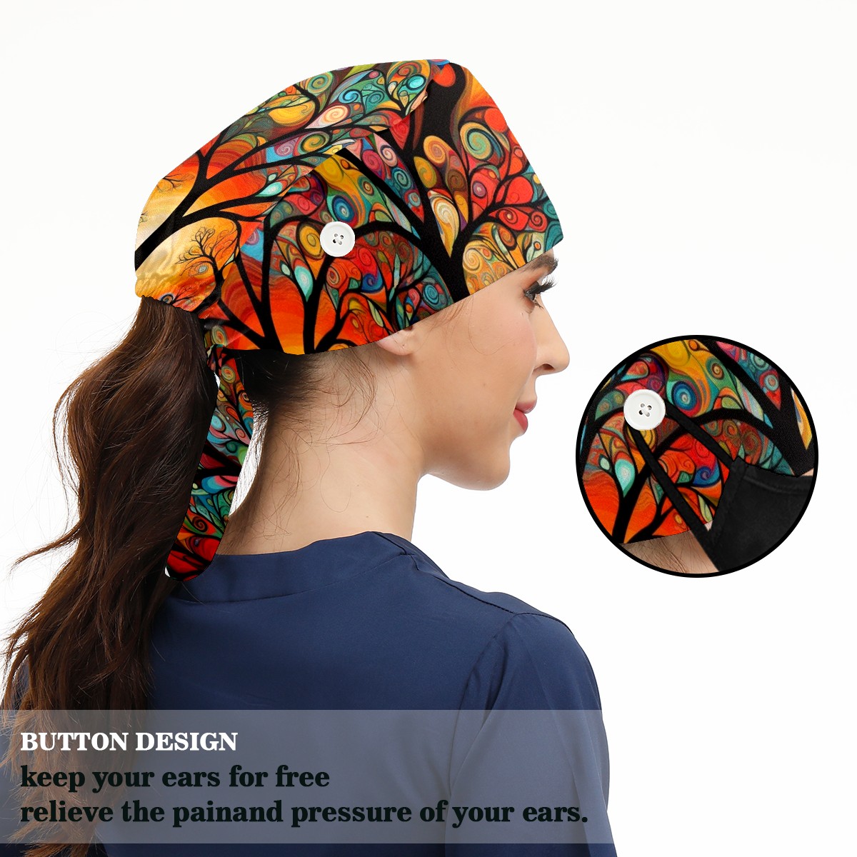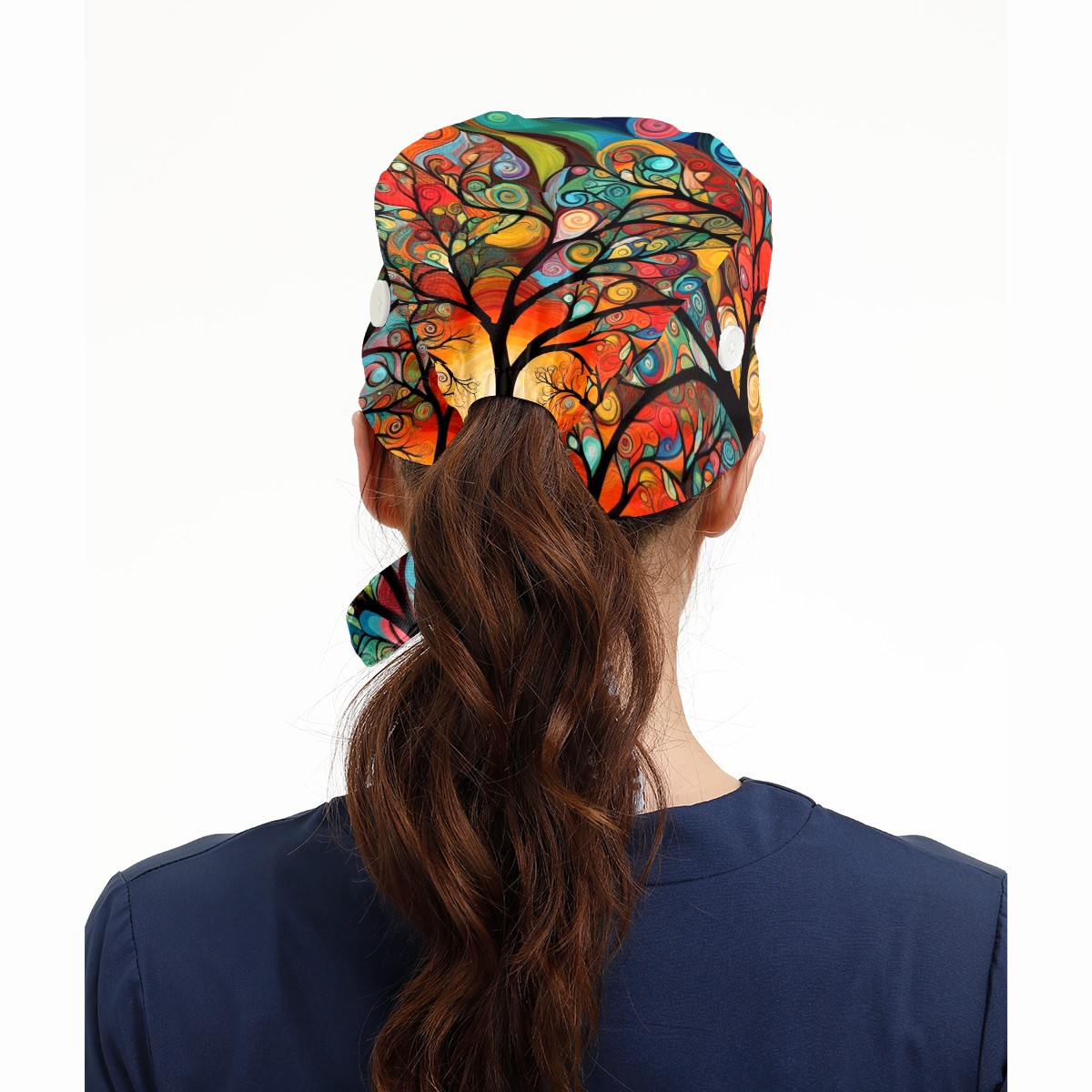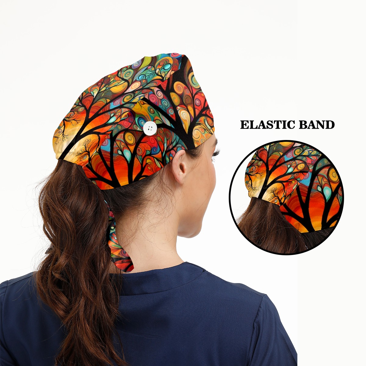 Working Caps with Button & Sweatband Satin Lined Cotton Adjustable Nurse Hats Elastic Band Scrub Cap Surgeon Hat Colorful Sunset With Trees