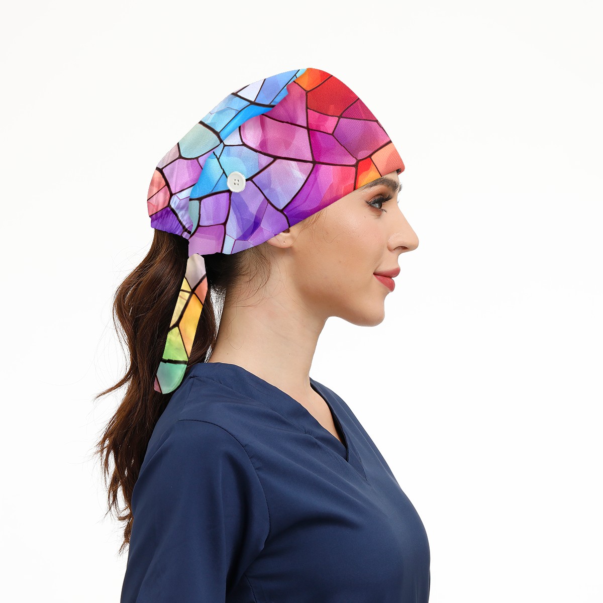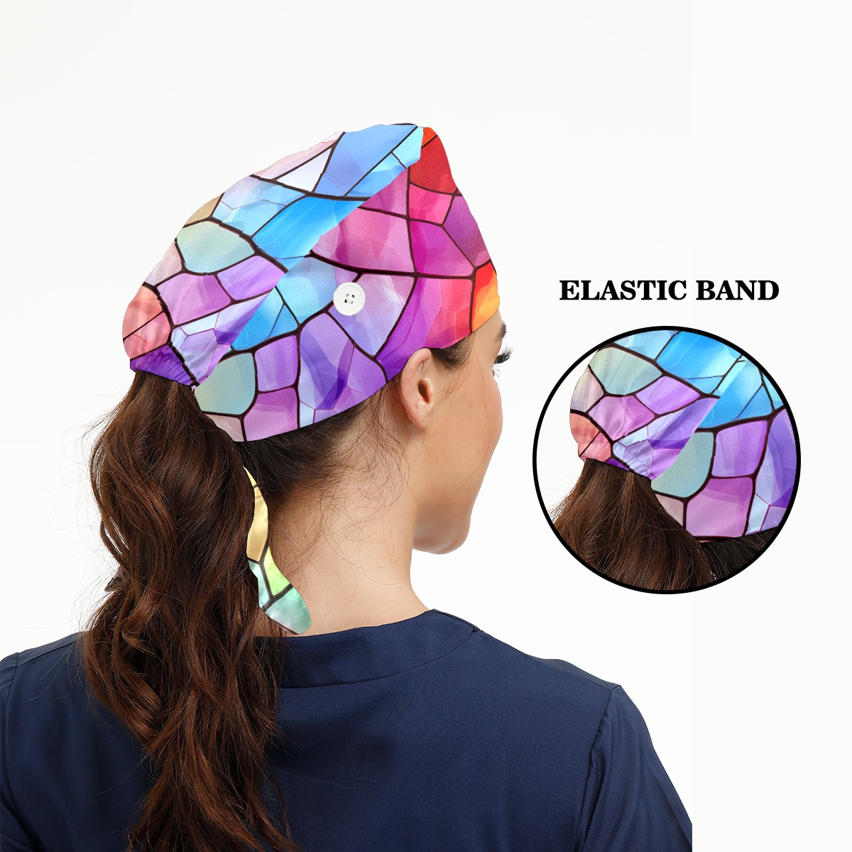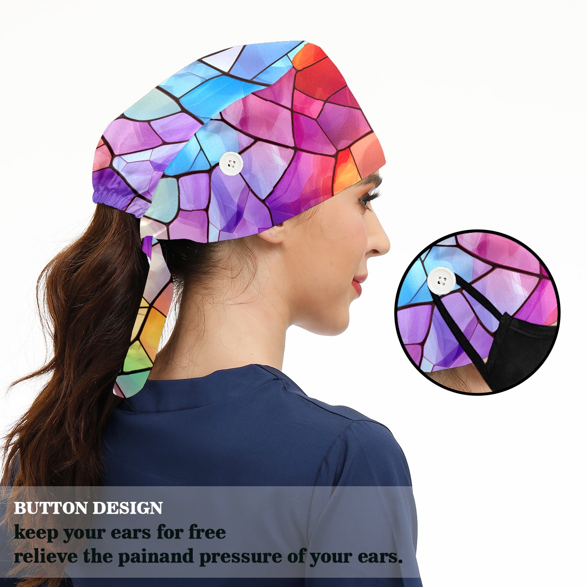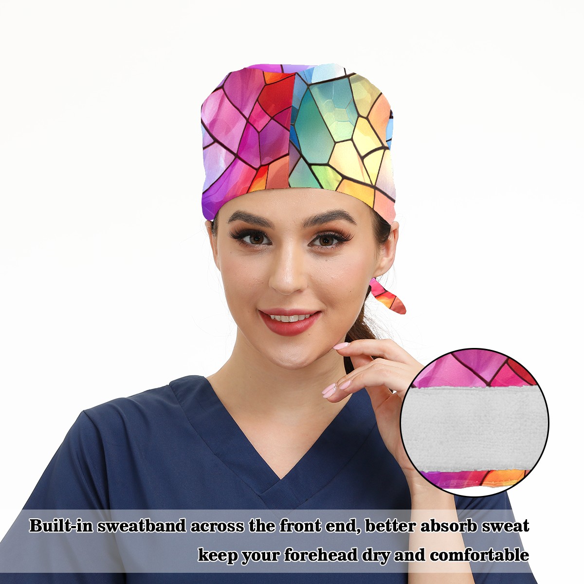 Working Caps with Button & Sweatband Satin Lined Cotton Adjustable Nurse Hats Elastic Band Scrub Cap Surgeon Hat Stained Glass Pattern (1)