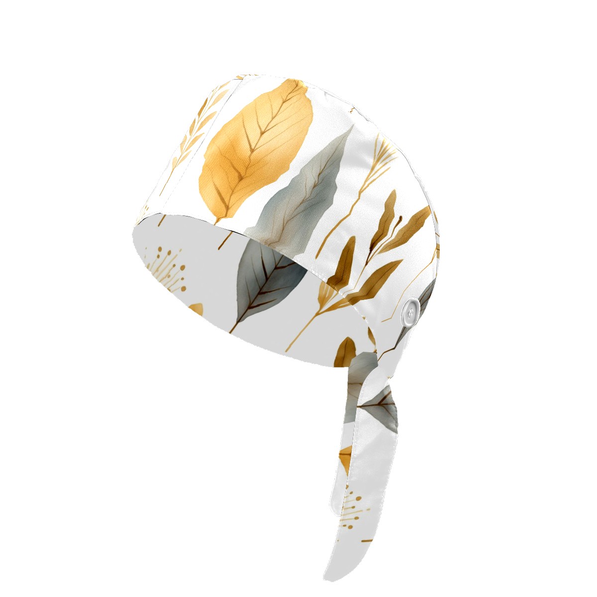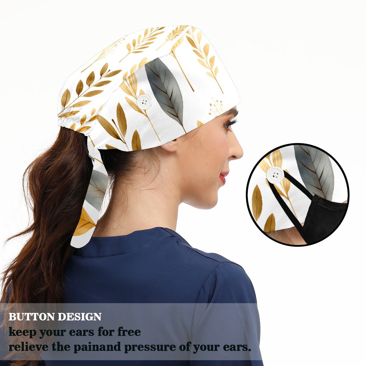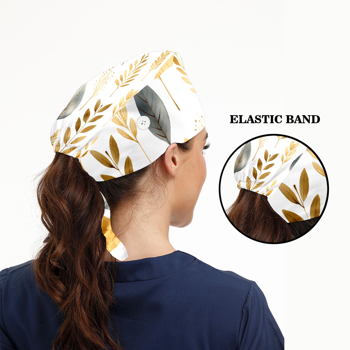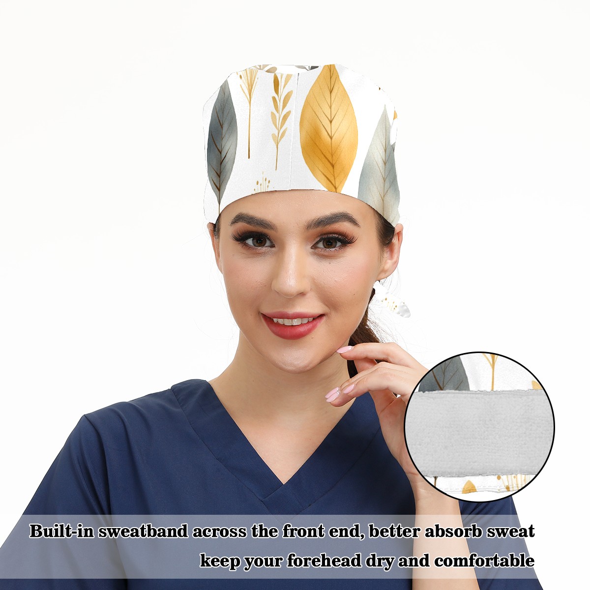 Working Caps with Button & Sweatband Satin Lined Cotton Adjustable Nurse Hats Elastic Band Scrub Cap Surgeon Hat Golden Leaf Plant