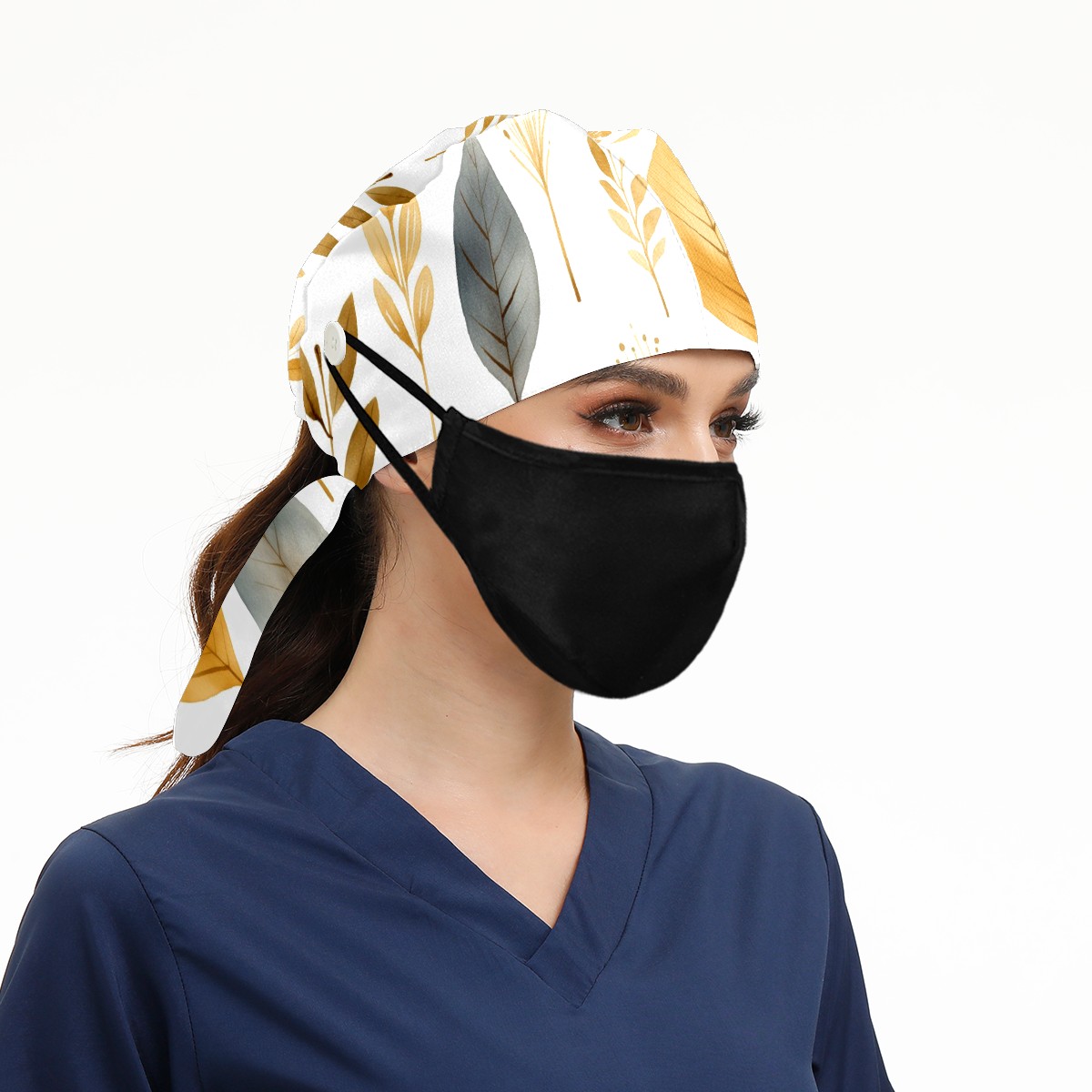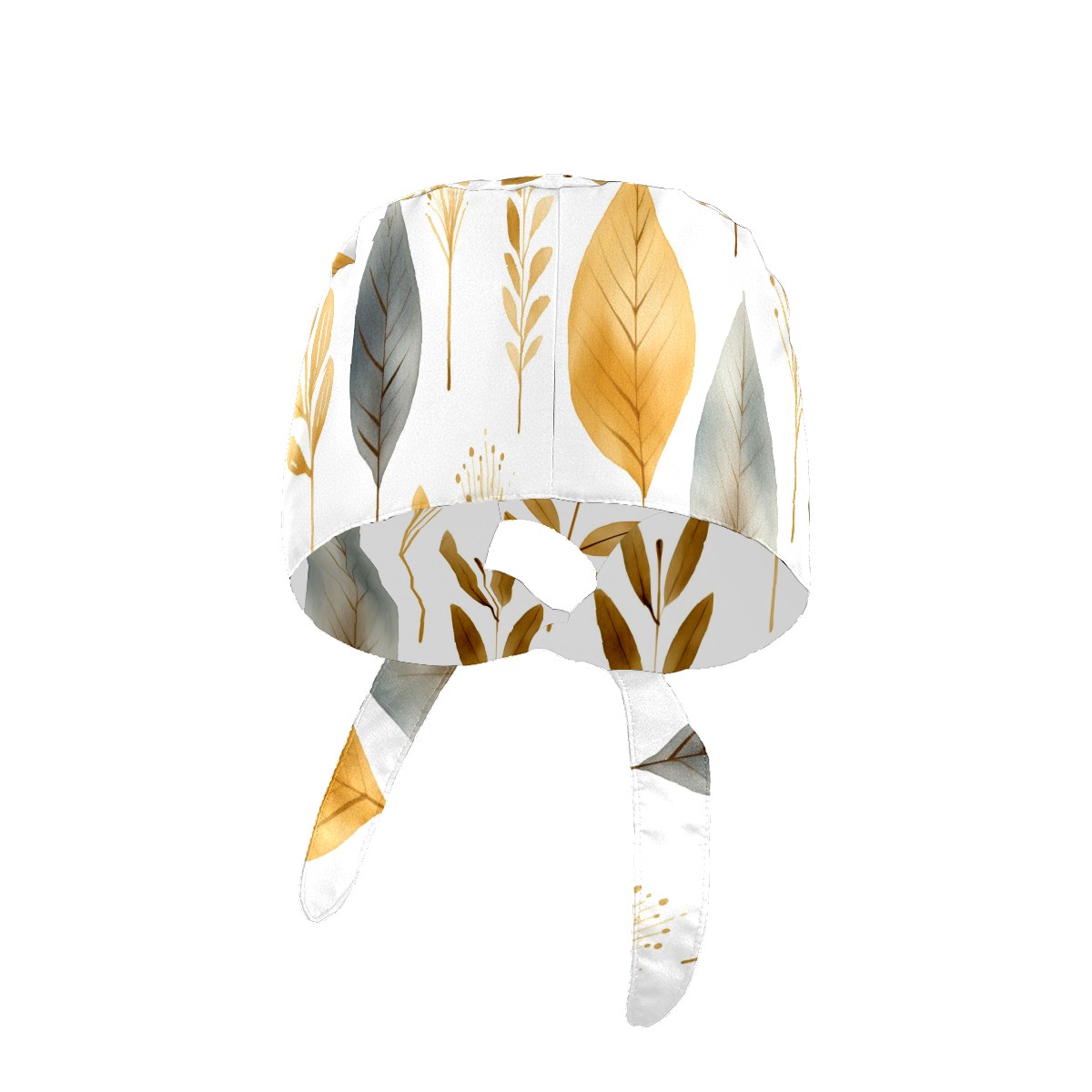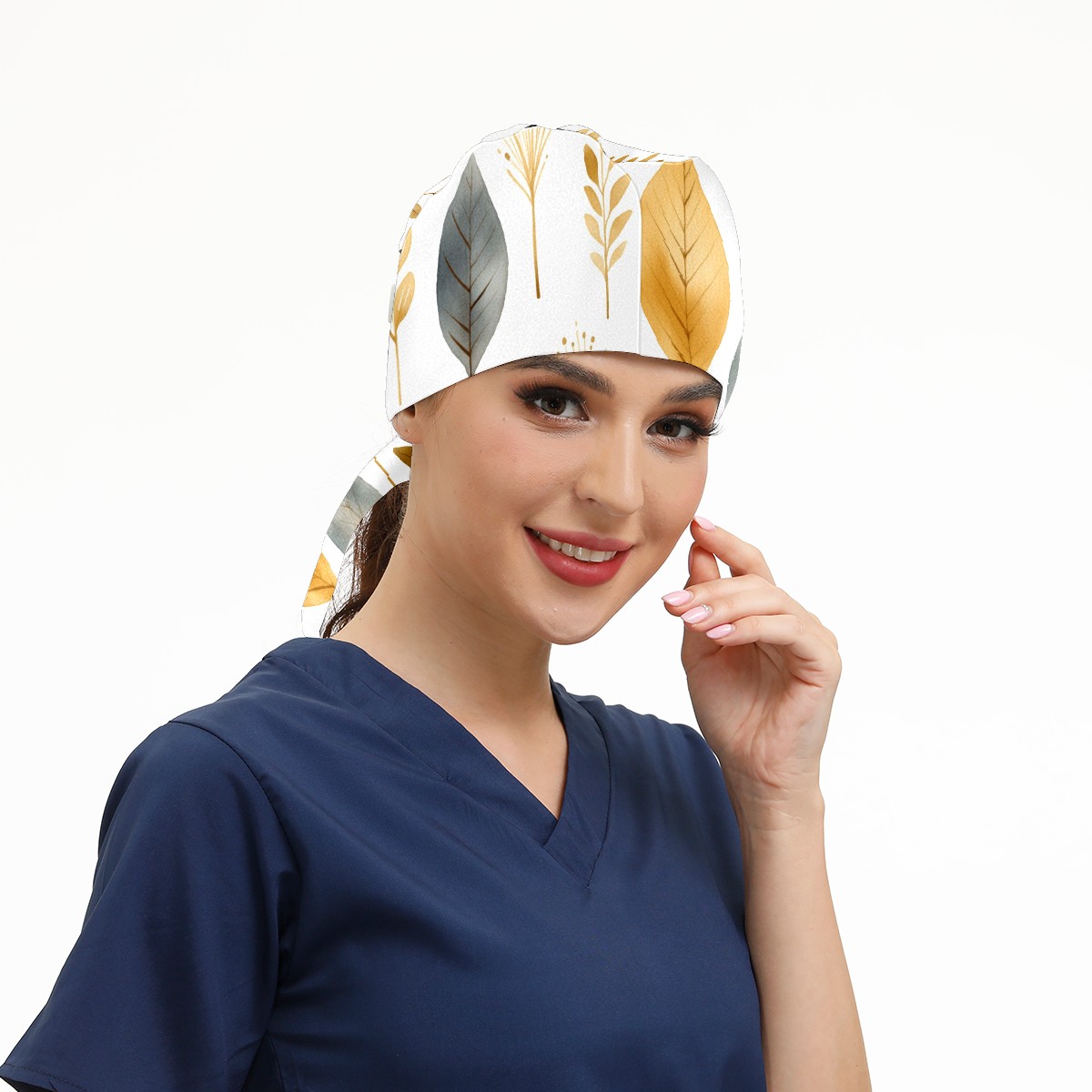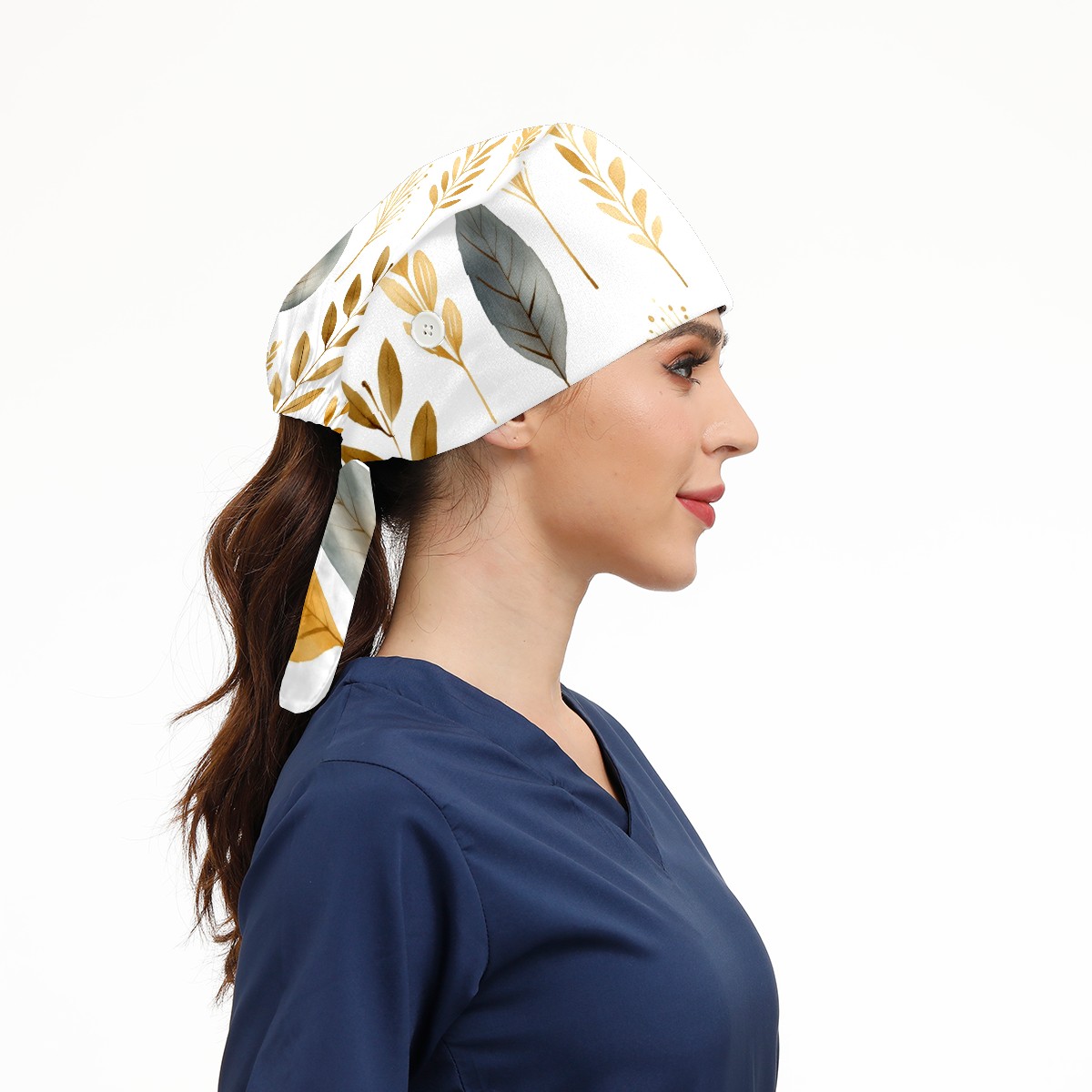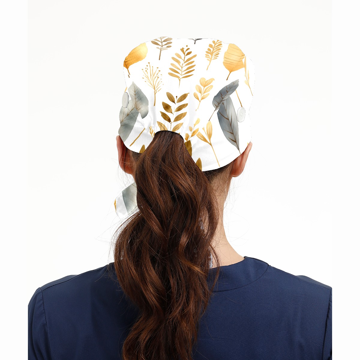 Working Caps with Button & Sweatband Satin Lined Cotton Adjustable Nurse Hats Elastic Band Scrub Cap Surgeon Hat Golden Leaf Plant
