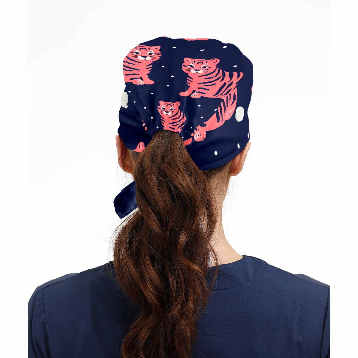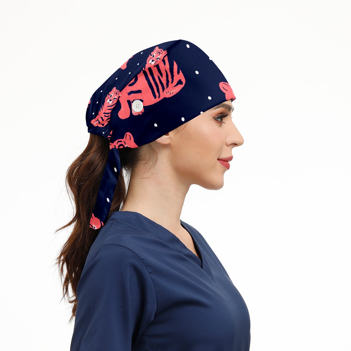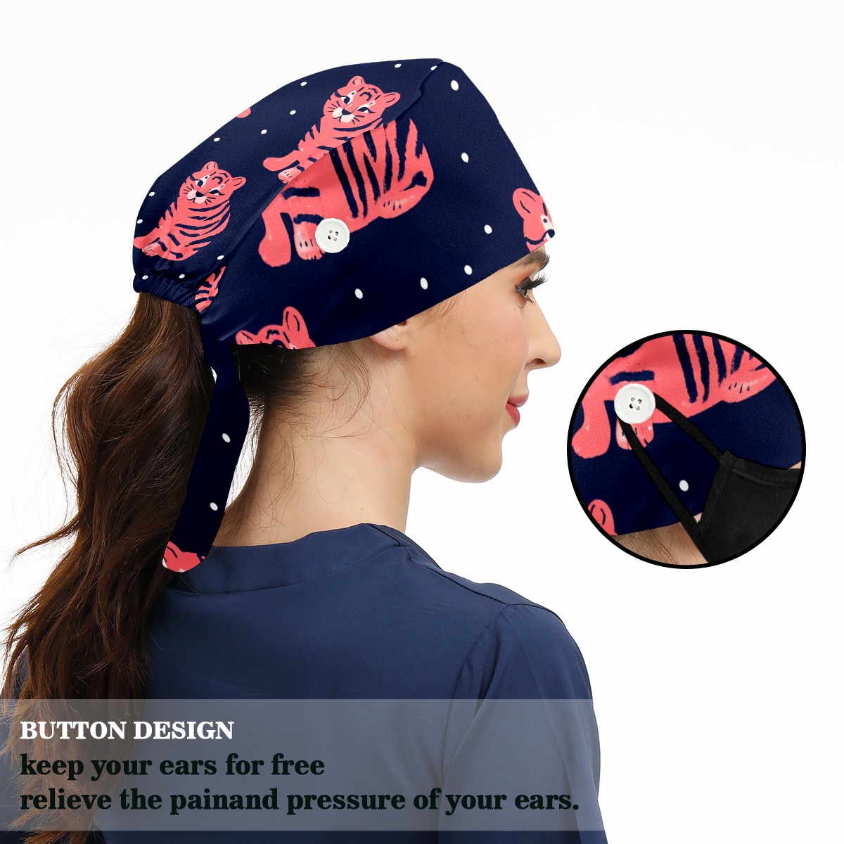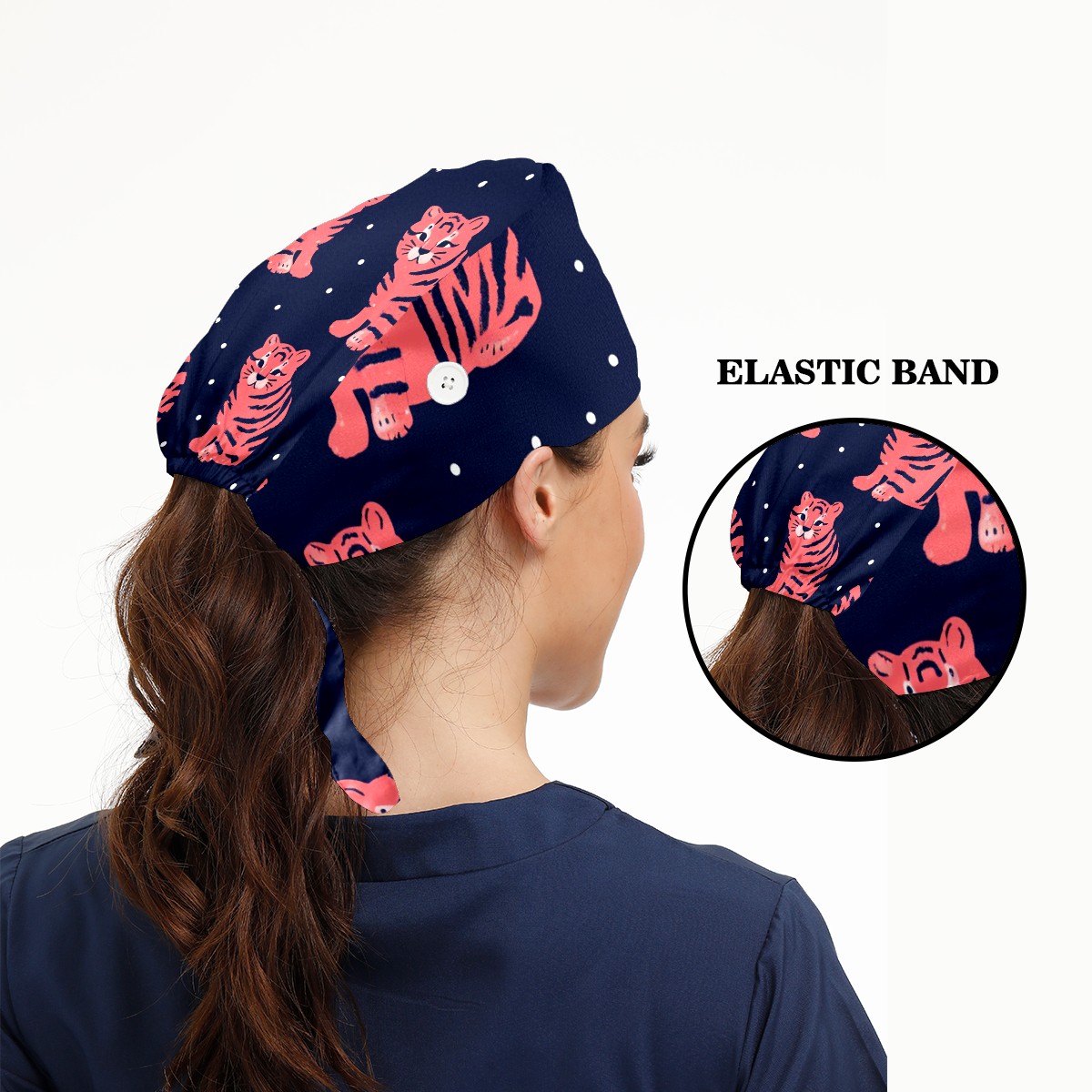 Working Caps with Button & Sweatband Satin Lined Cotton Adjustable Nurse Hats Elastic Band Scrub Cap Surgeon Hat Tiger