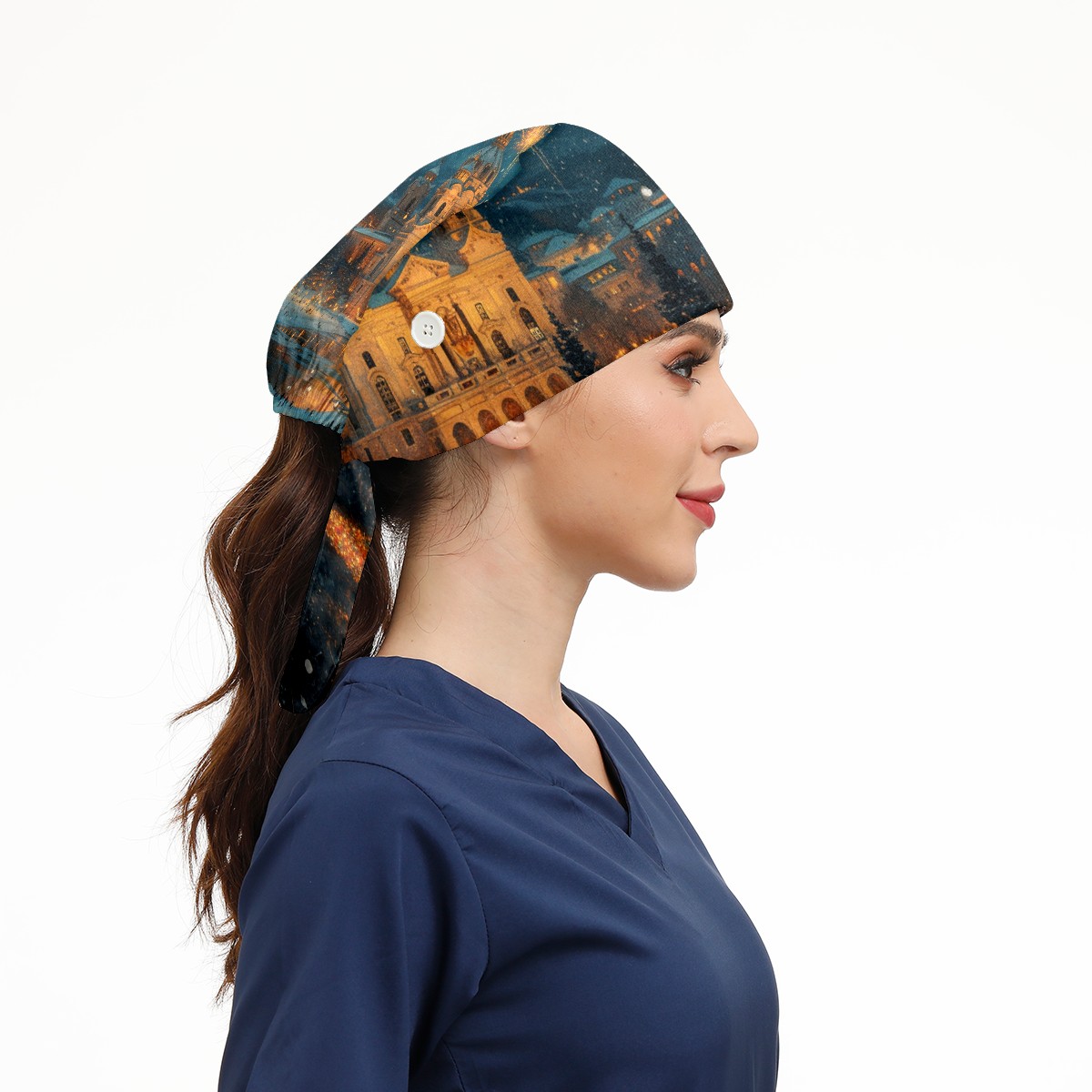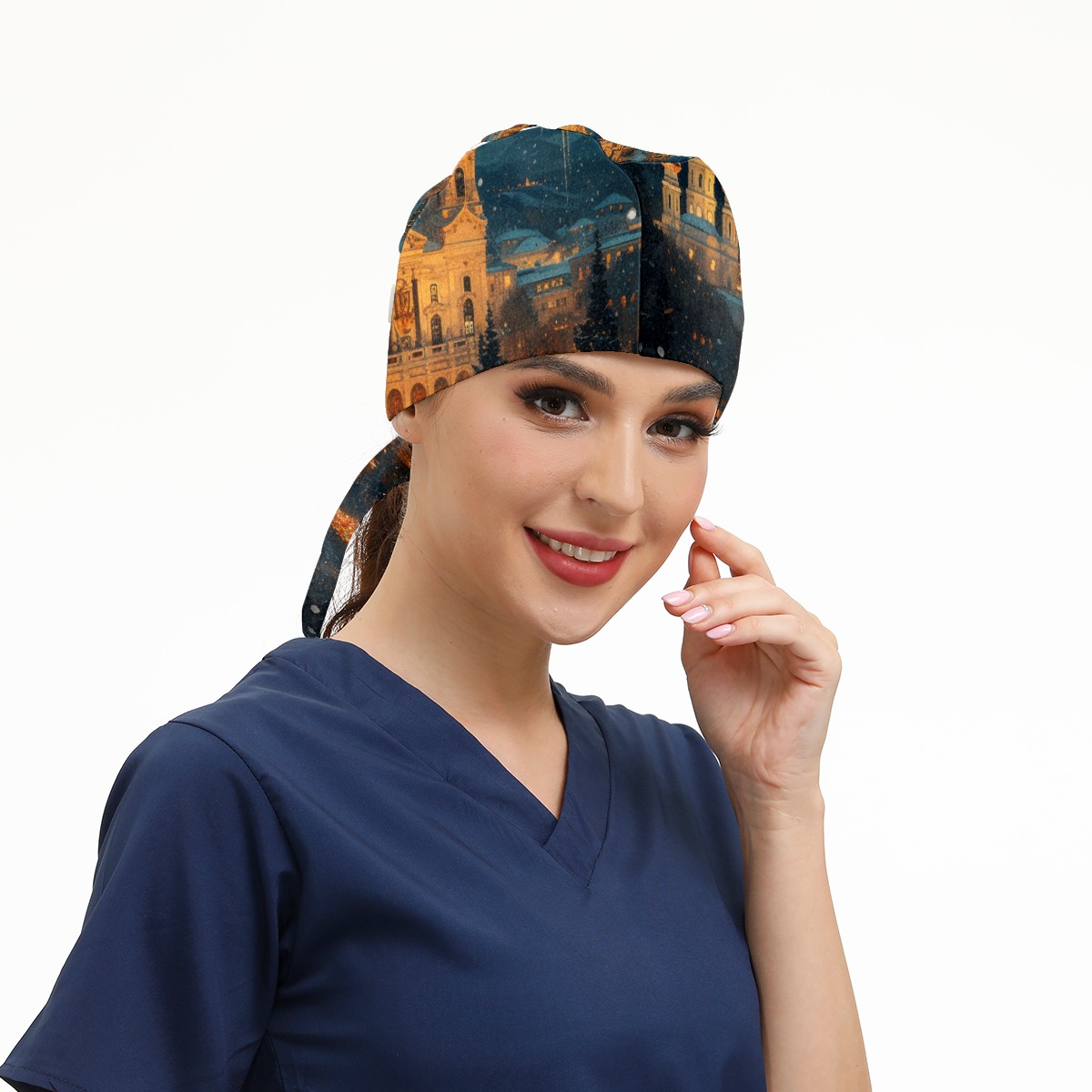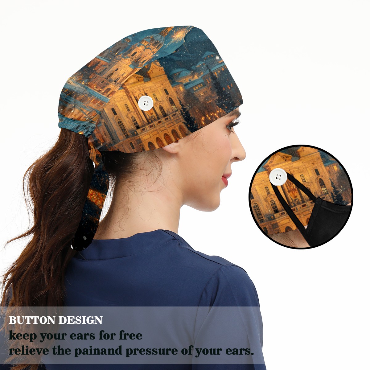 Working Caps with Button & Sweatband Satin Lined Cotton Adjustable Nurse Hats Elastic Band Scrub Cap Surgeon Hat Fairy Tale