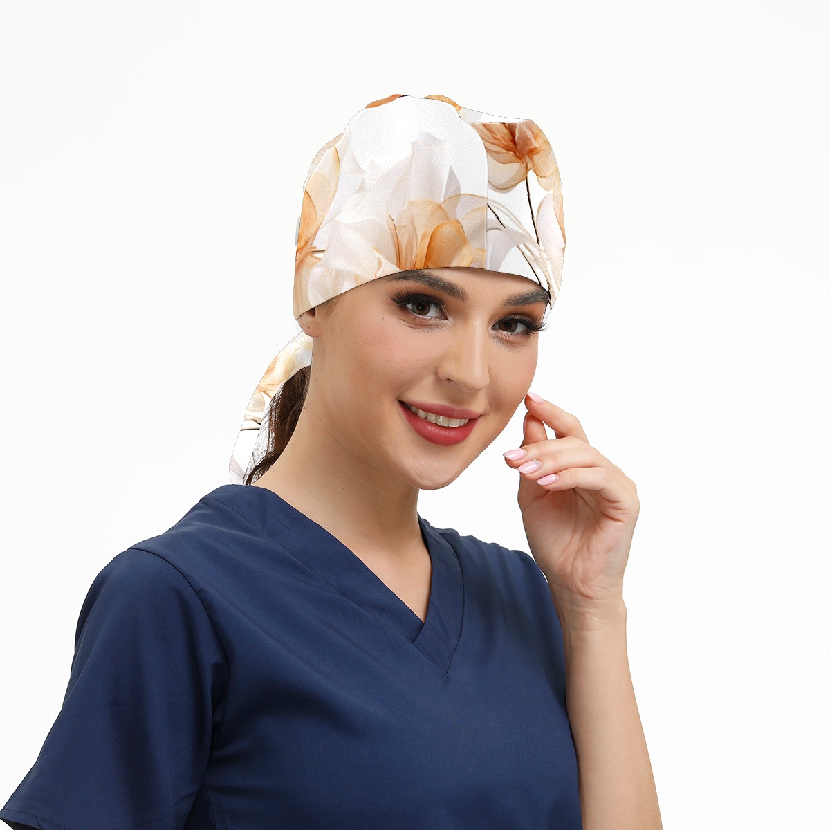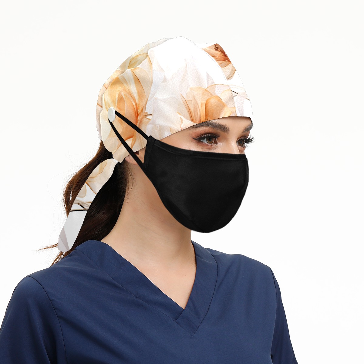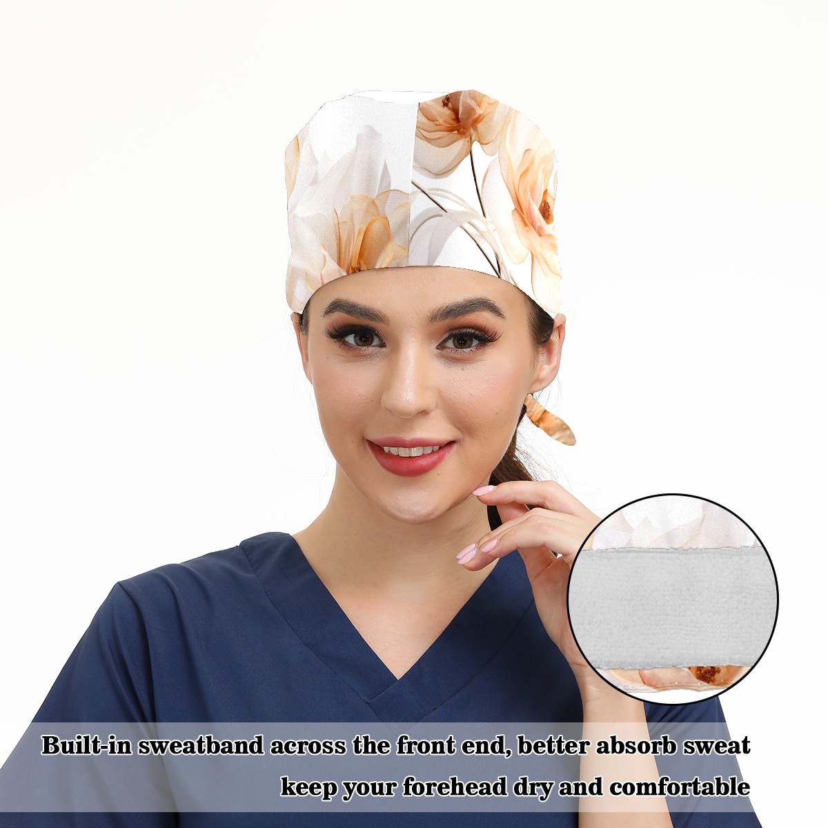 Working Caps with Button & Sweatband Satin Lined Cotton Adjustable Nurse Hats Elastic Band Scrub Cap Surgeon Hat Flower (2)