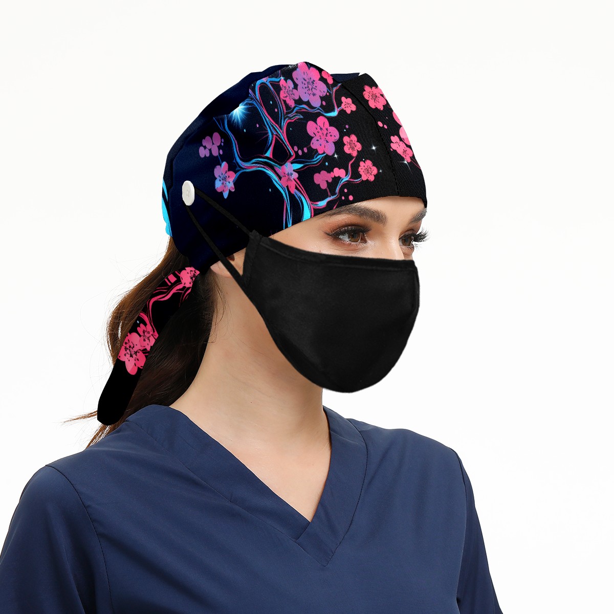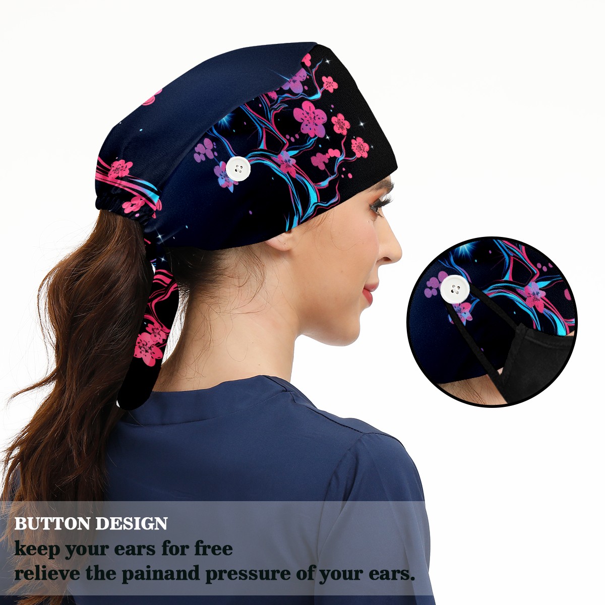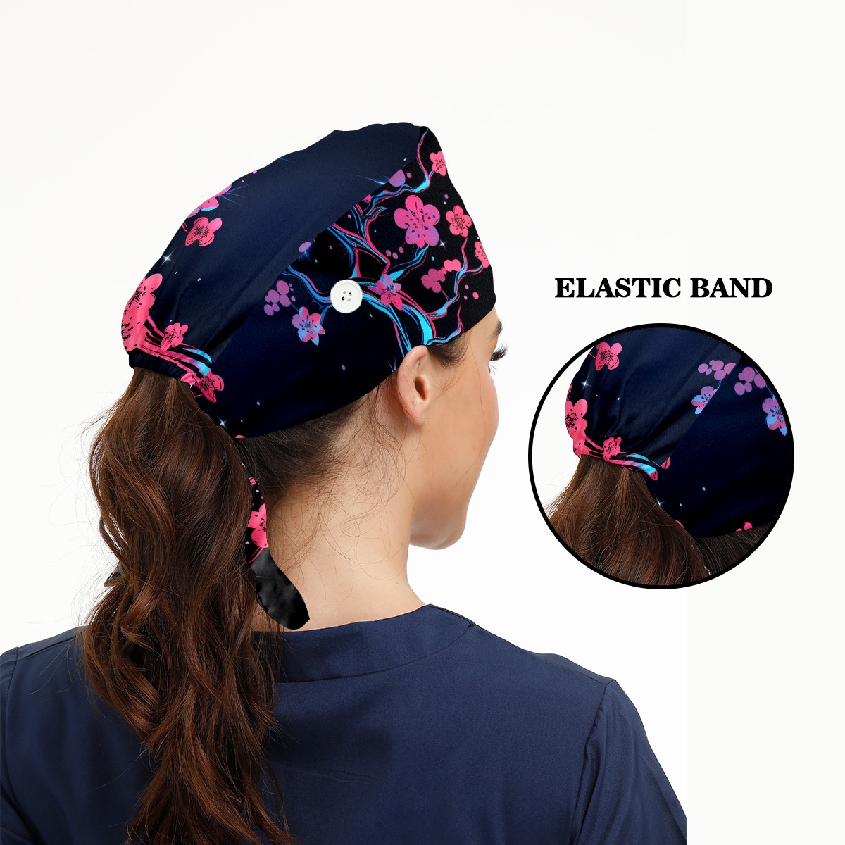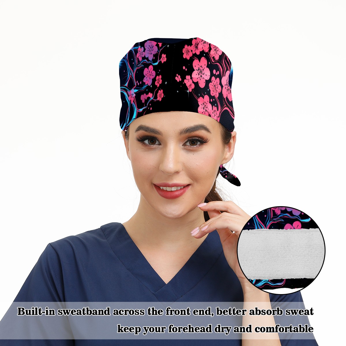 Working Caps with Button & Sweatband Satin Lined Cotton Adjustable Nurse Hats Elastic Band Scrub Cap Surgeon Hat Flower (99)