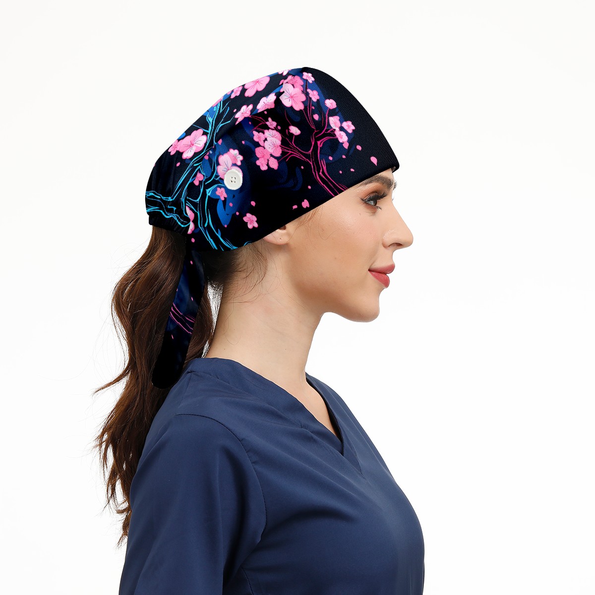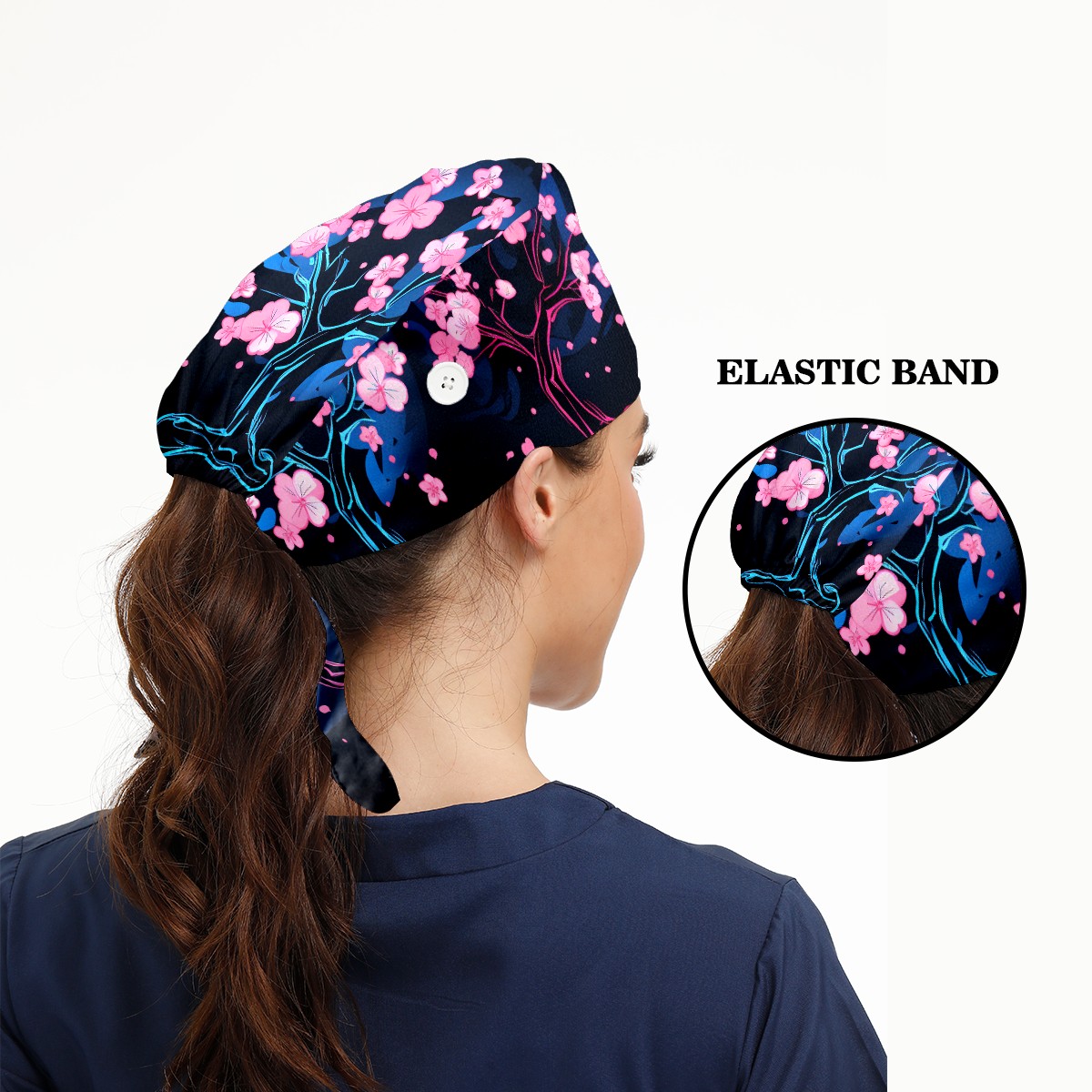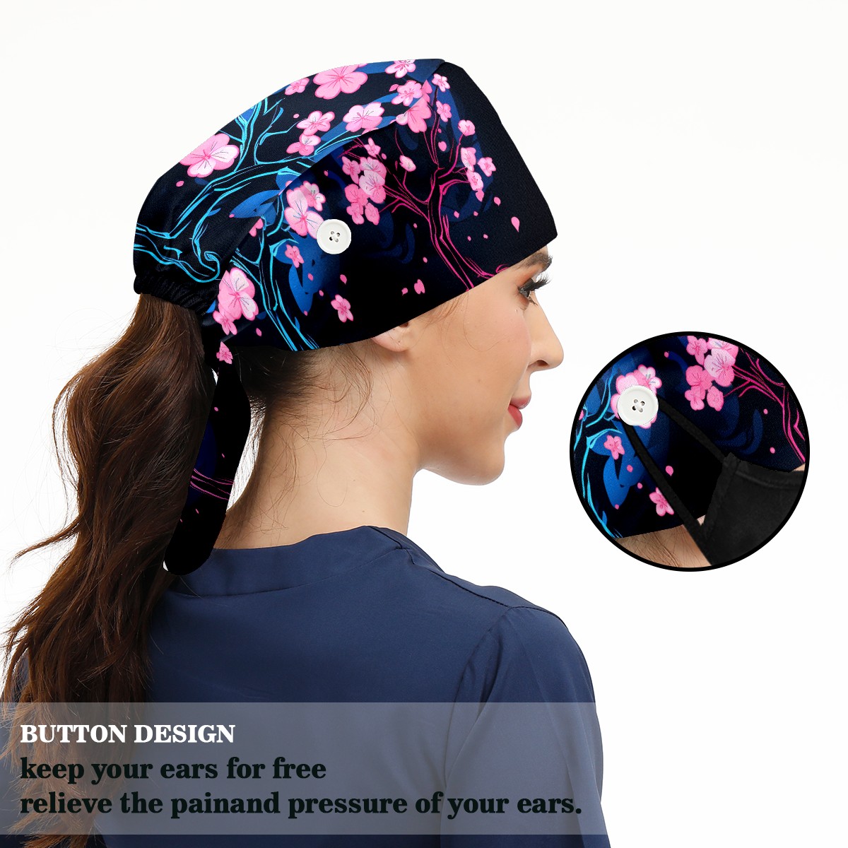 Working Caps with Button & Sweatband Satin Lined Cotton Adjustable Nurse Hats Elastic Band Scrub Cap Surgeon Hat Flower (90)