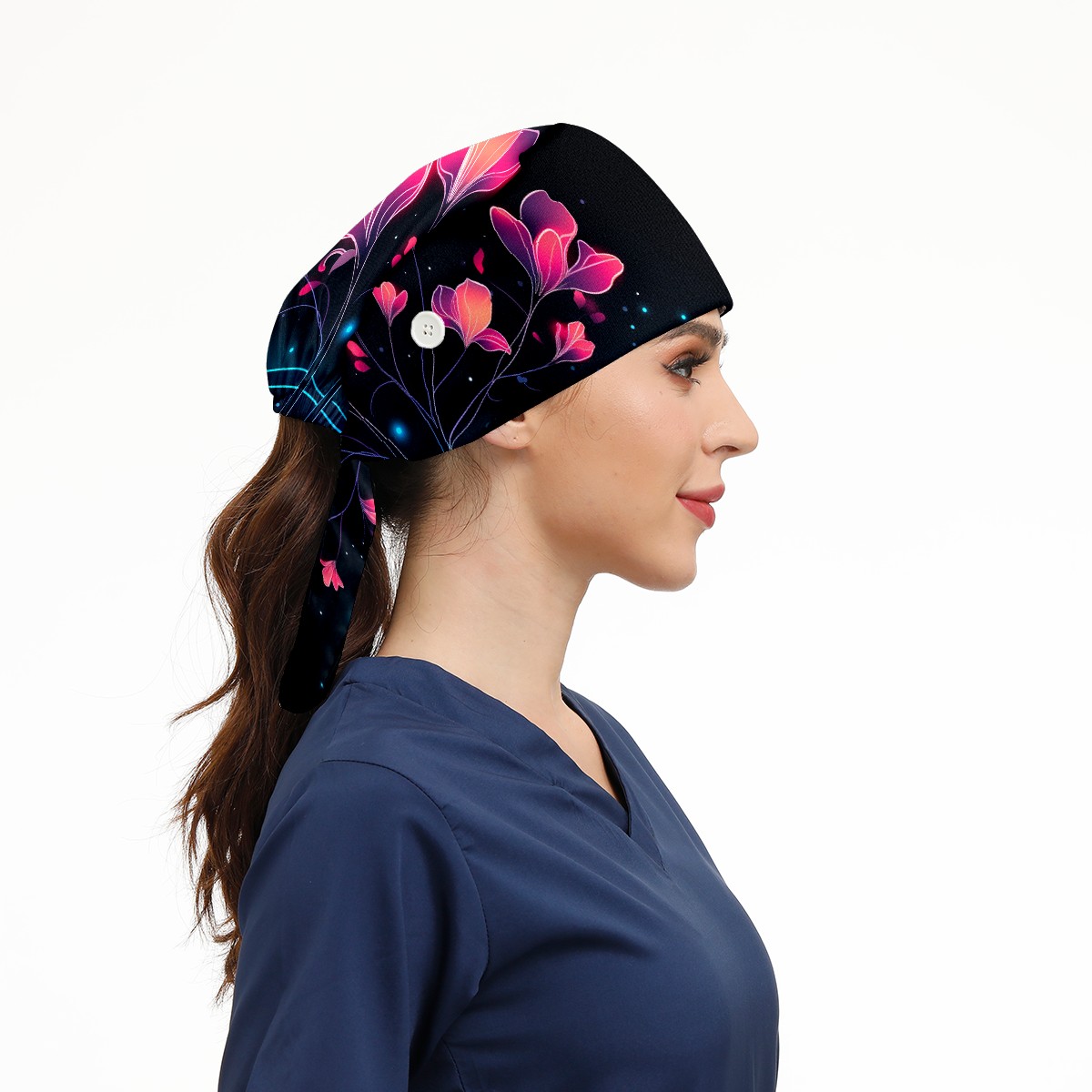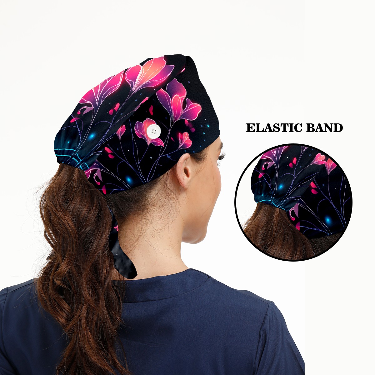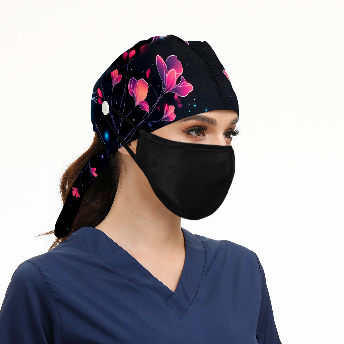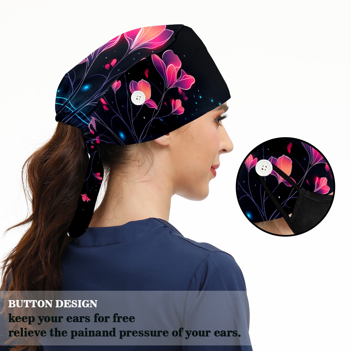 Working Caps with Button & Sweatband Satin Lined Cotton Adjustable Nurse Hats Elastic Band Scrub Cap Surgeon Hat Flower (32)