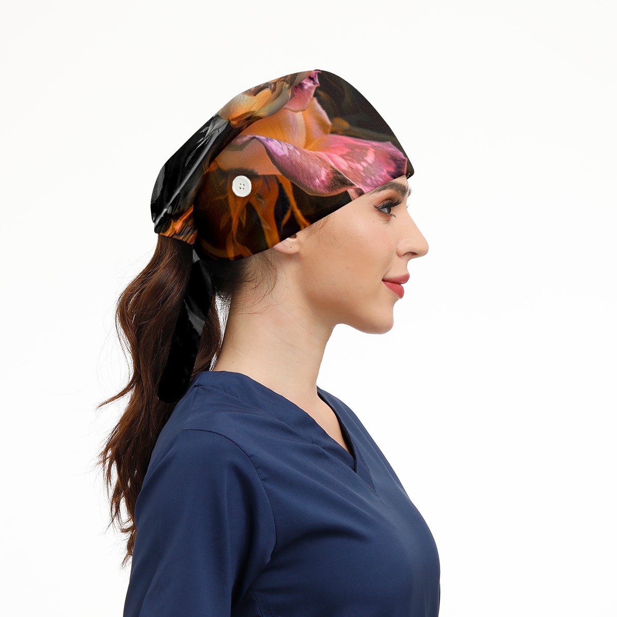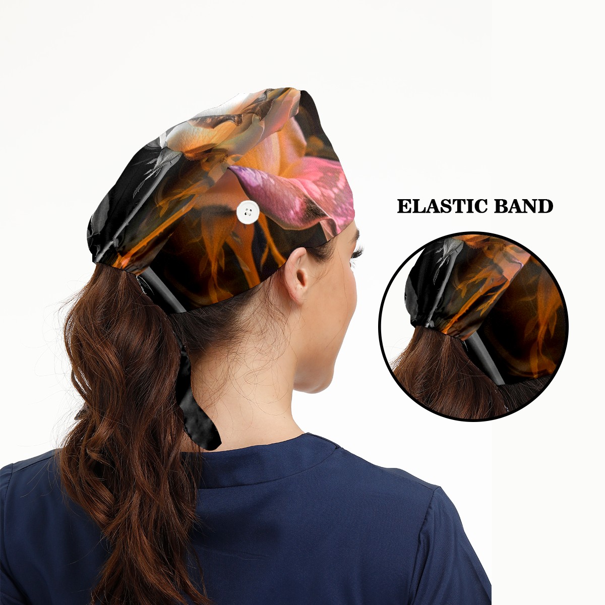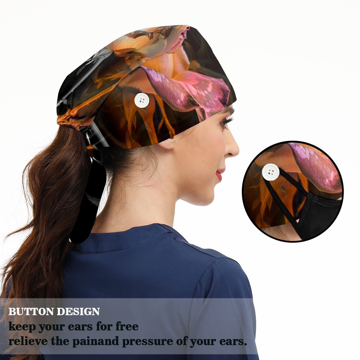 Working Caps with Button & Sweatband Satin Lined Cotton Adjustable Nurse Hats Elastic Band Scrub Cap Surgeon Hat Roses (6)