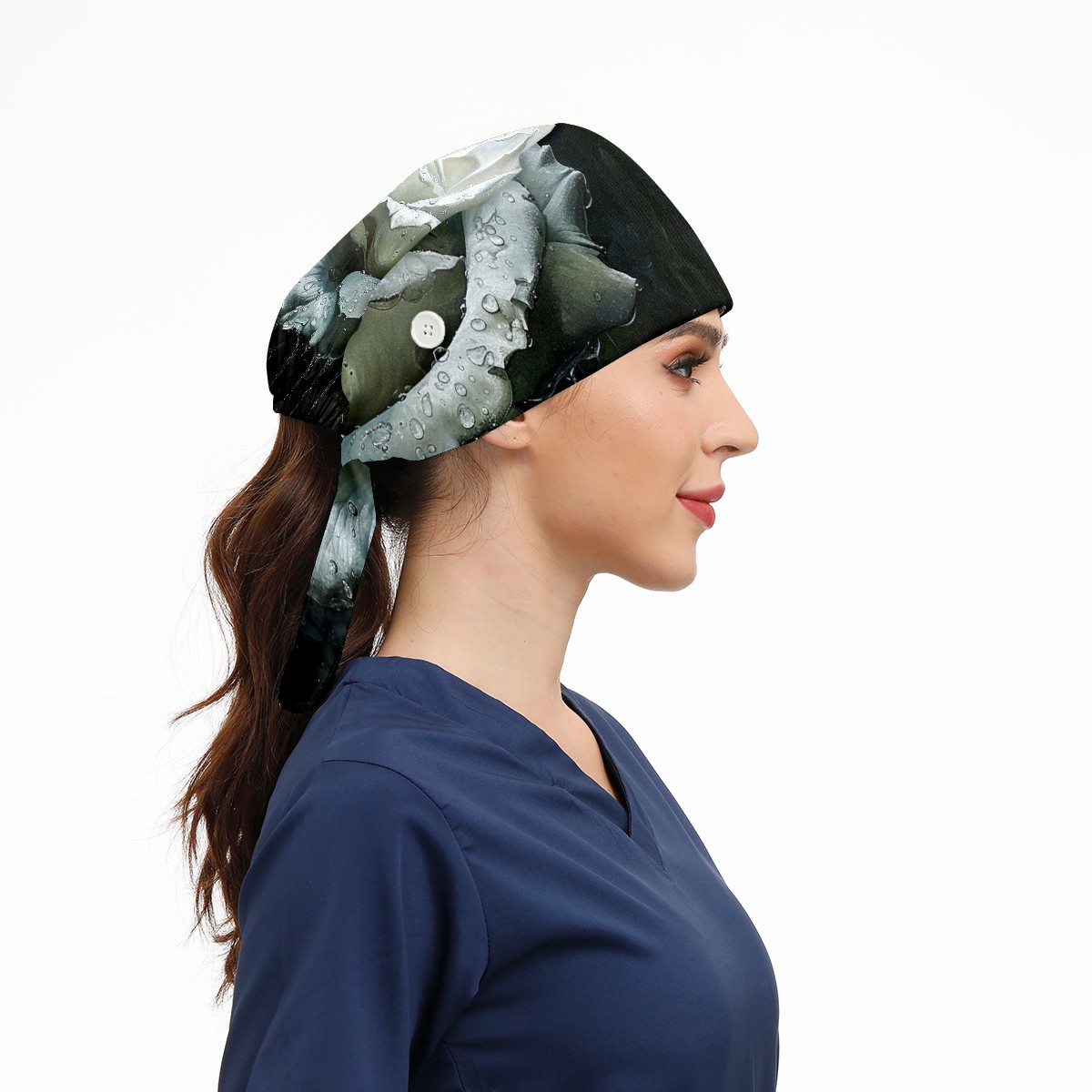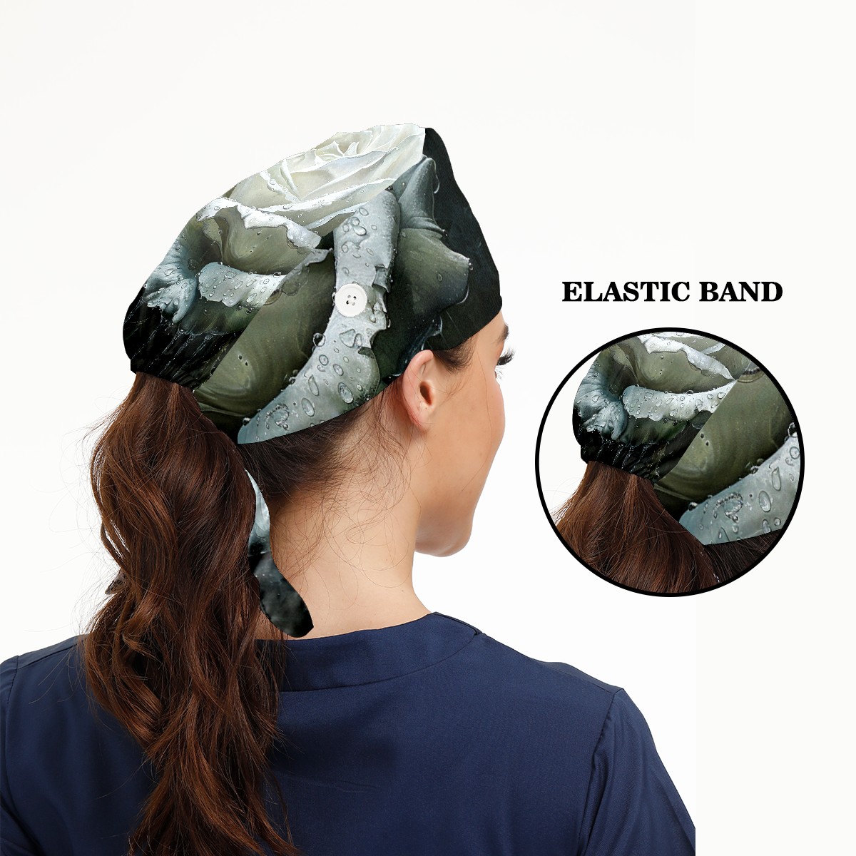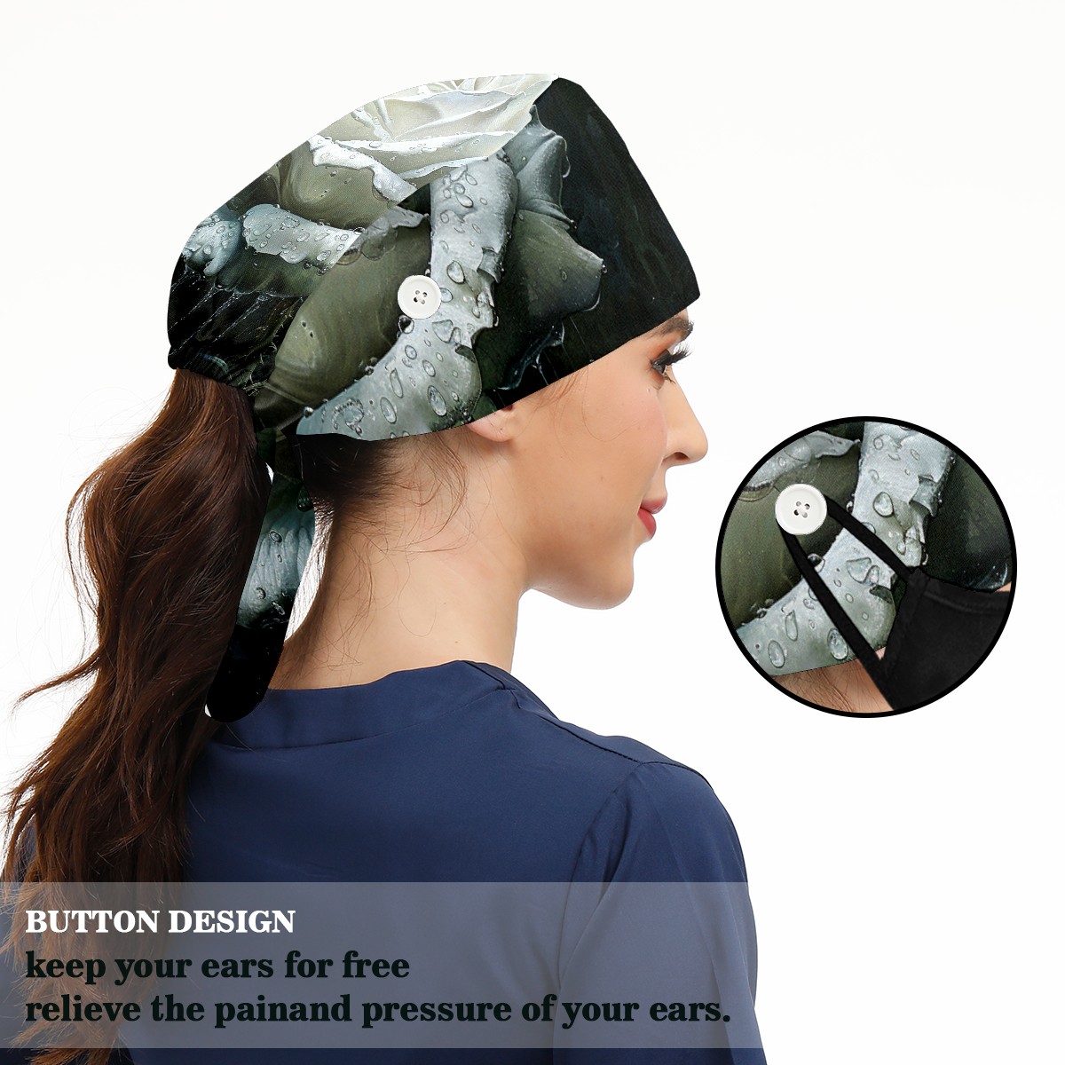 Working Caps with Button & Sweatband Satin Lined Cotton Adjustable Nurse Hats Elastic Band Scrub Cap Surgeon Hat Rose Flower (4)