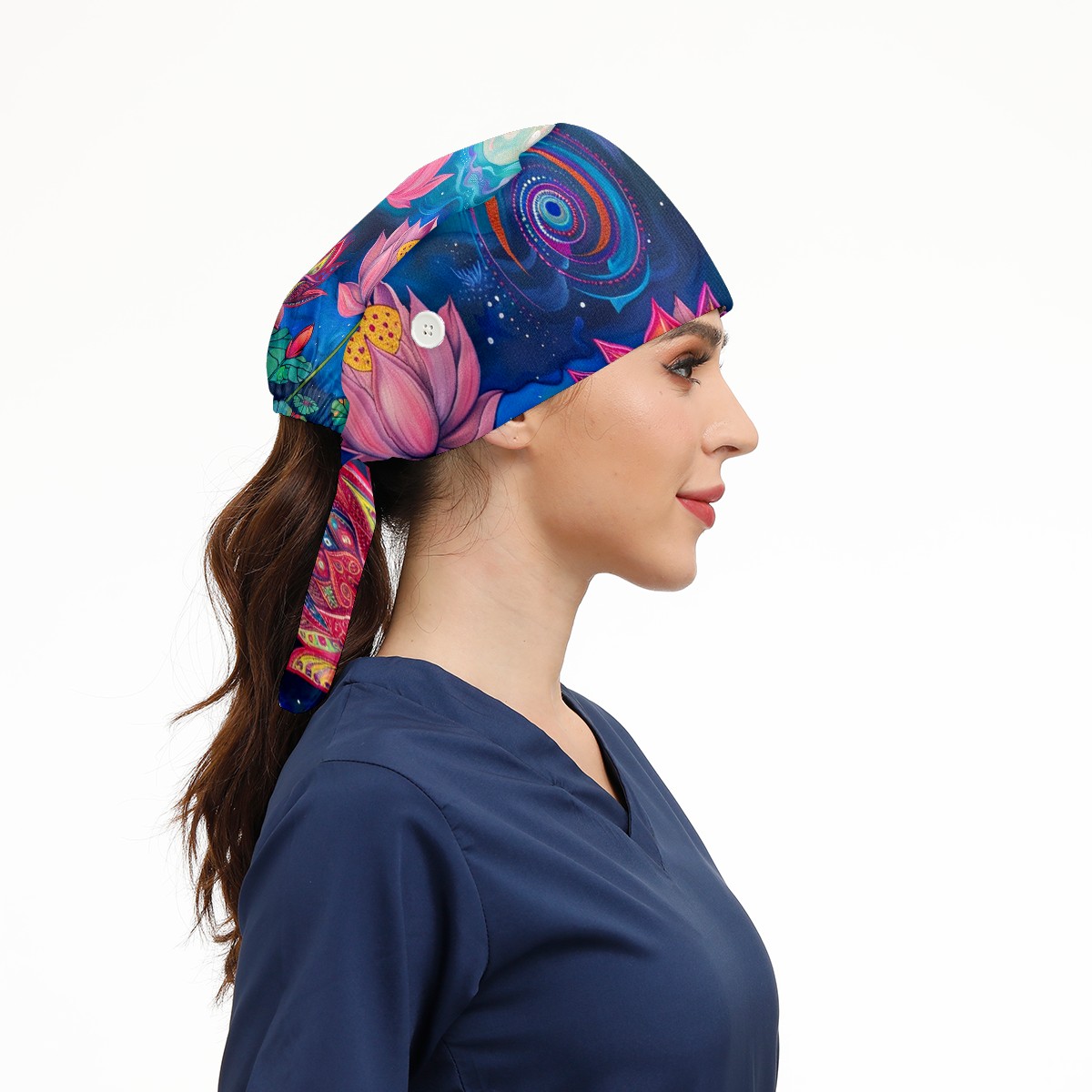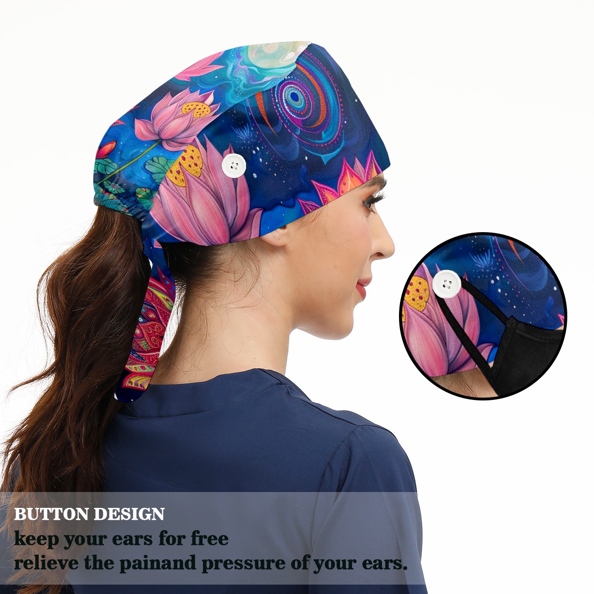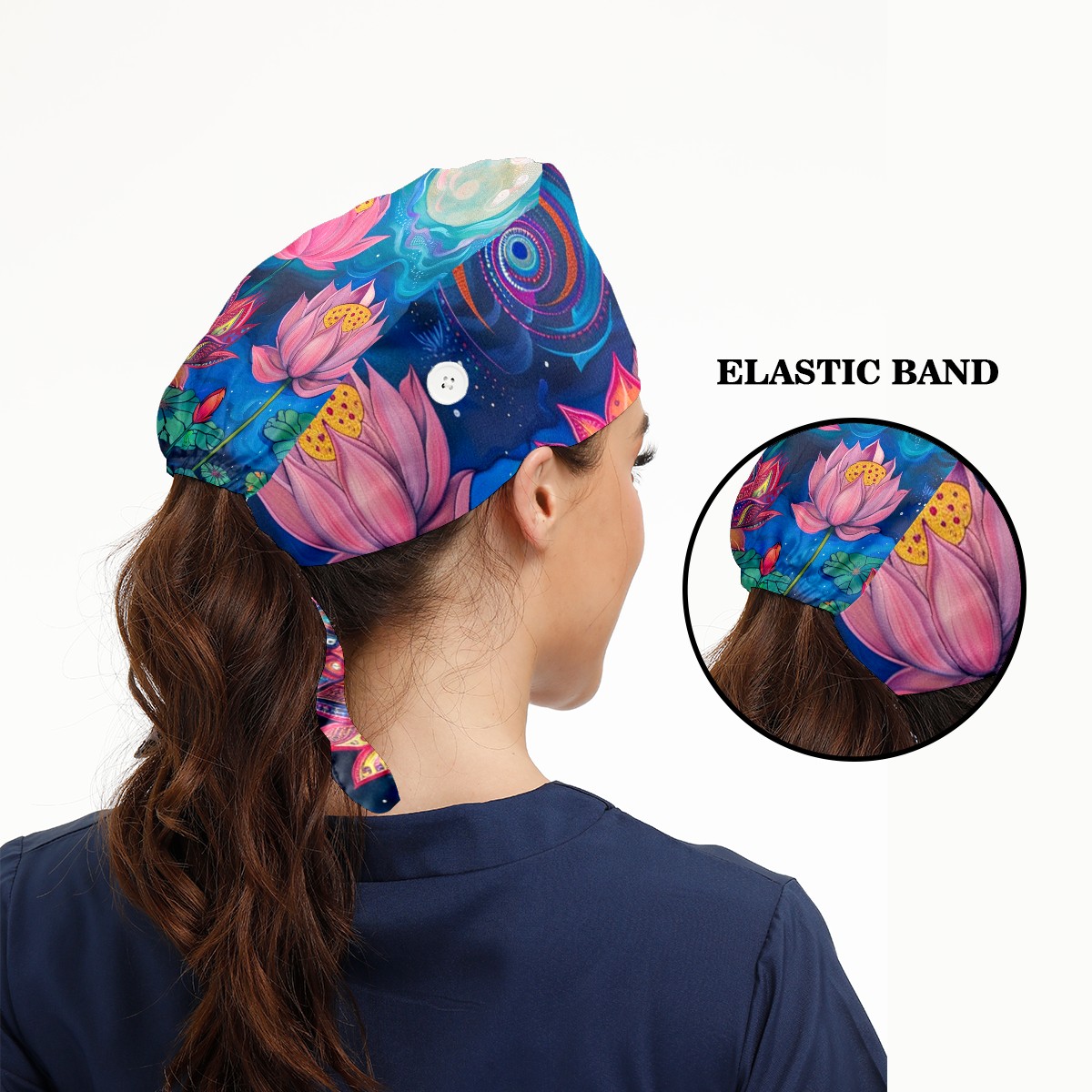 Working Caps with Button & Sweatband Satin Lined Cotton Adjustable Nurse Hats Elastic Band Scrub Cap Surgeon Hat Lotus