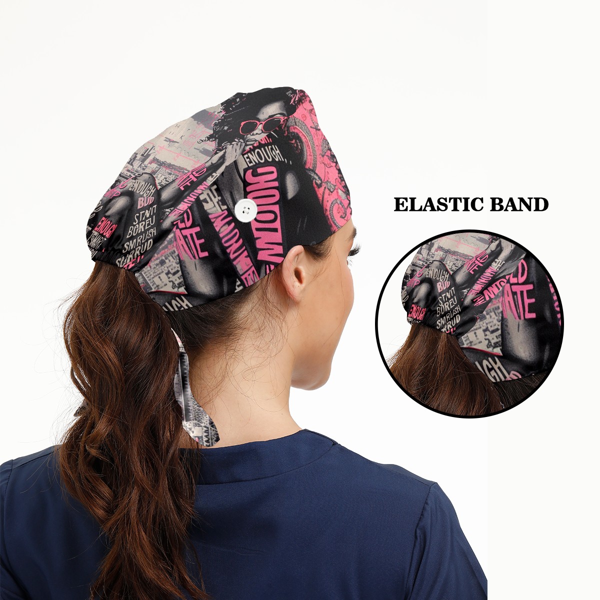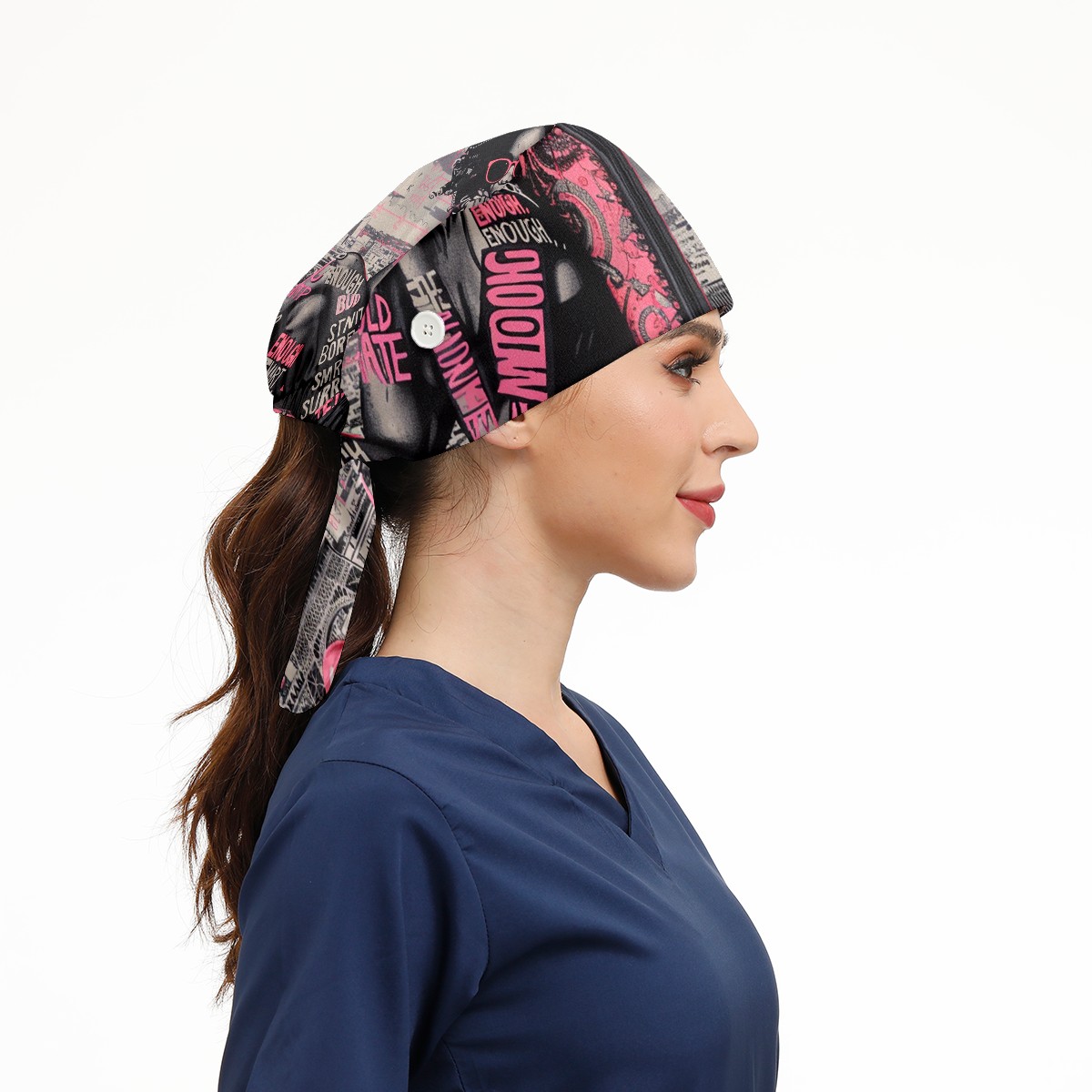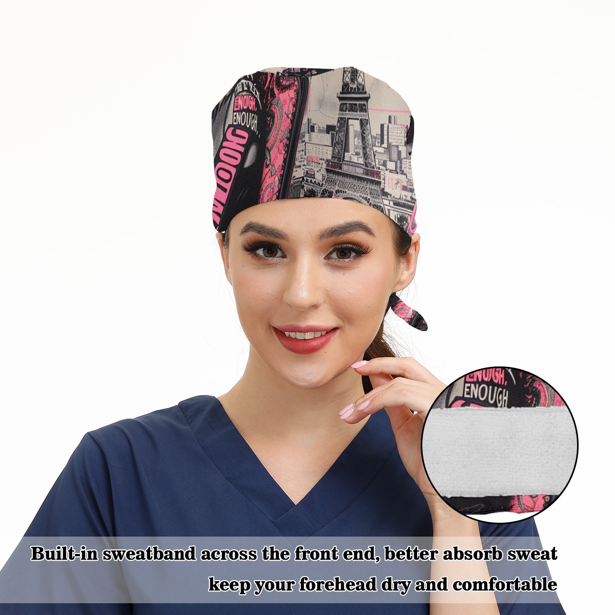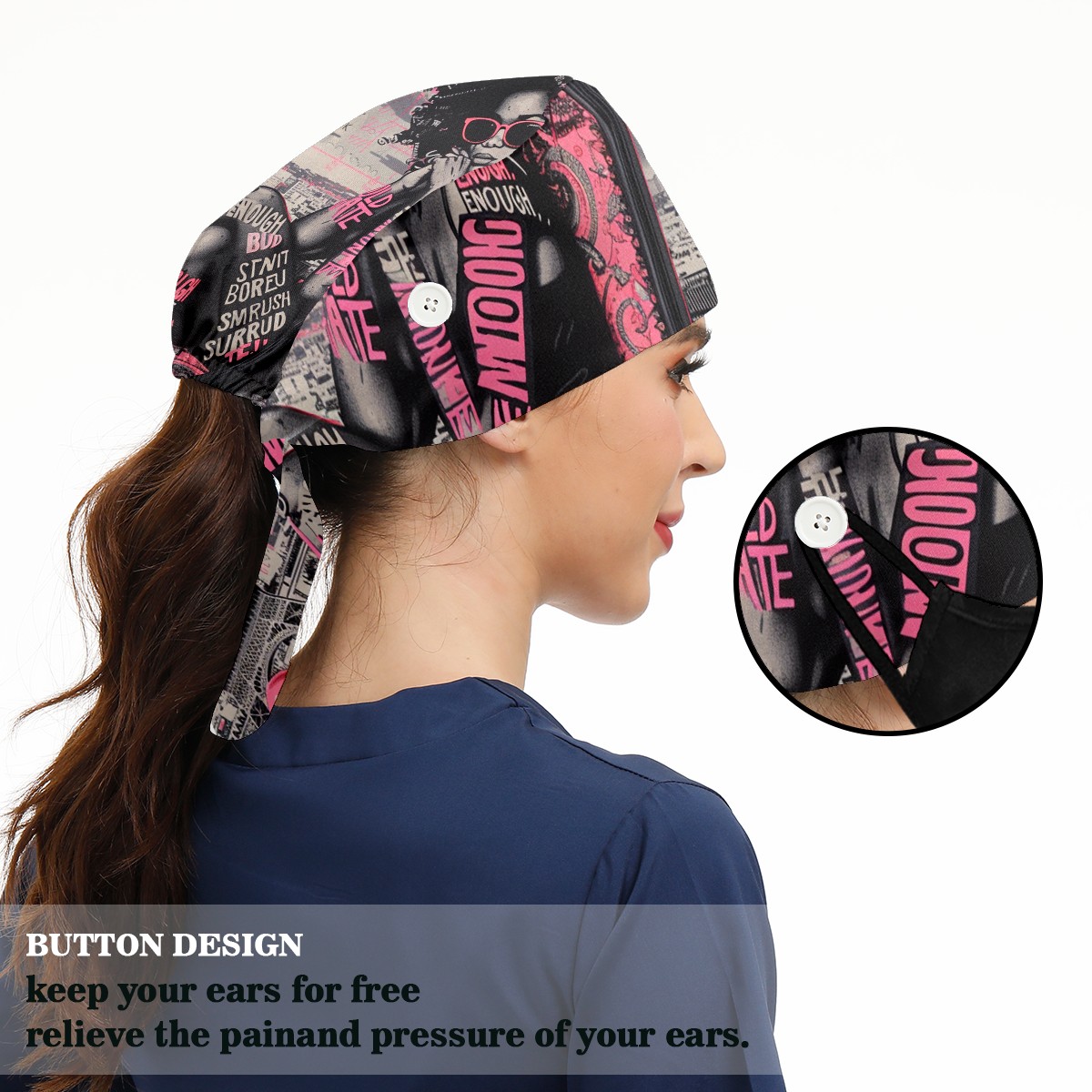 Working Caps with Button & Sweatband Satin Lined Cotton Adjustable Nurse Hats Elastic Band Scrub Cap Surgeon Hat Pink Lady
