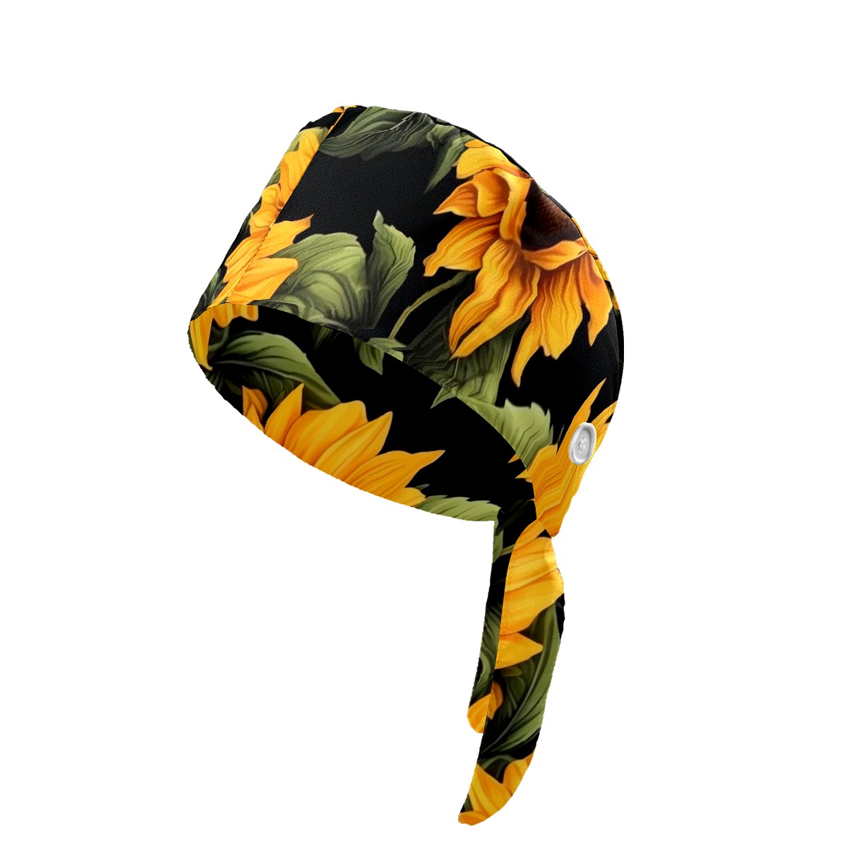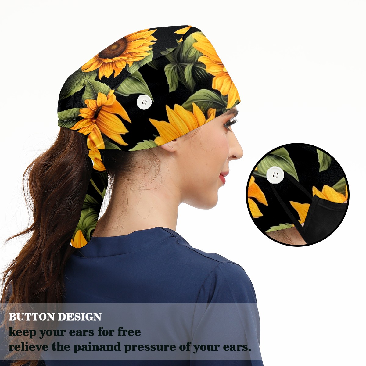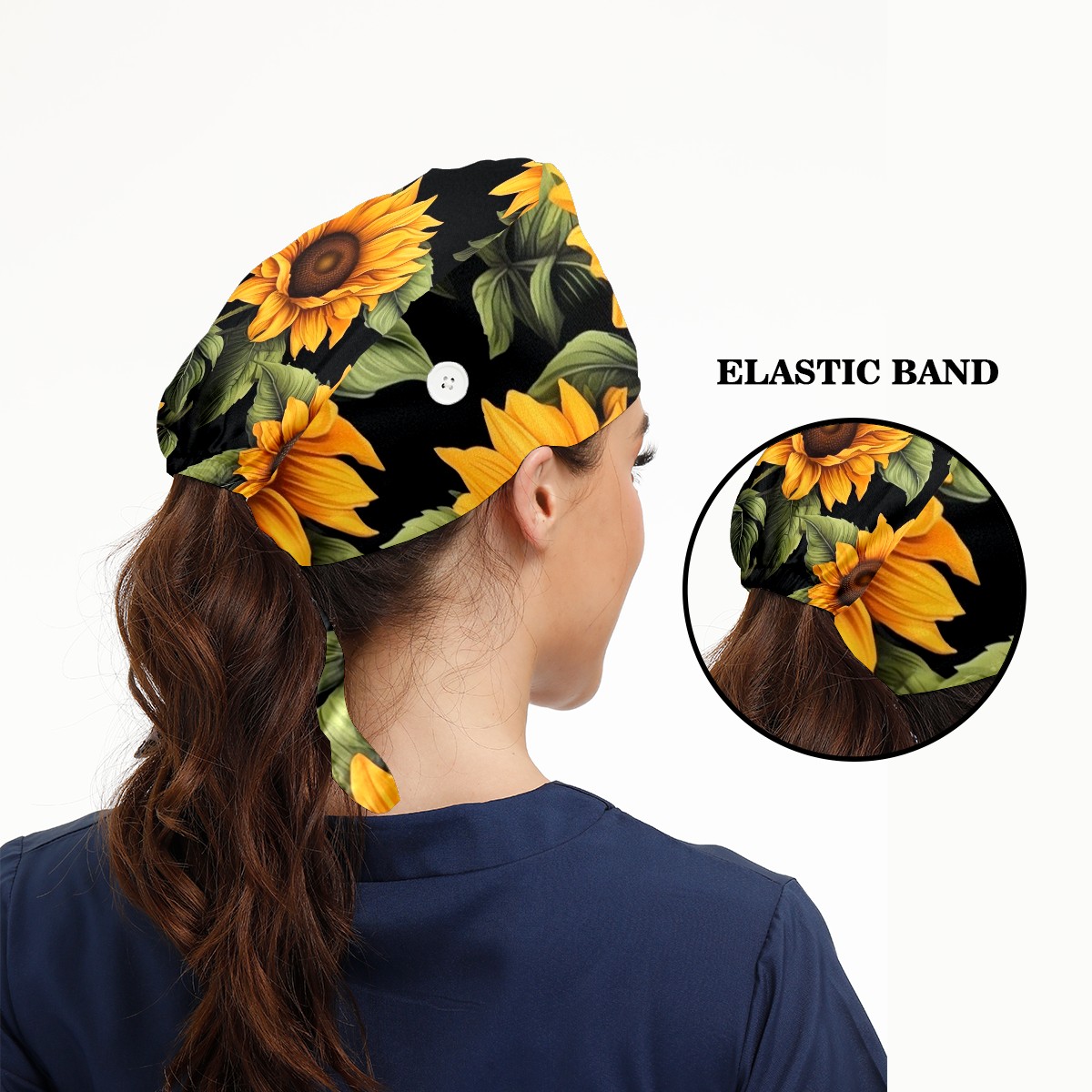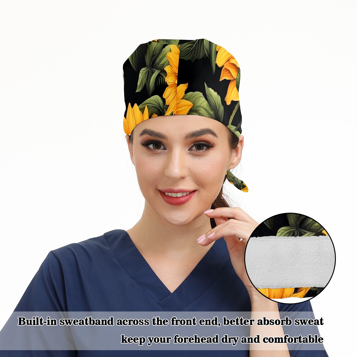 Working Caps with Button & Sweatband Satin Lined Cotton Adjustable Nurse Hats Elastic Band Scrub Cap Surgeon Hat Sunflower (2)