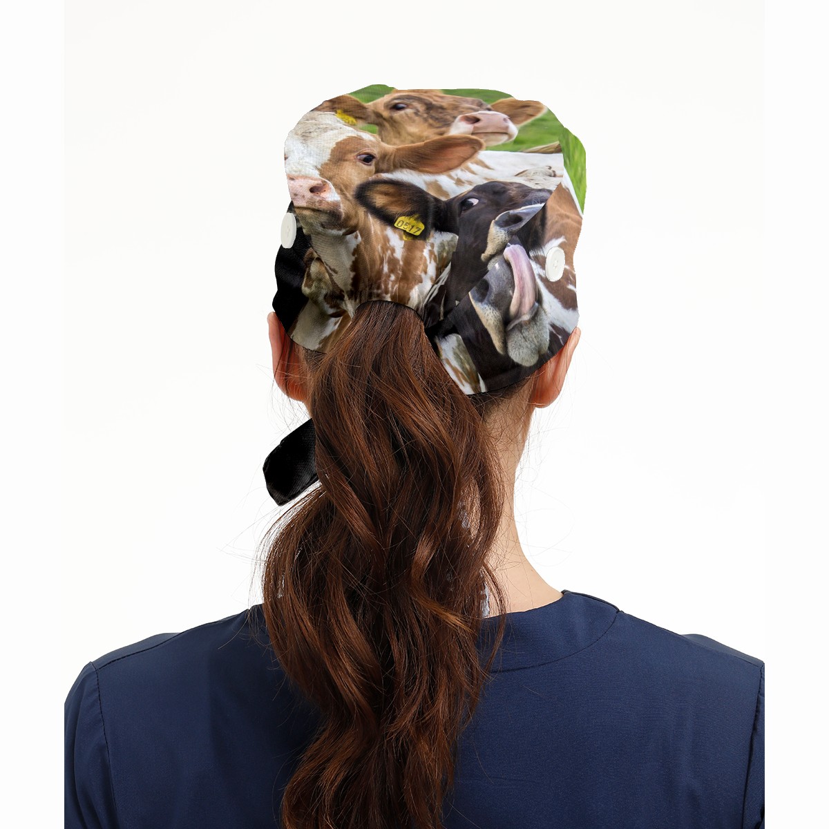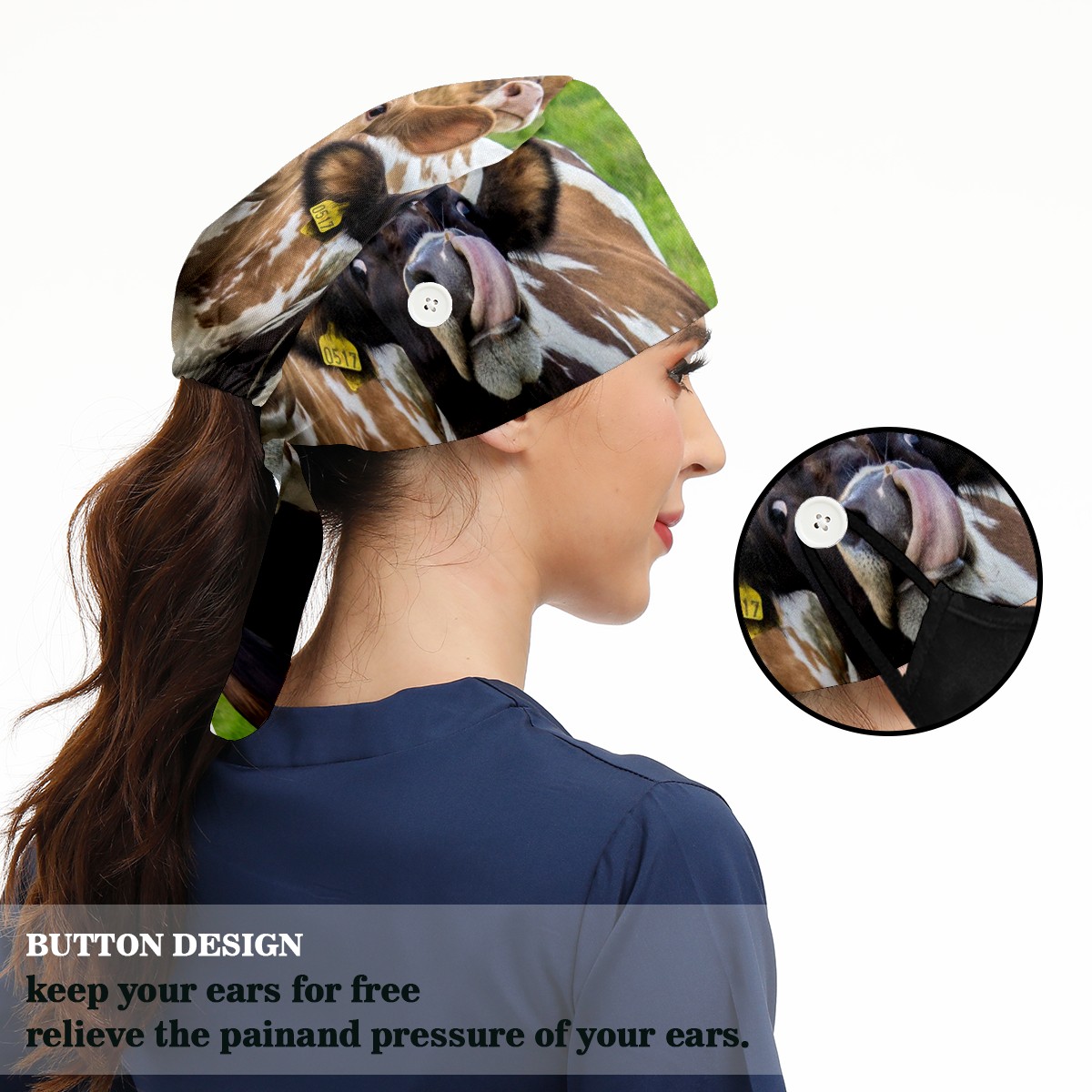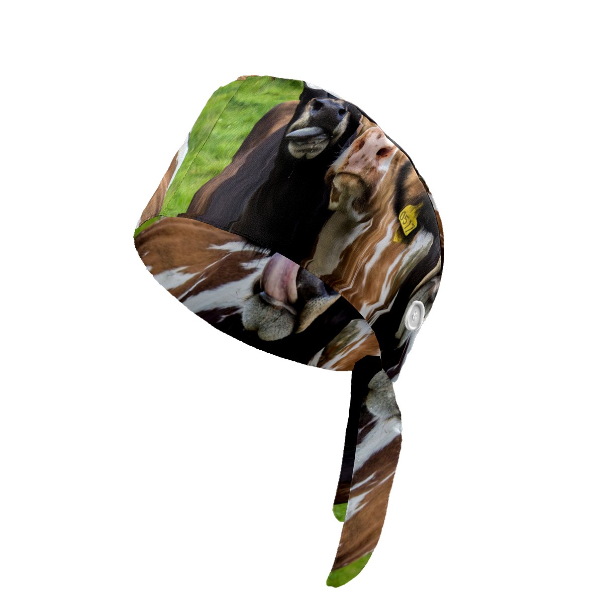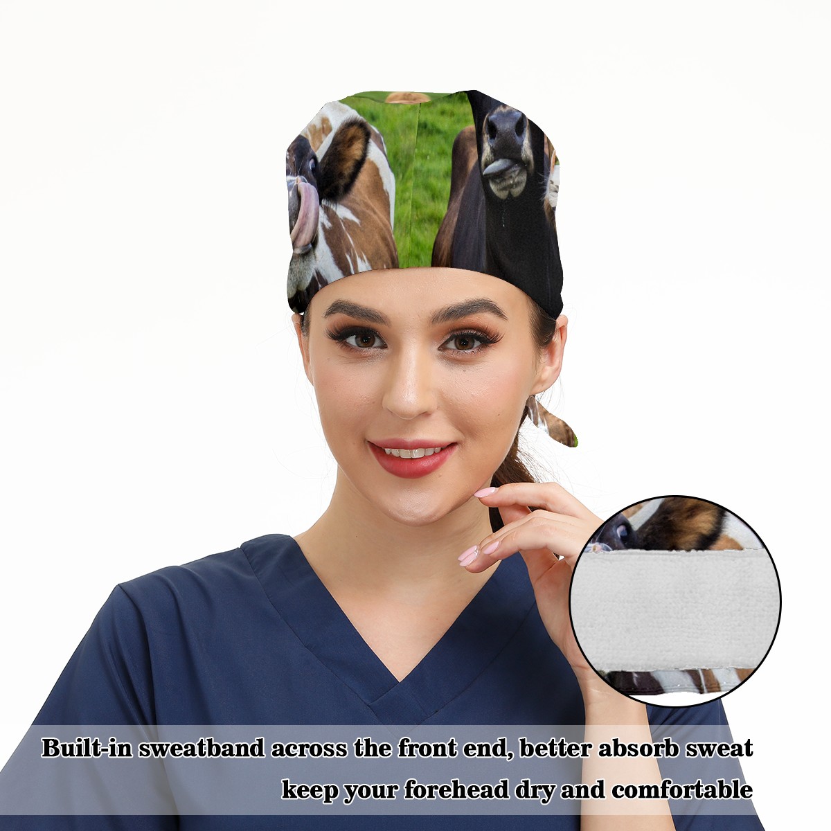 Working Caps with Button & Sweatband Satin Lined Cotton Adjustable Nurse Hats Elastic Band Scrub Cap Surgeon Hat Animal Cows On Green Grassland