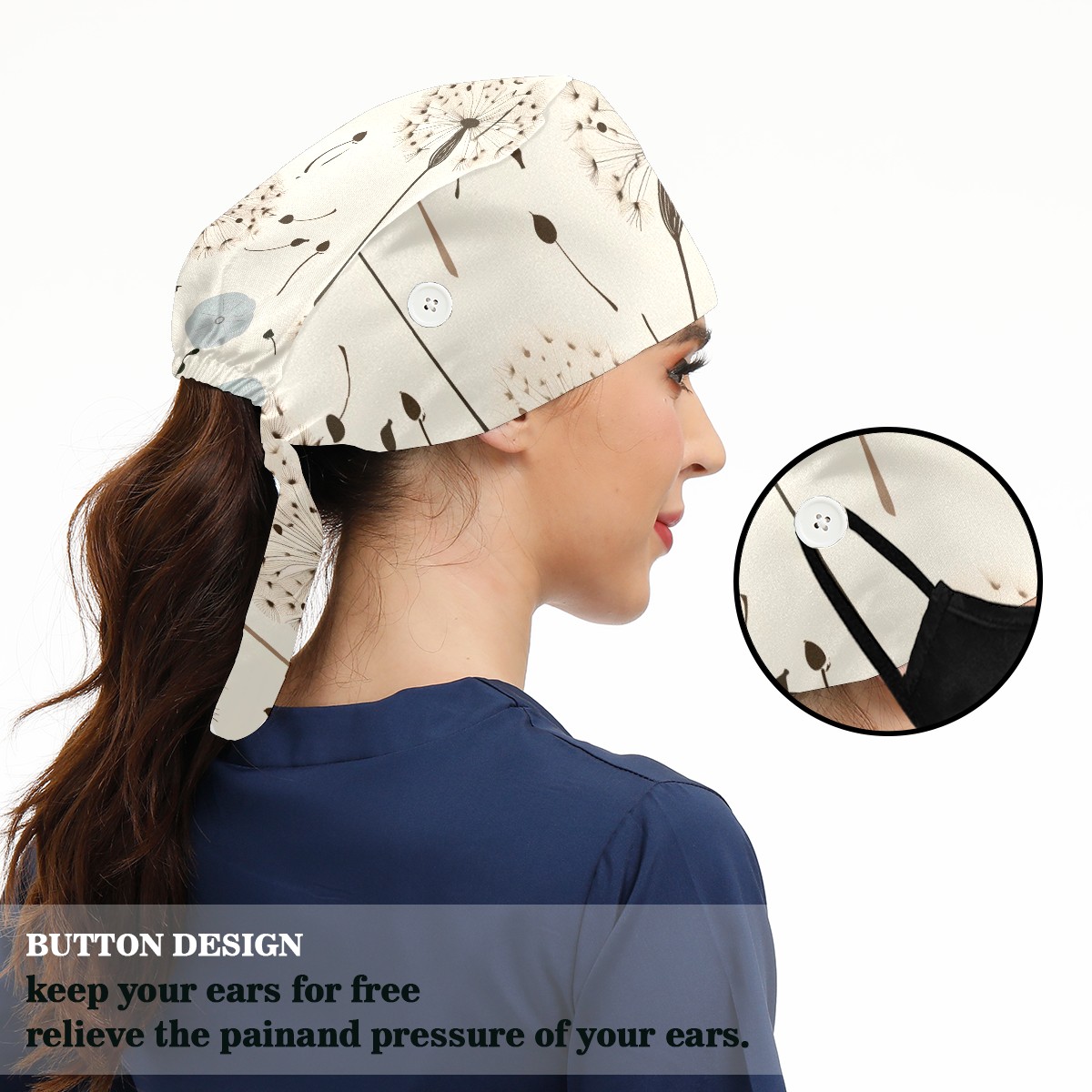 Working Caps with Button & Sweatband Satin Lined Cotton Adjustable Nurse Hats Elastic Band Scrub Cap Surgeon Hat Dandelion