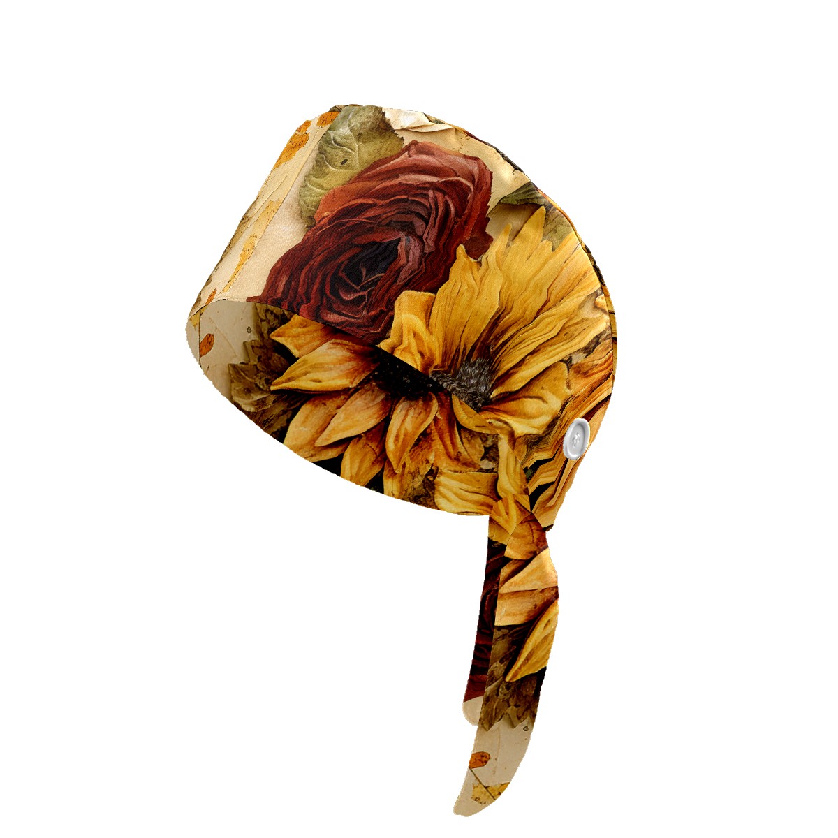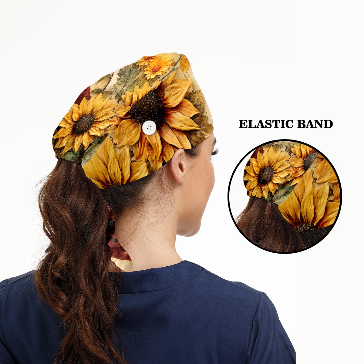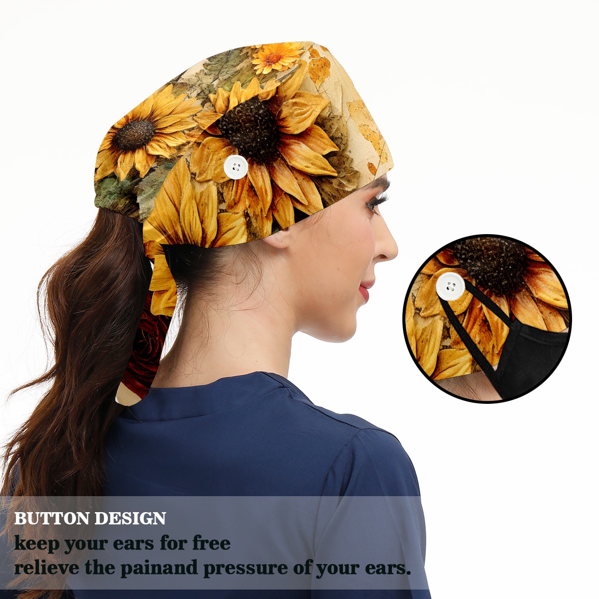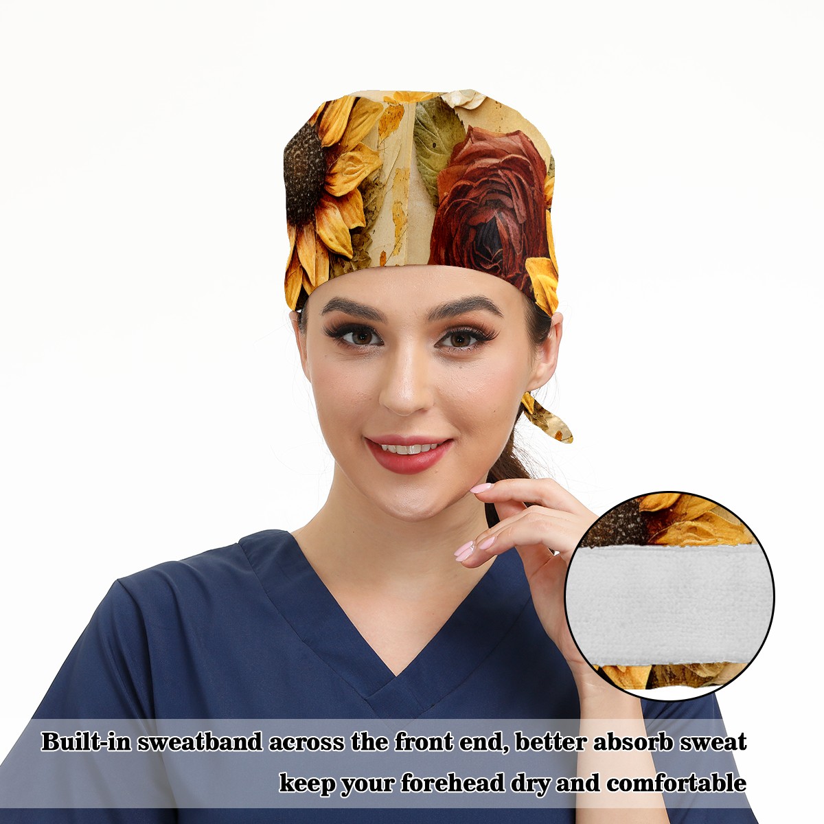 Working Caps with Button & Sweatband Satin Lined Cotton Adjustable Nurse Hats Elastic Band Scrub Cap Surgeon Hat Sunflower