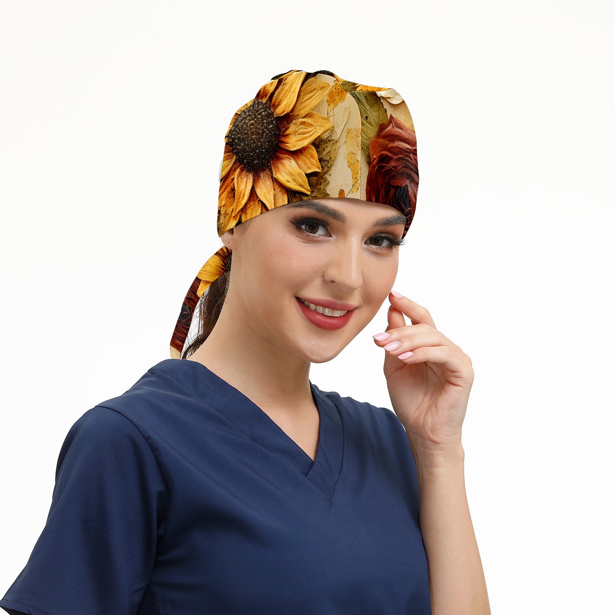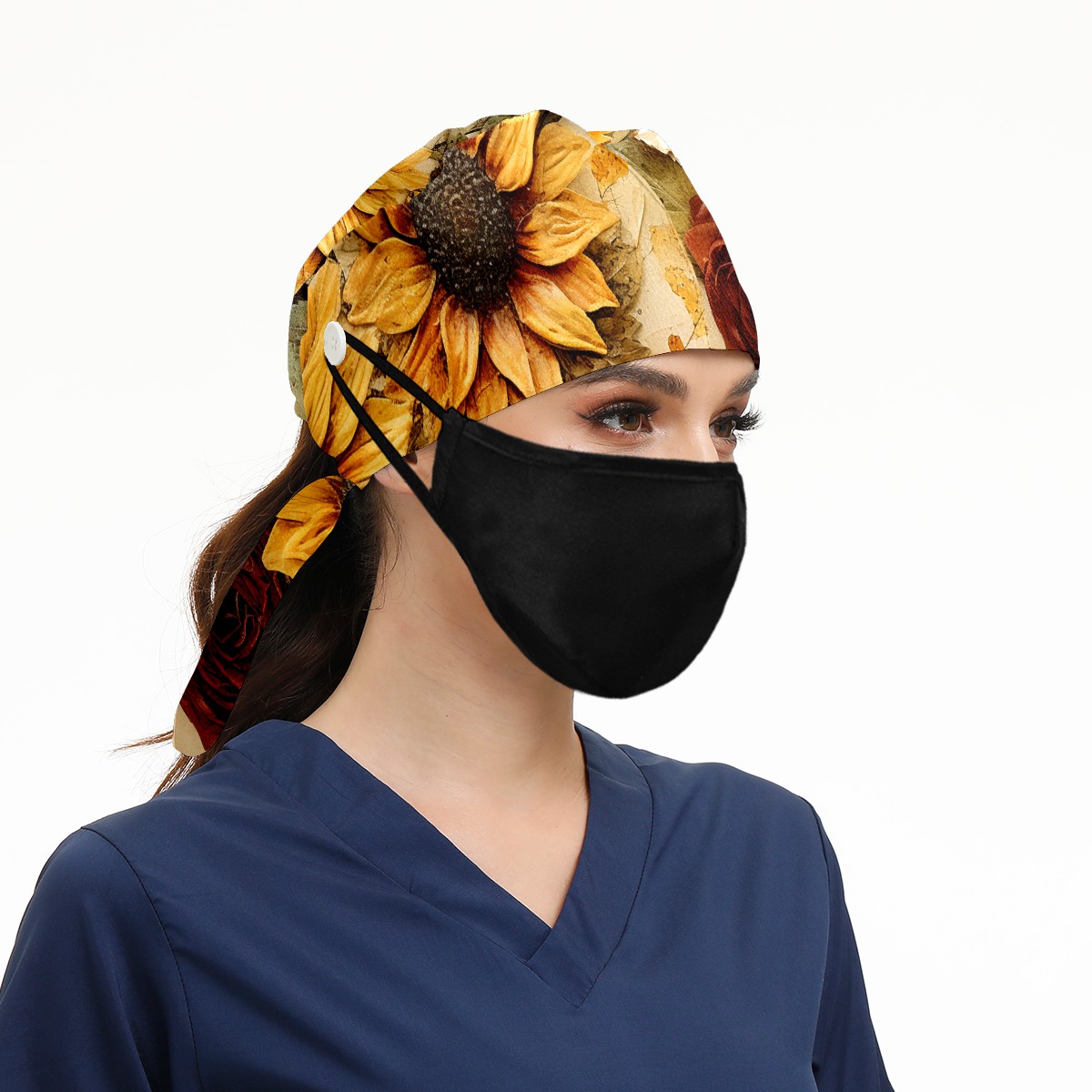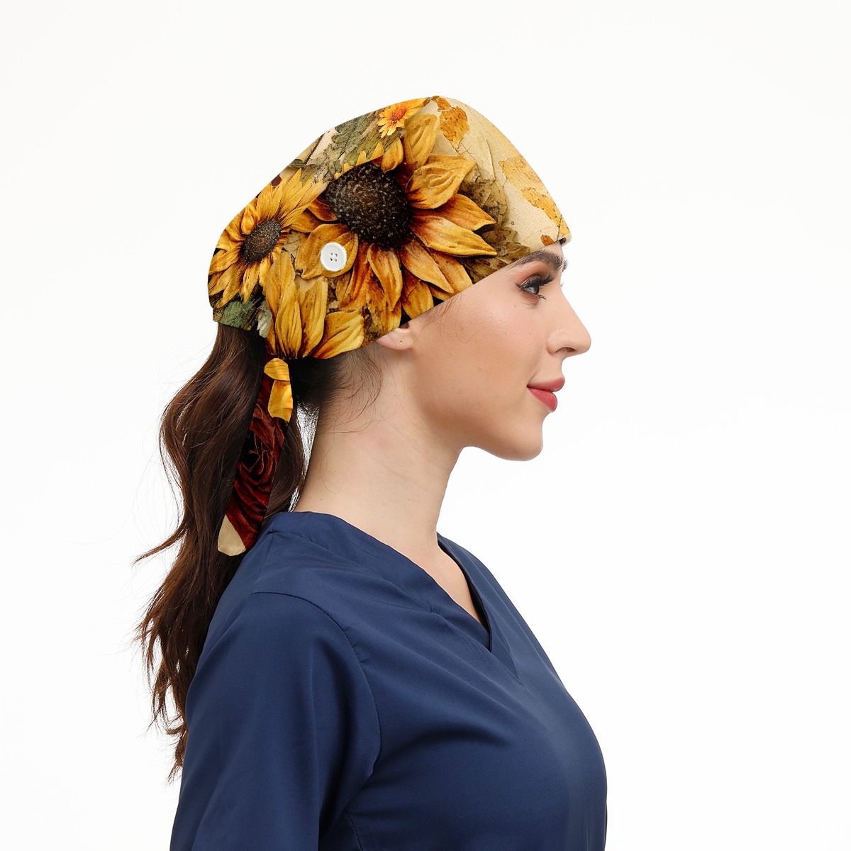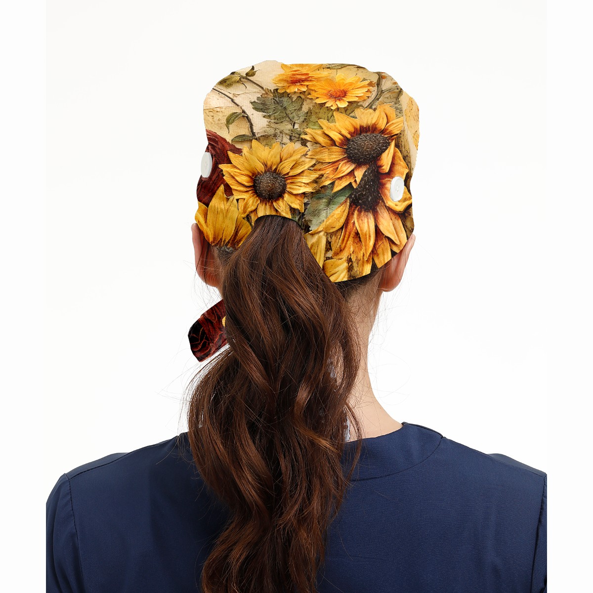 Working Caps with Button & Sweatband Satin Lined Cotton Adjustable Nurse Hats Elastic Band Scrub Cap Surgeon Hat Sunflower