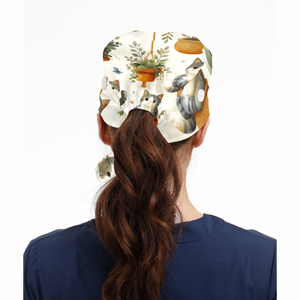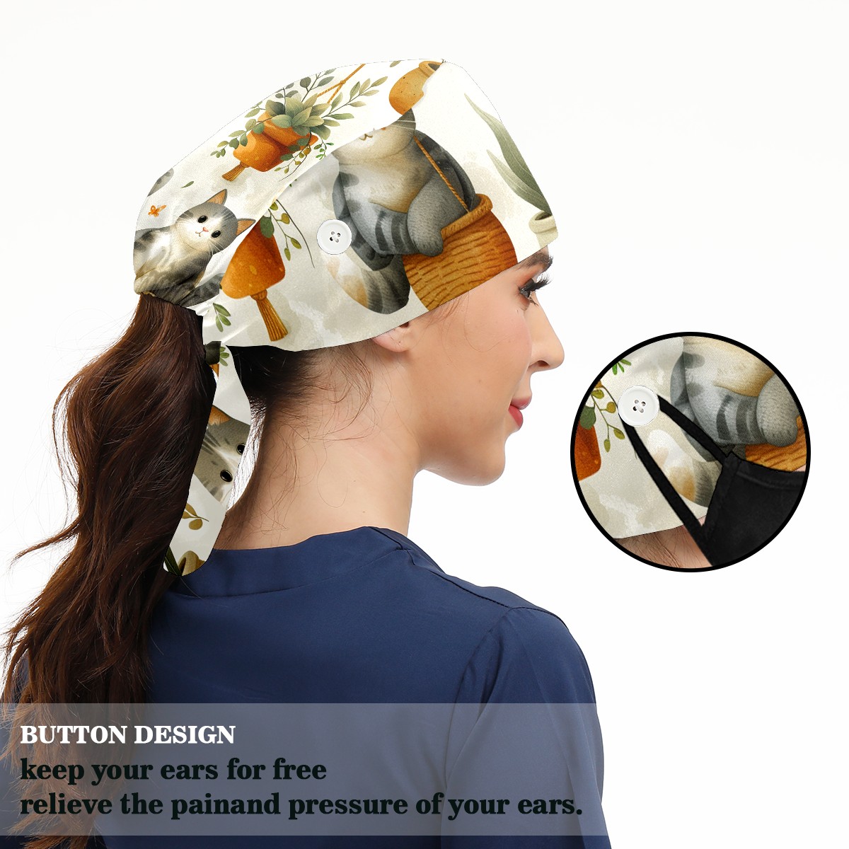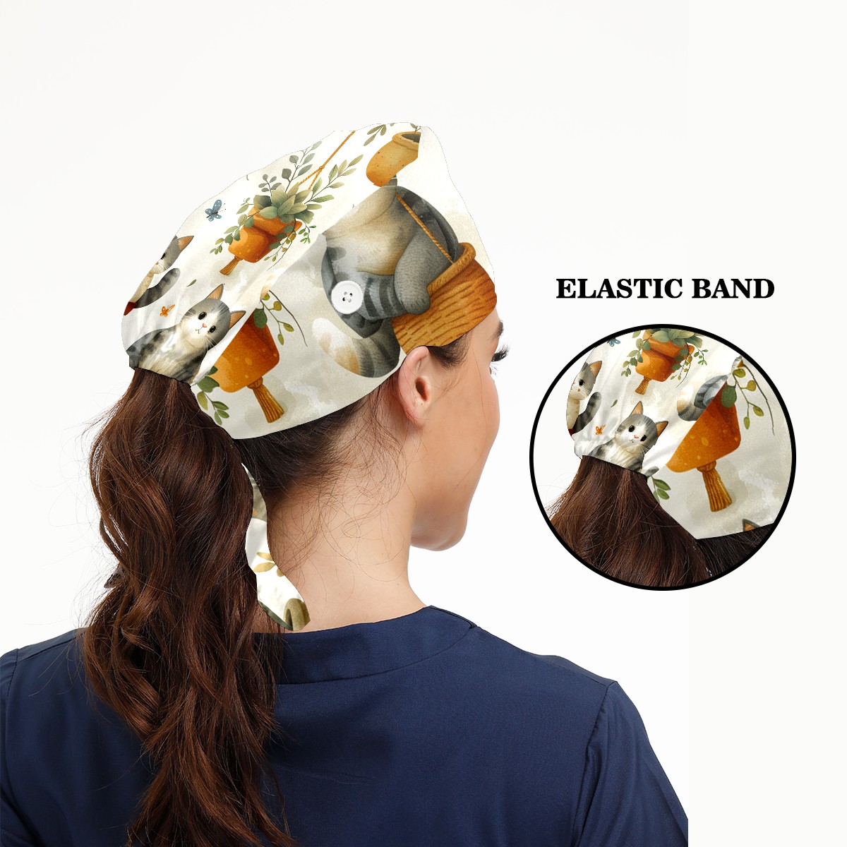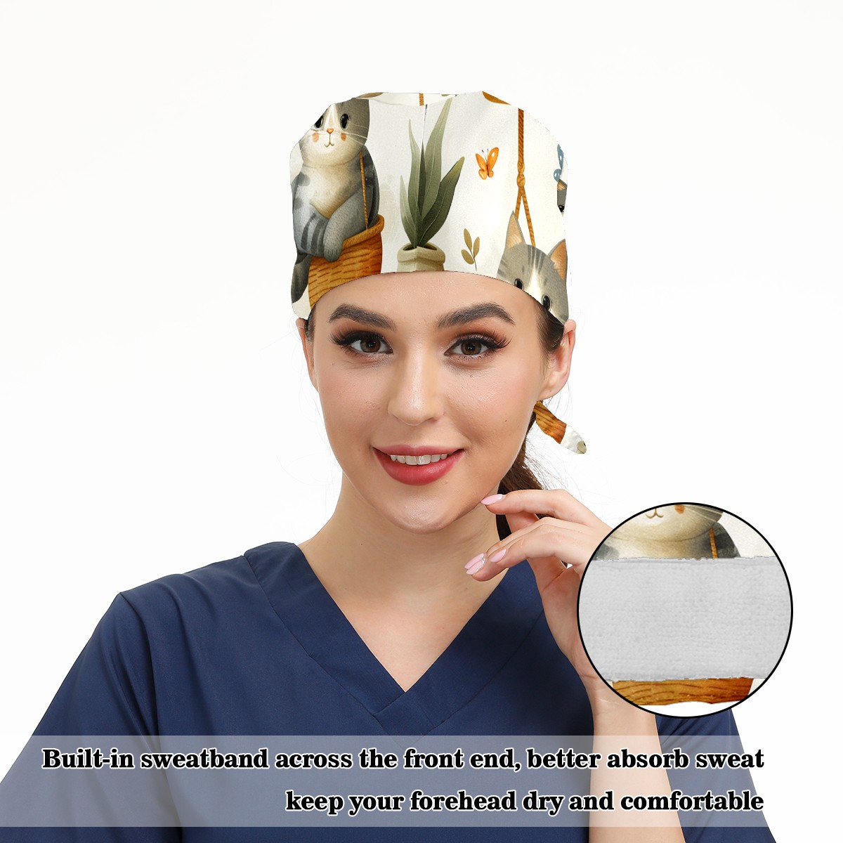 Working Caps with Button & Sweatband Satin Lined Cotton Adjustable Nurse Hats Elastic Band Scrub Cap Surgeon Hat Short Haired Cat